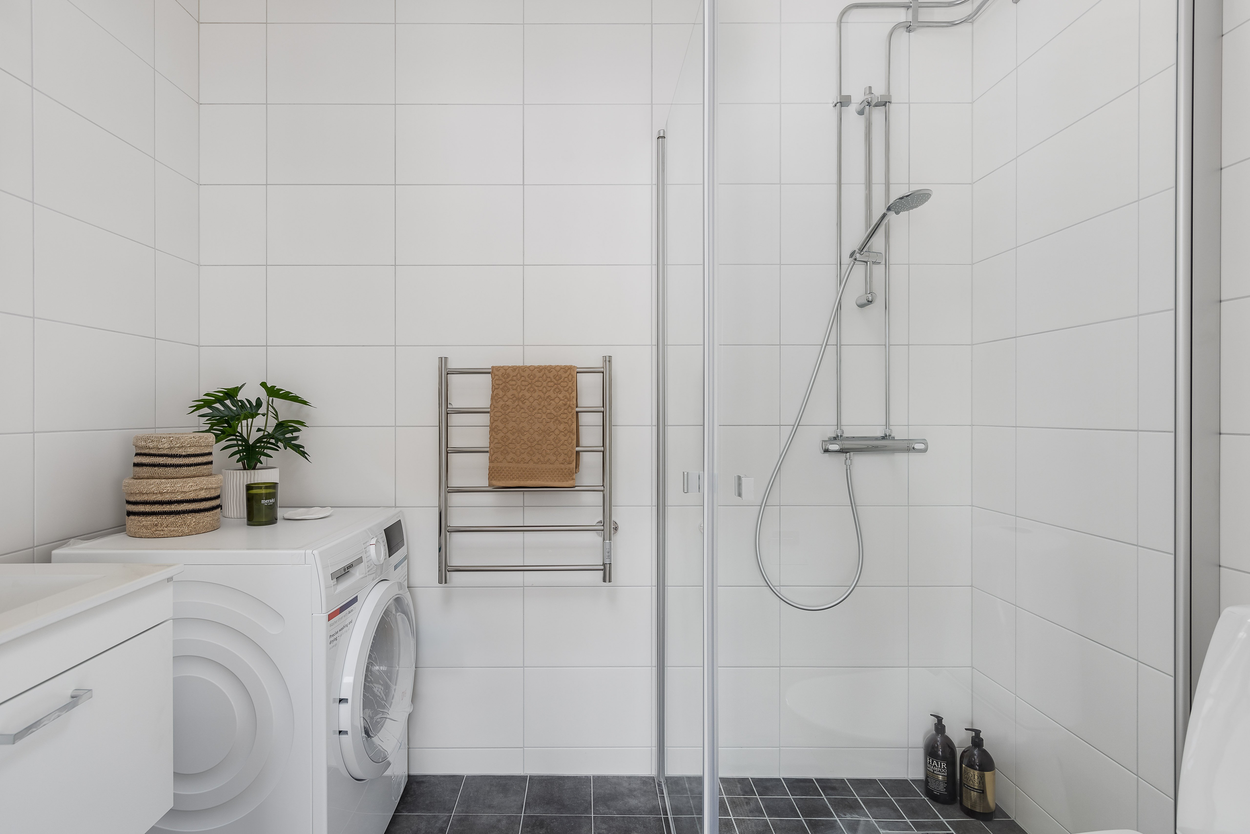 Helkaklade ljusa badrum med tvättmaskin och torktumlare i varje lägenhet. I de minsta lägenheterna är det kombimaskin för att spara plats. Ett extra plus är att man dessutom får en kommod under handfatet. Ingen gemensam tvättstuga, då alla har tvättmöjlighet i sin lägenhet.
