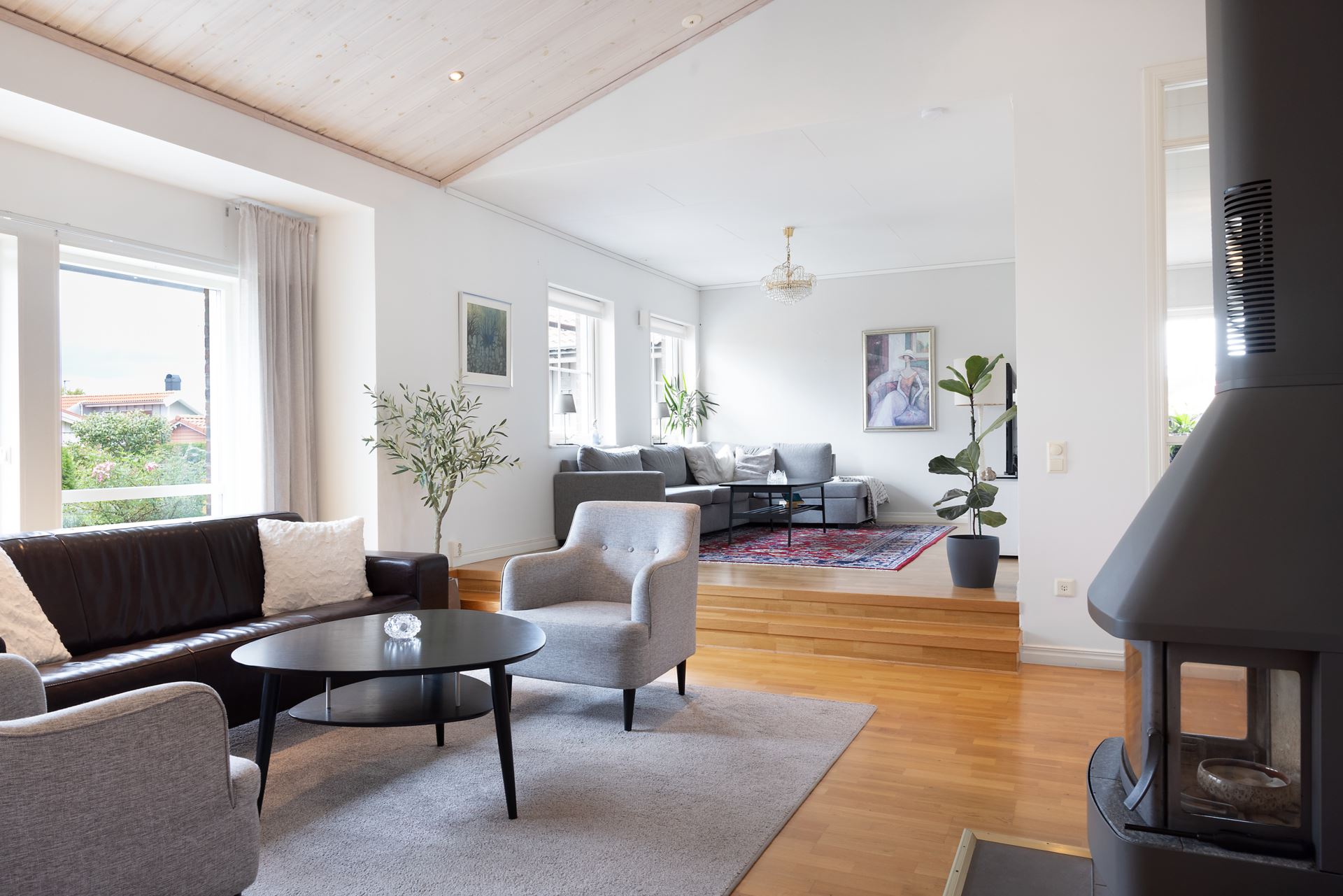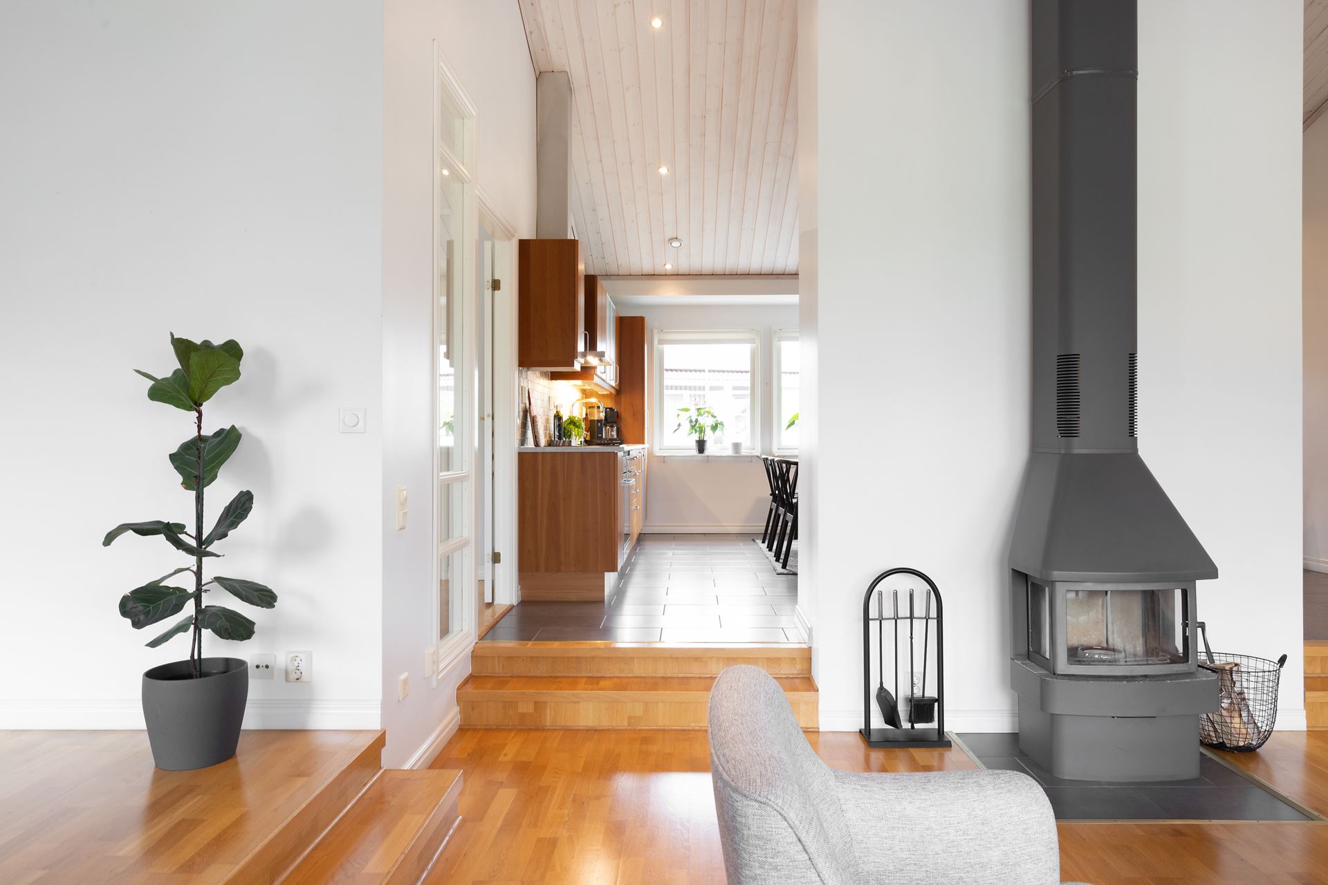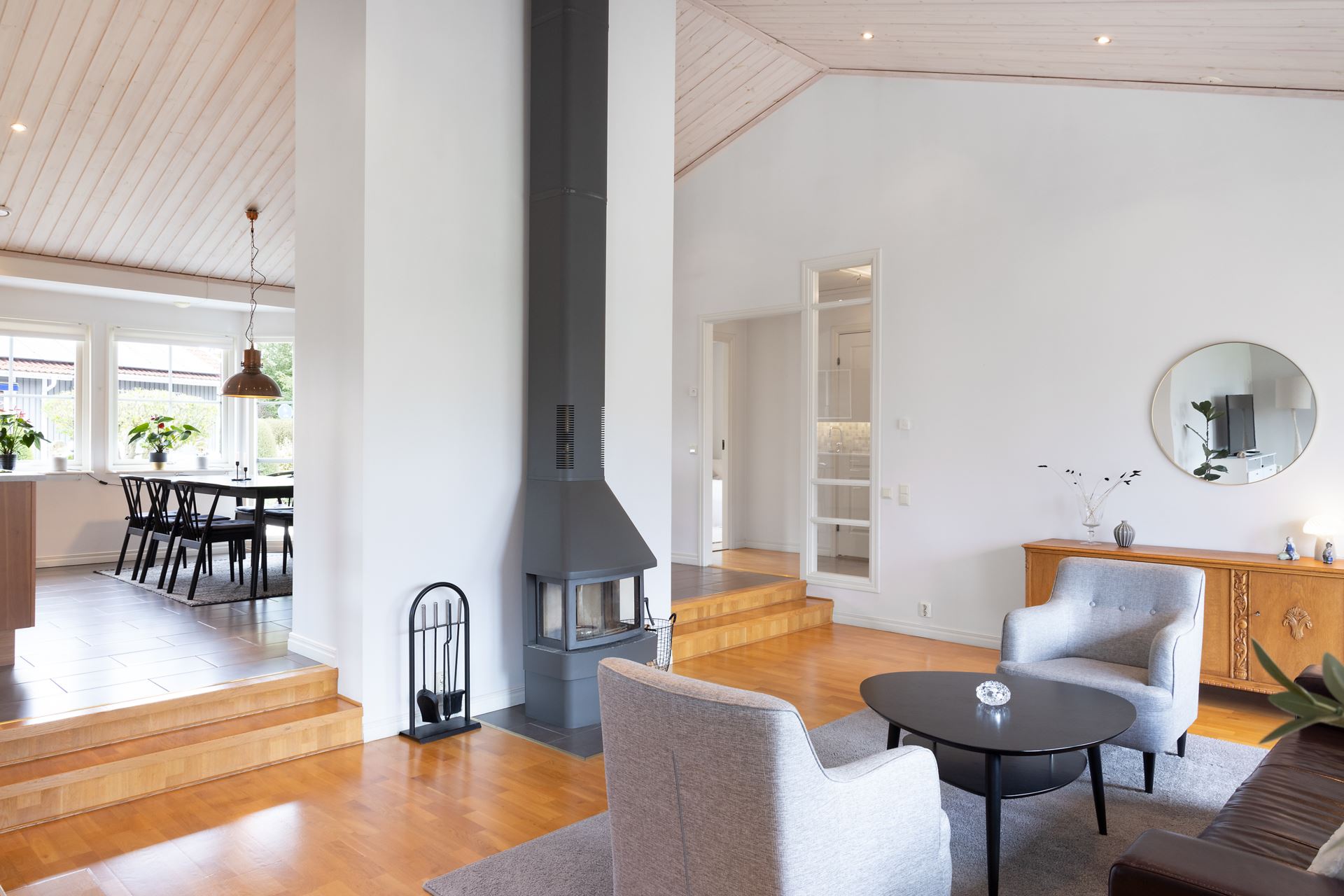 Det nedsänkta vardagsrummet bjuder på en härlig rymd och en arkitektur som sticker ut. Från både kök och matrum leder en mjuk nivåskillnad ner till rummet där ekparketten samspelar med vita väggar och ett ryggåstak klätt i träpanel med infällda spotlights. Den centralt placerade braskaminen blir hemmets hjärta och skänker både värme och atmosfär. Genom burspråkets strålande fönsterpartier flödar ljuset in och suddar ut gränsen mellan inne och ute. Härifrån öppnar den helglasade dörren upp mot uteplatsen och trädgårdens lummiga sida.