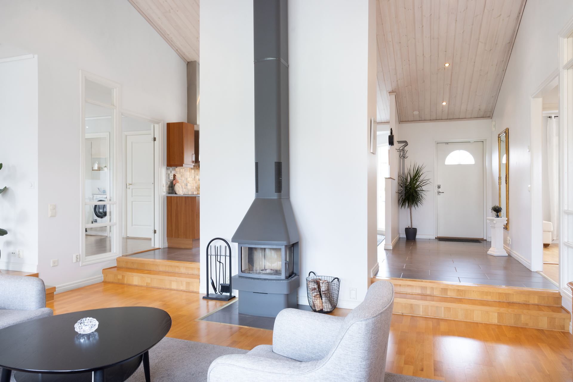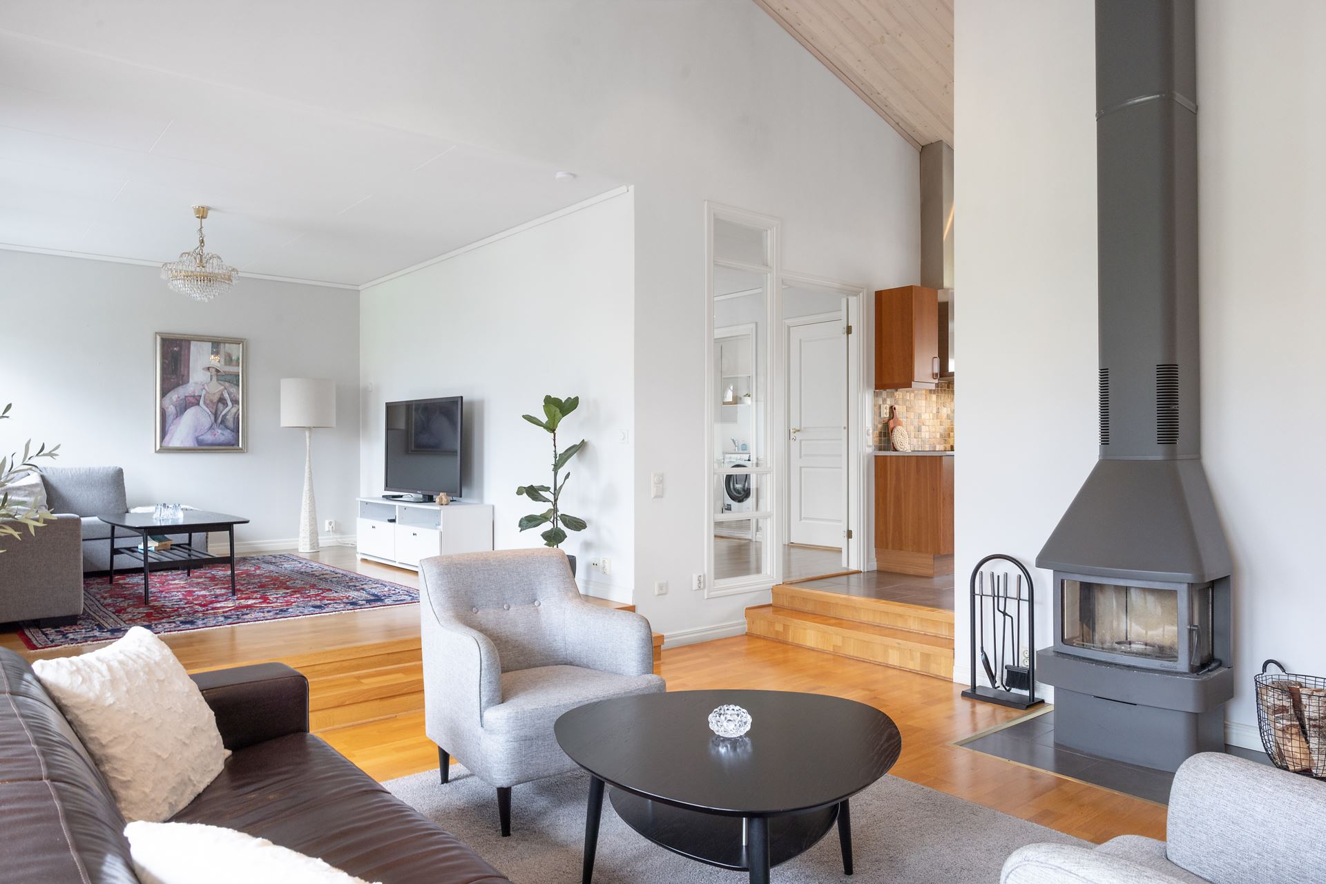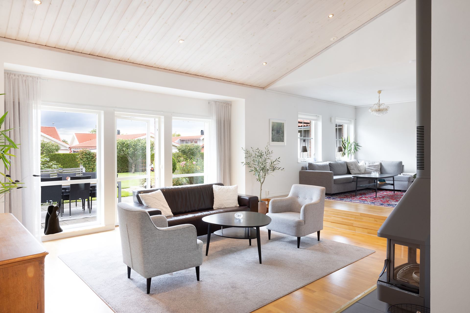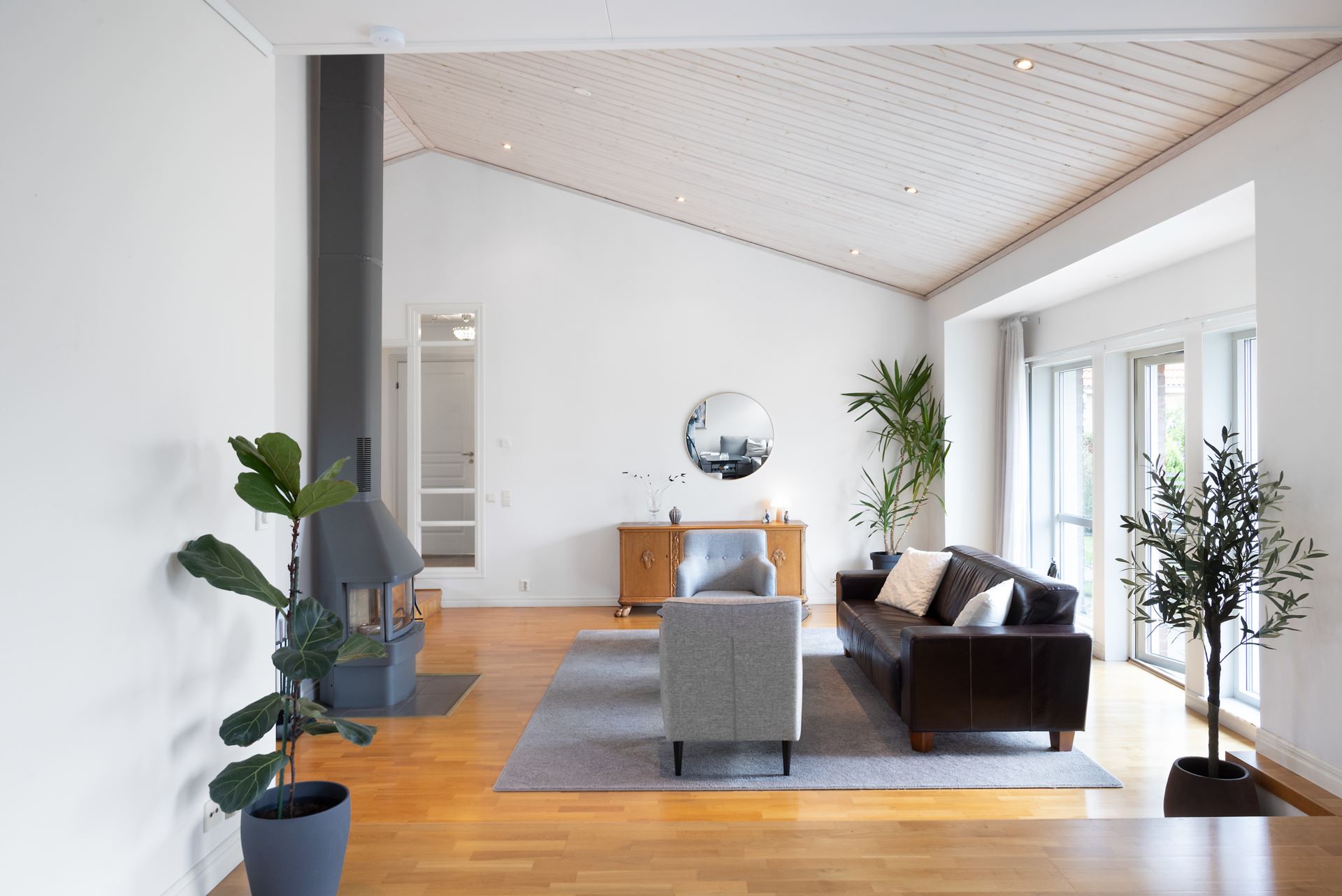Det nedsänkta vardagsrummet bjuder på en härlig rymd och en arkitektur som sticker ut. Från både kök och matrum leder en mjuk nivåskillnad ner till rummet där ekparketten samspelar med vita väggar och ett ryggåstak klätt i träpanel med infällda spotlights. Den centralt placerade braskaminen blir hemmets hjärta och skänker både värme och atmosfär. Genom burspråkets strålande fönsterpartier flödar ljuset in och suddar ut gränsen mellan inne och ute. Härifrån öppnar den helglasade dörren upp mot uteplatsen och trädgårdens lummiga sida.