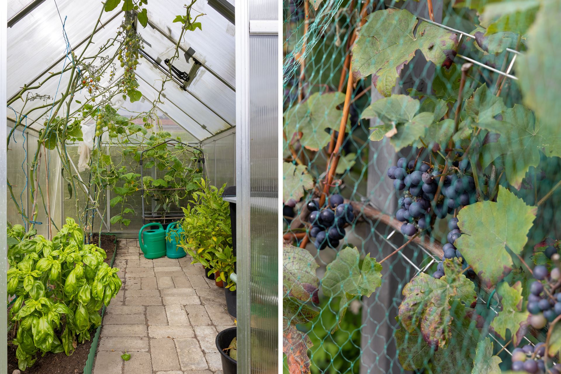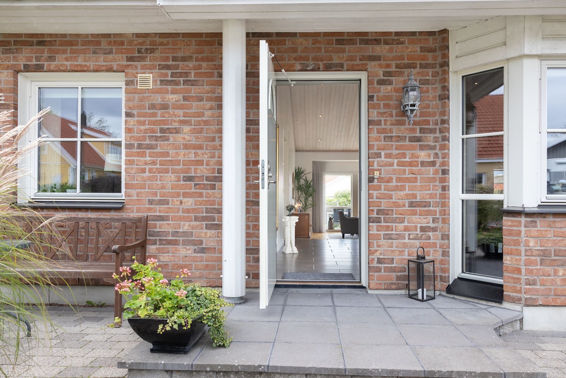 Ute väntar en välskött trädgård som inbjuder till både avkoppling och aktivitet. Den stenlagda uteplatsen rymmer loungemöbler och grill, medan stora grönytor, växthus, pallkragar och planteringar erbjuder plats för odling, lek och gemenskap. Här får du ett hem där modern elegans, familjeliv och trädgårdsliv smälter samman i perfekt harmoni.