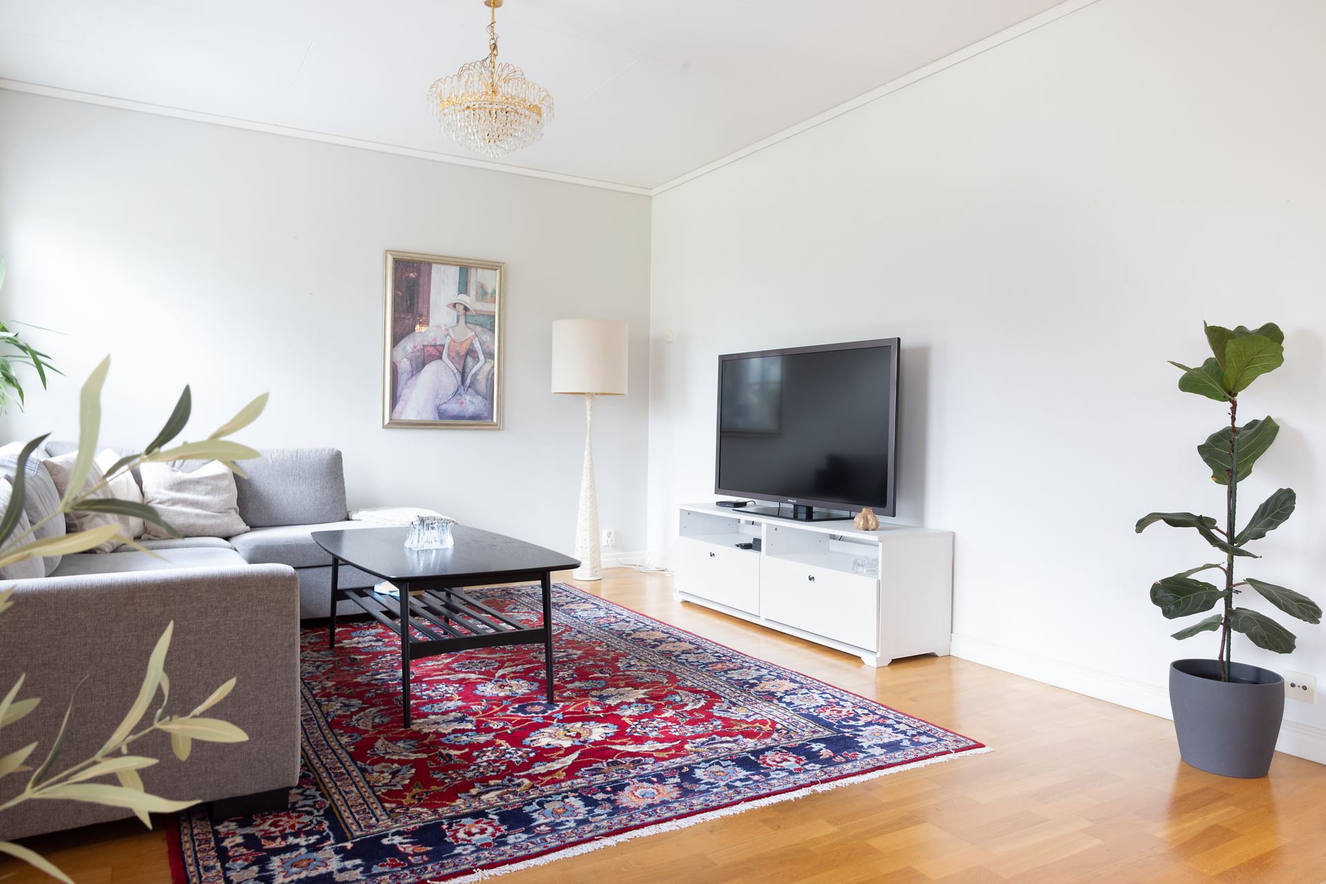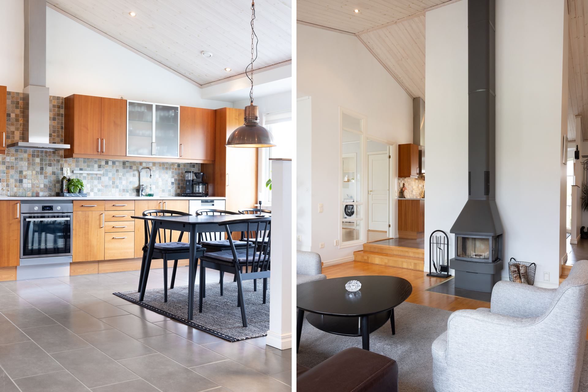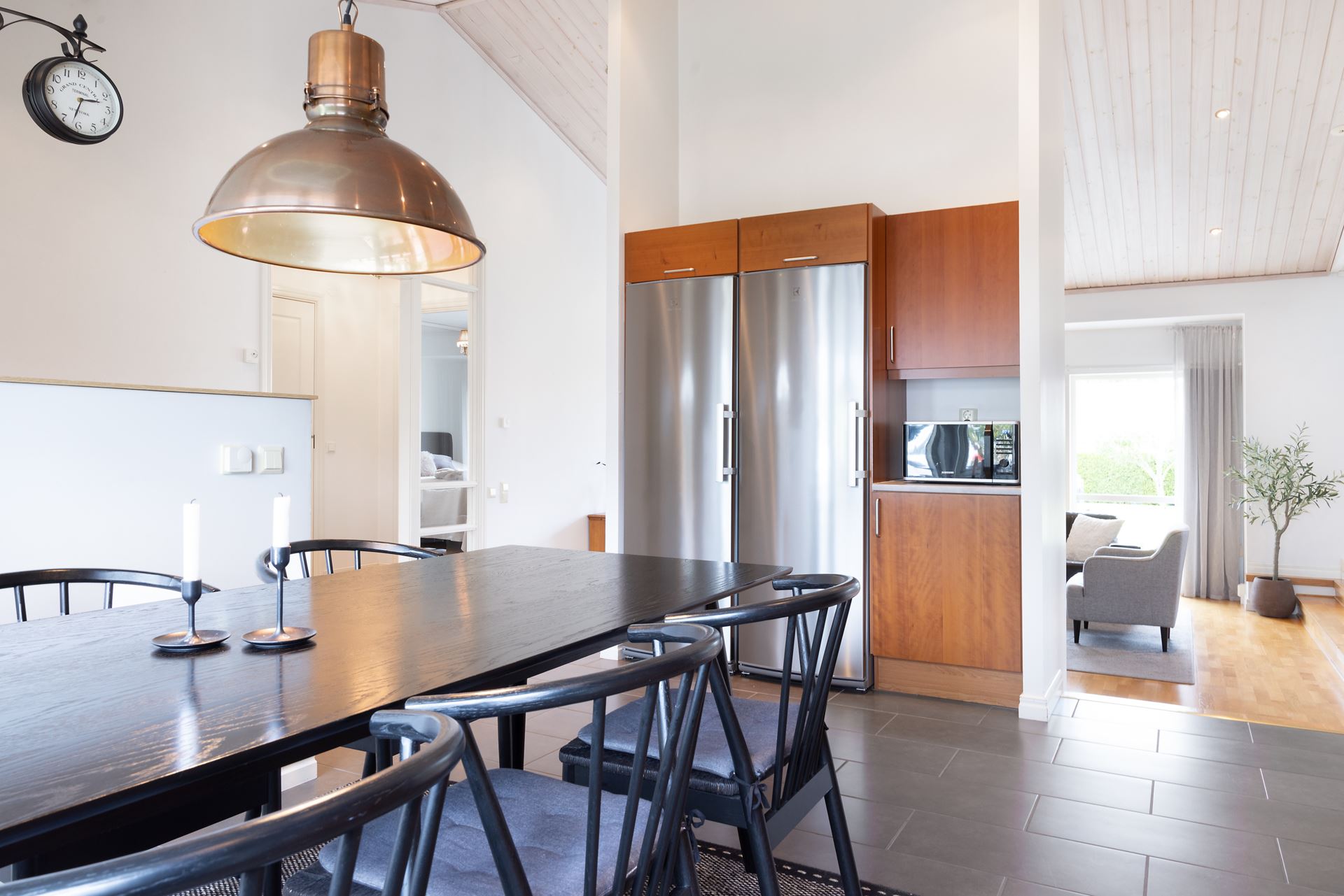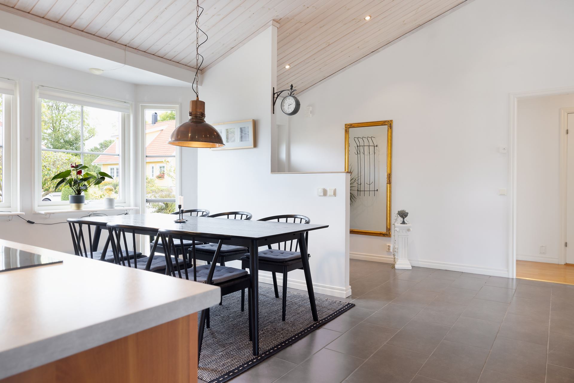 Det stora köket är hjärtat i hemmet, fullt utrustat och med generösa ytor för både vardagsmåltider och festliga tillfällen. Idag erbjuder hemmet tre rymliga sovrum samt två stilfulla helkaklade badrum. Separat tvättstuga med groventré underlättar vardagens praktiska moment.