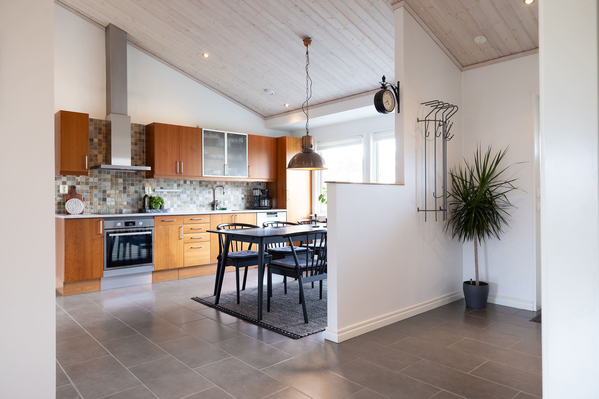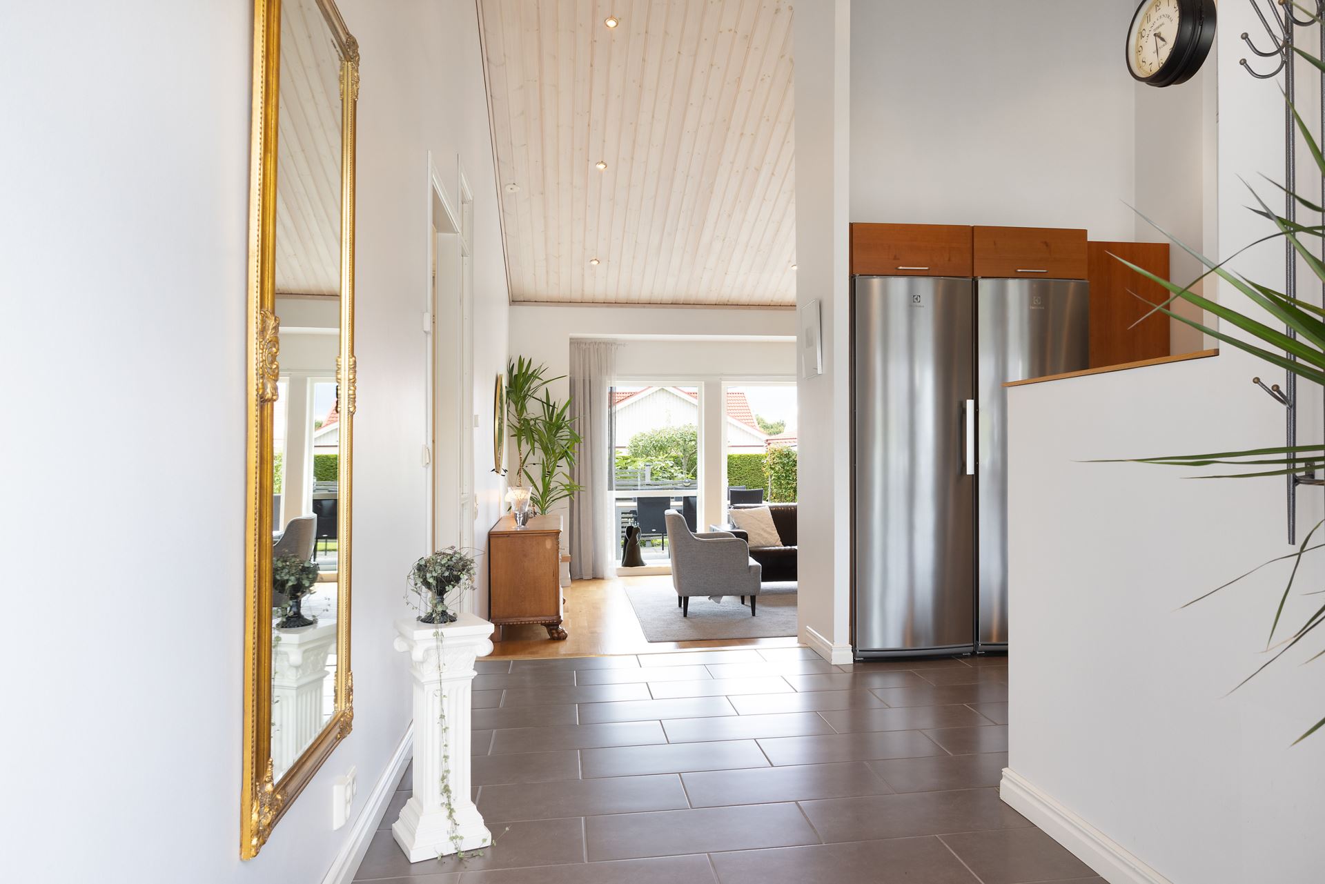 Hallen välkomnar med stilrent grått klinkergolv och vita väggar som ger en ljus och luftig känsla. Här finns praktiska avhängningsmöjligheter och en öppen koppling mot köket. Den generösa takhöjden, öppet ända upp i nock, tillsammans med träpanel i tak och infällda spotlights skapar en inbjudande och modern atmosfär.