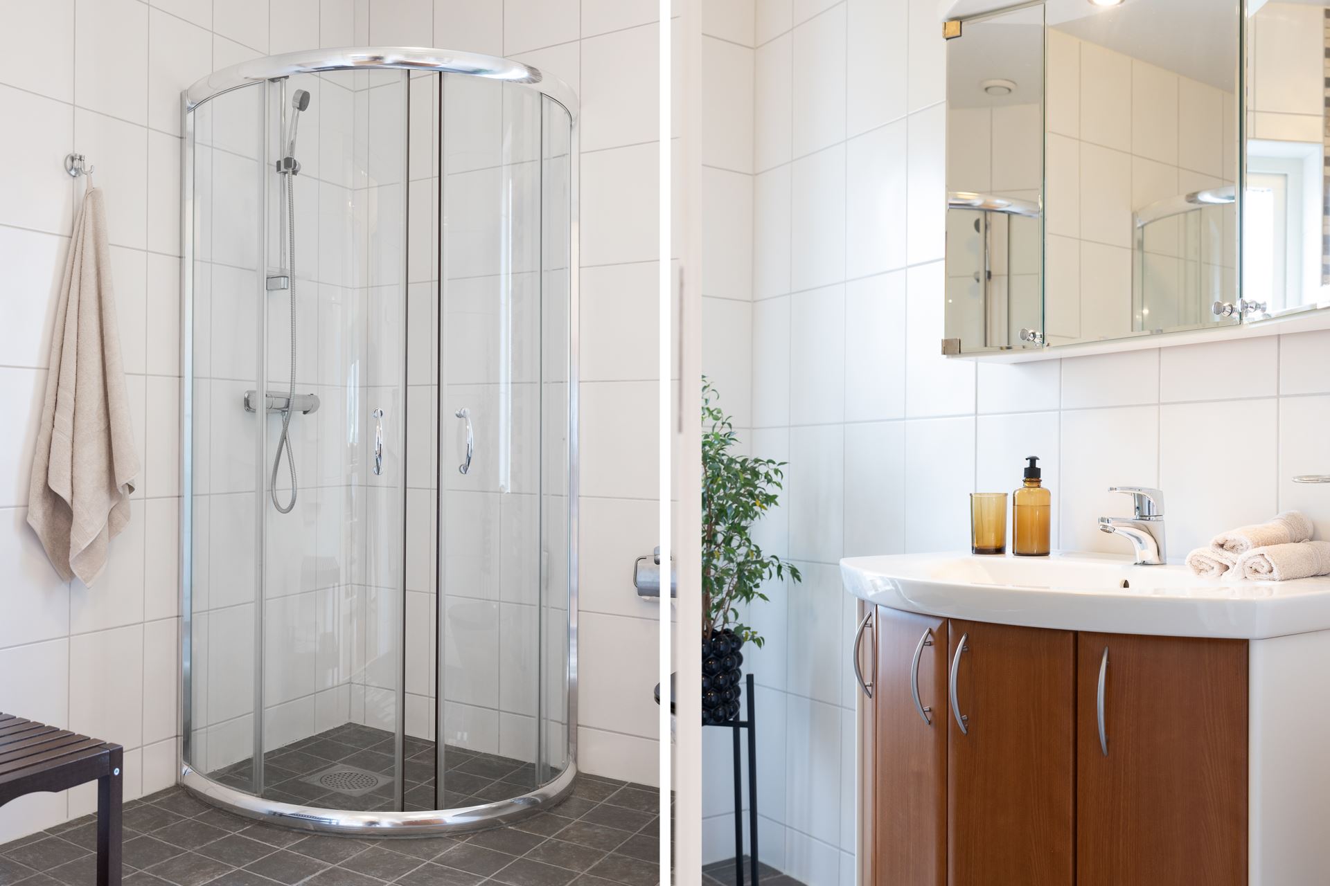 Badrummet ligger i anslutning till de båda sovrummen och är helkaklat med brungrå klinker på golvet och vita kaklade väggar, kompletterat med en fondvägg i ton med golvet som skapar ett harmoniskt uttryck. Fönstret släpper in behagligt ljus utan att kompromissa med integriteten. Badrummet är utrustat med wc, handfat med kommod från Vedum, spegelskåp och dusch med karglasdörrar.