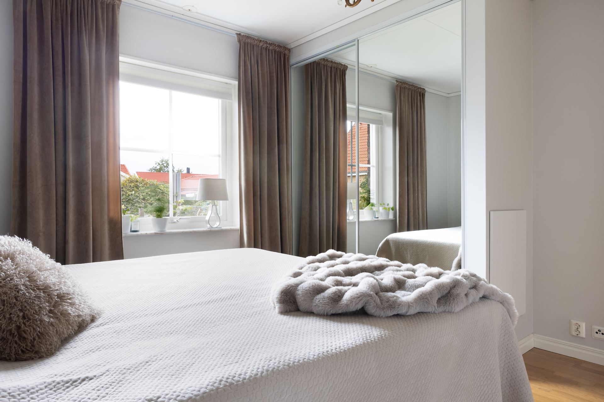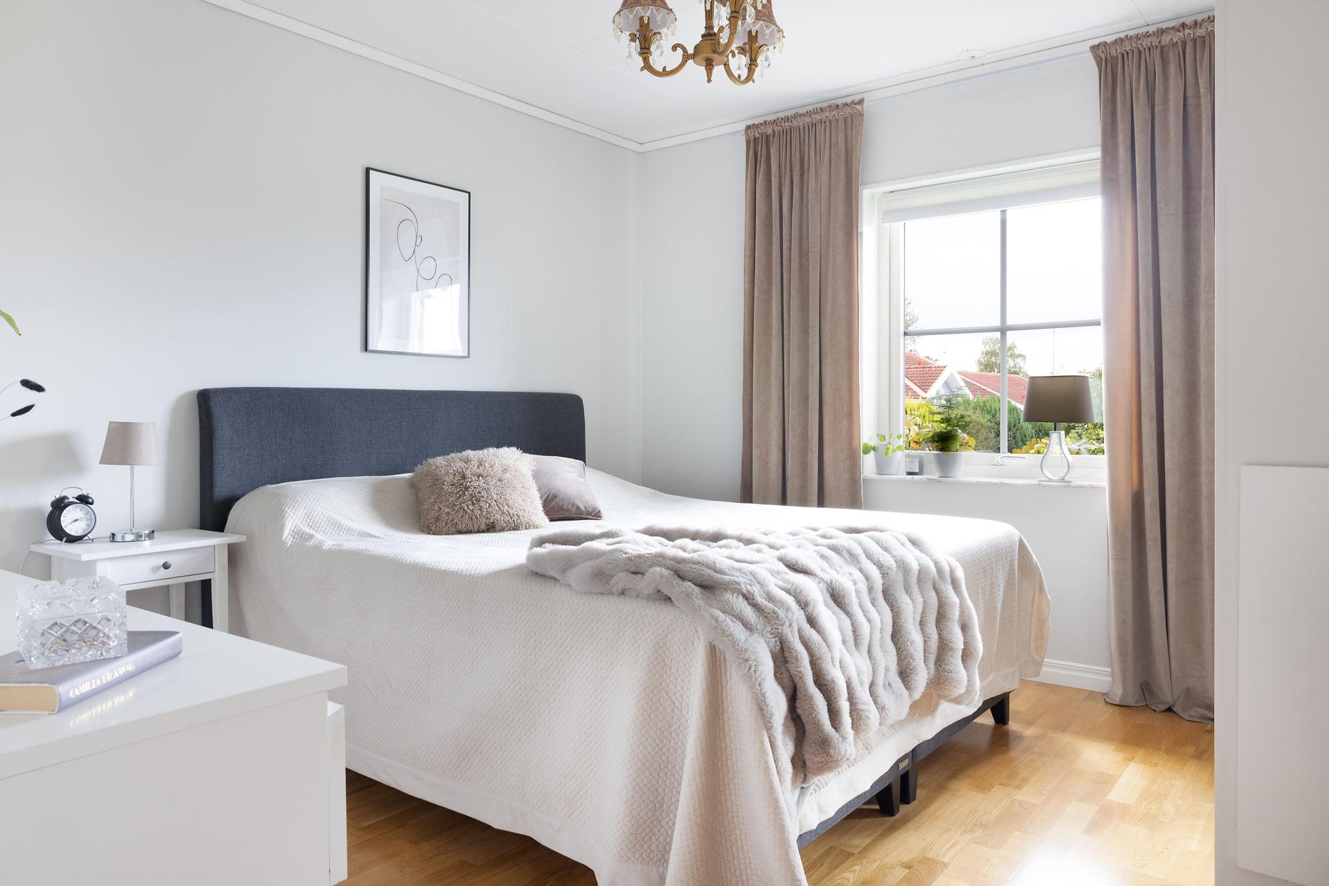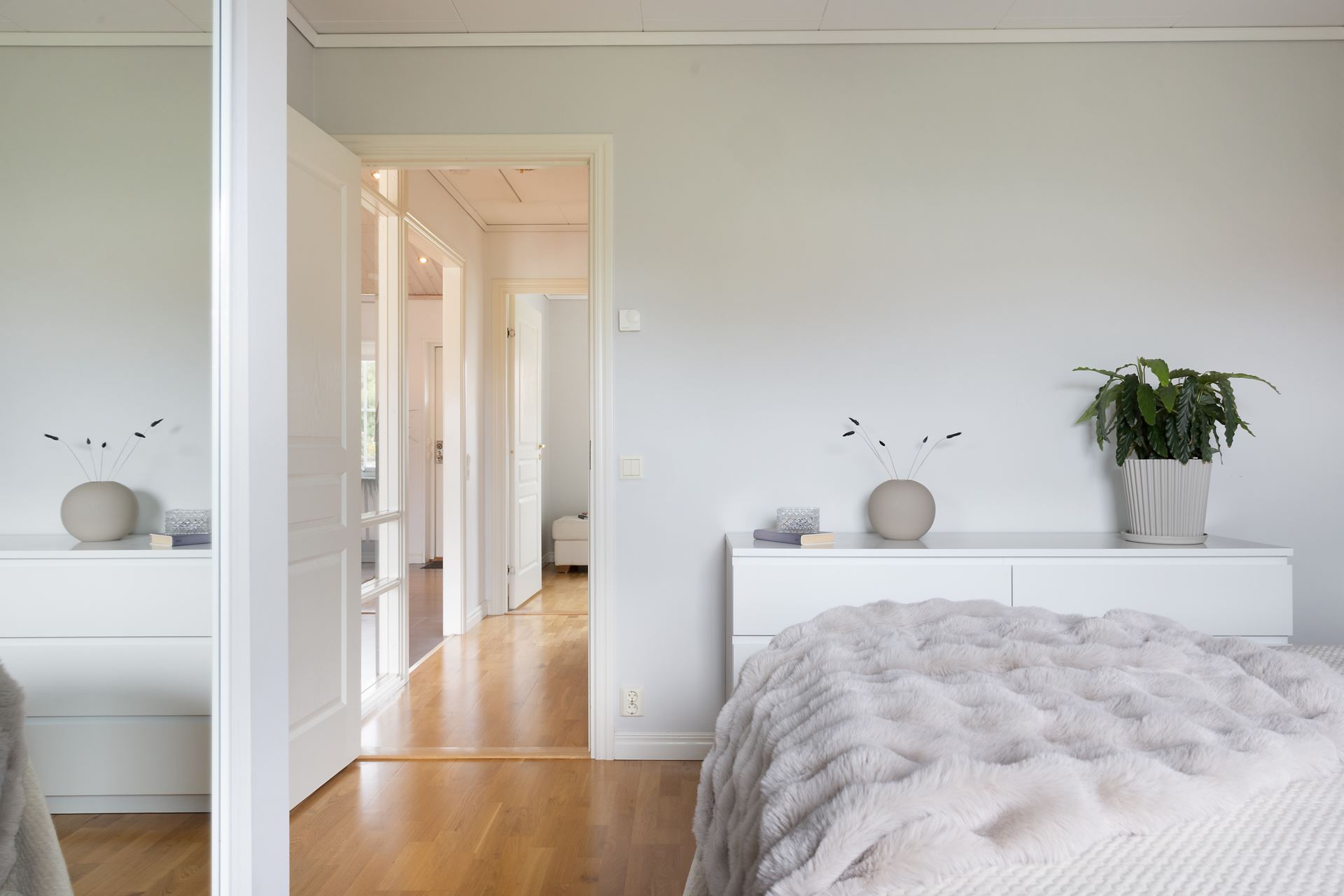 Det första sovrummet välkomnar med varm ekparkett och väggar i ljust tonade nyanser som tillsammans med fönstret fyller rummet med ett mjukt, naturligt ljus. Här finns gott om plats för både dubbelsäng och tillhörande möblemang och den smarta skjutdörrsgarderoben med spegel erbjuder praktisk förvaring.