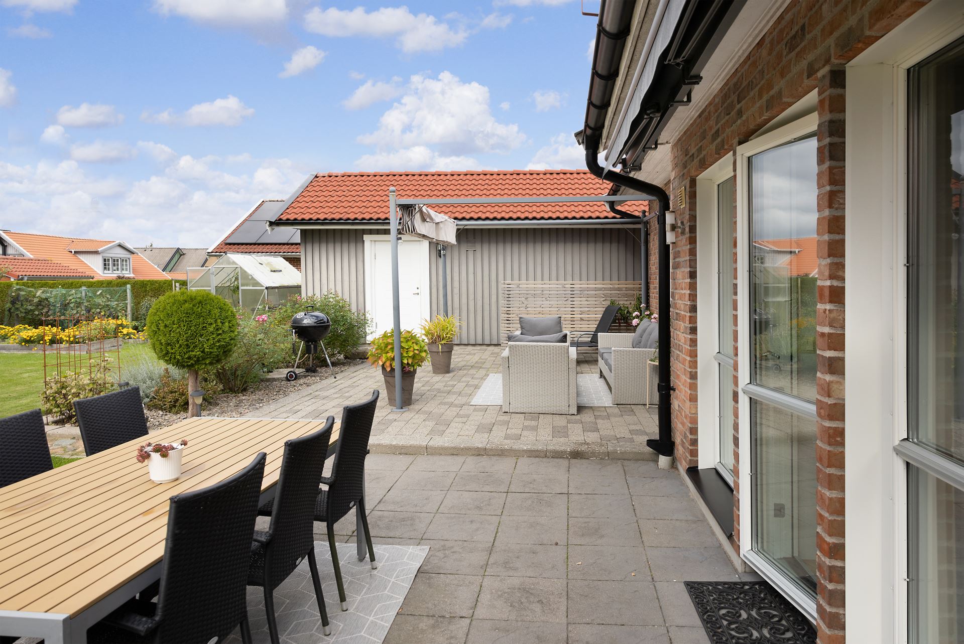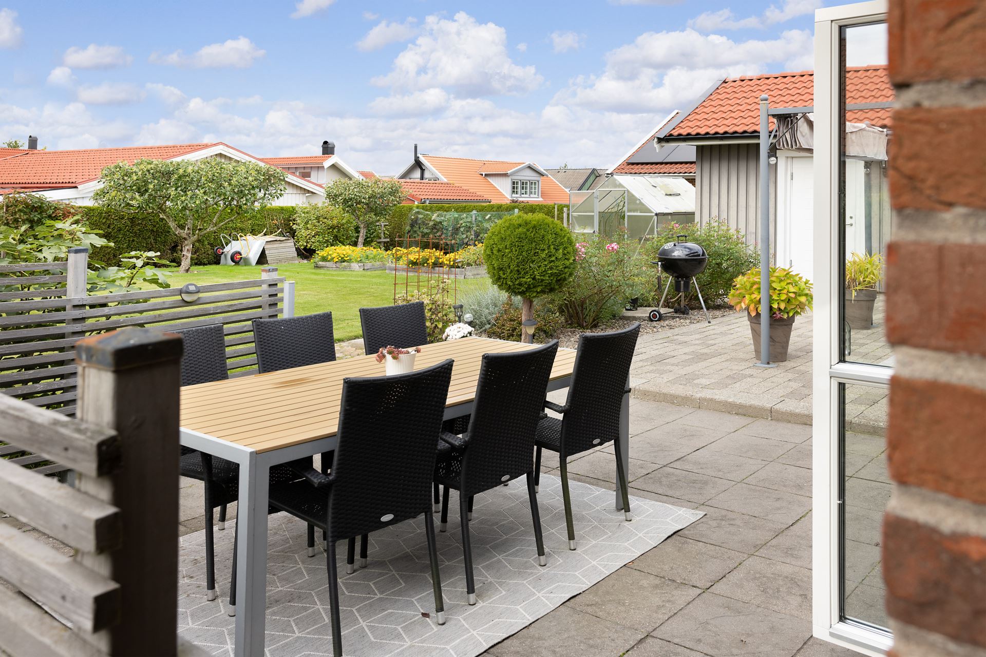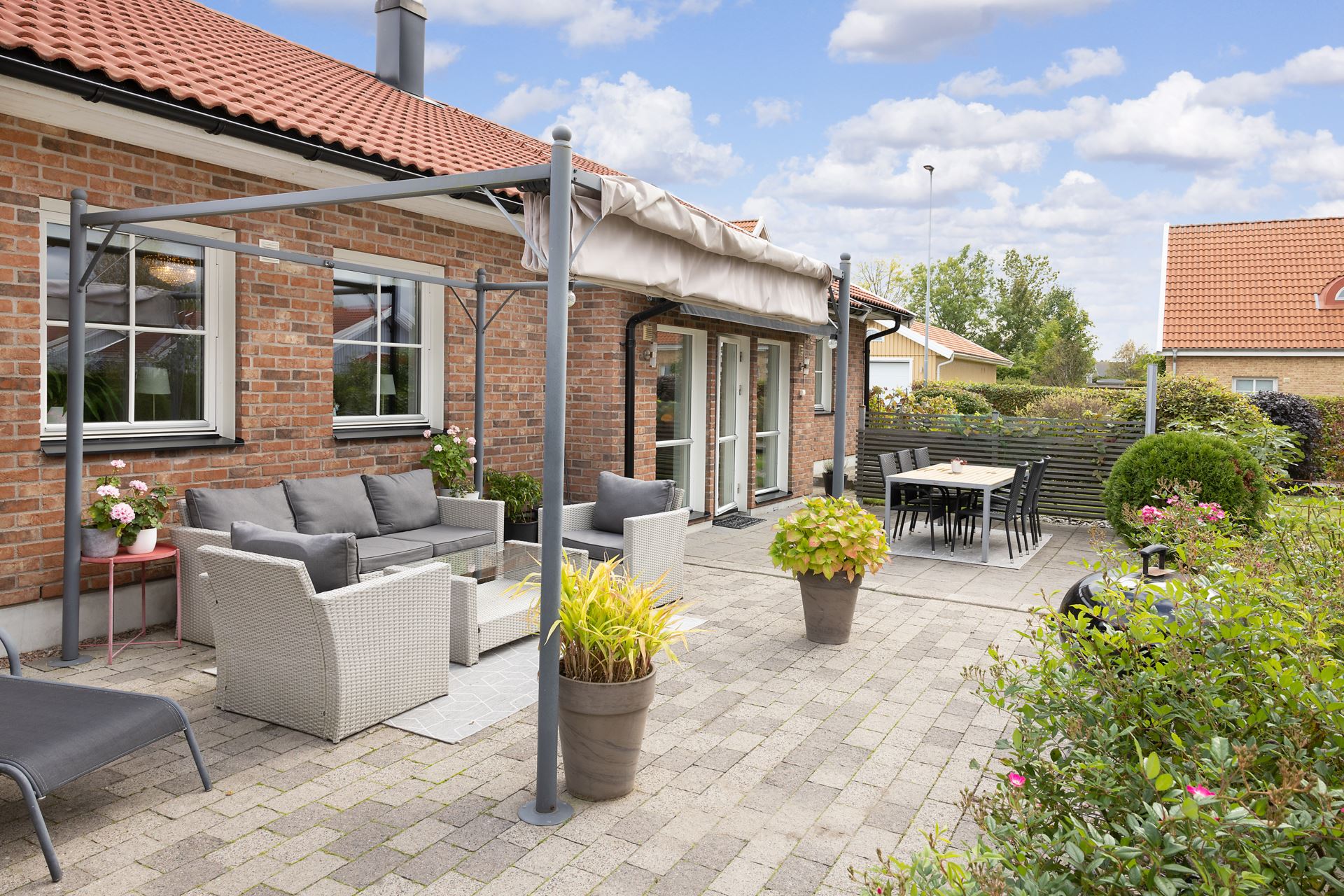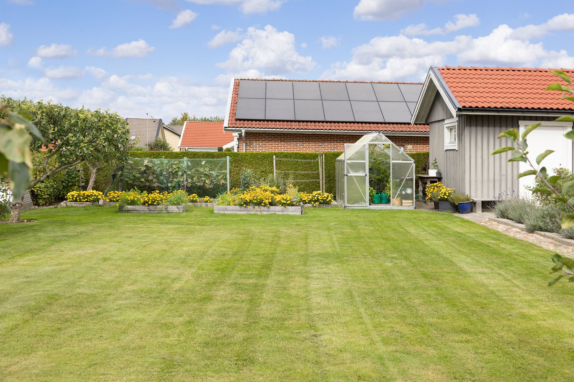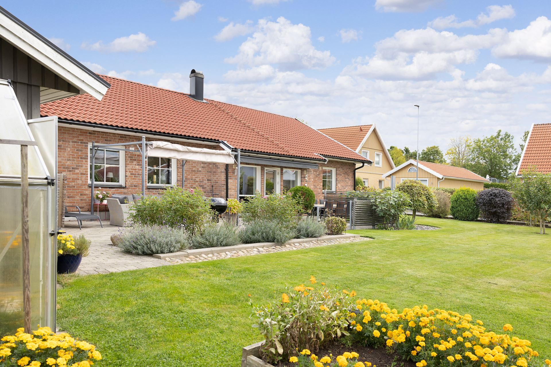 Trädgården är en grön oas med välskötta och prunkande planteringar och generös gräsmatta som skapar liv och färg under hela säsongen. Växthus och pallkragar ger möjlighet till egen odling och en uppvuxen häck ger ett naturligt insynsskydd. Den stora stenlagda uteplatsen bjuder in till samvaro, grillkvällar och lugna stunder i solen. Perfekt för både avkoppling och umgänge