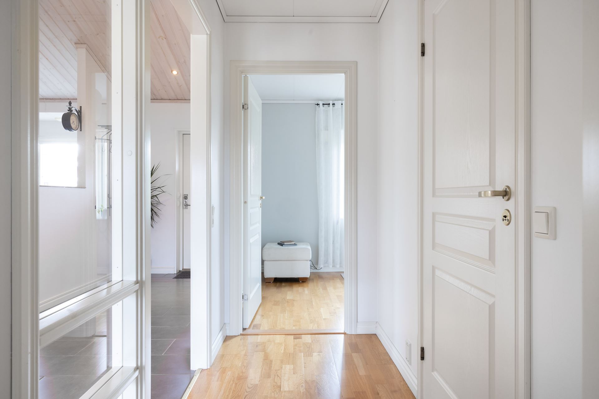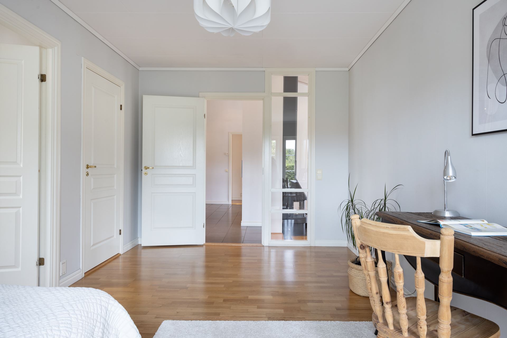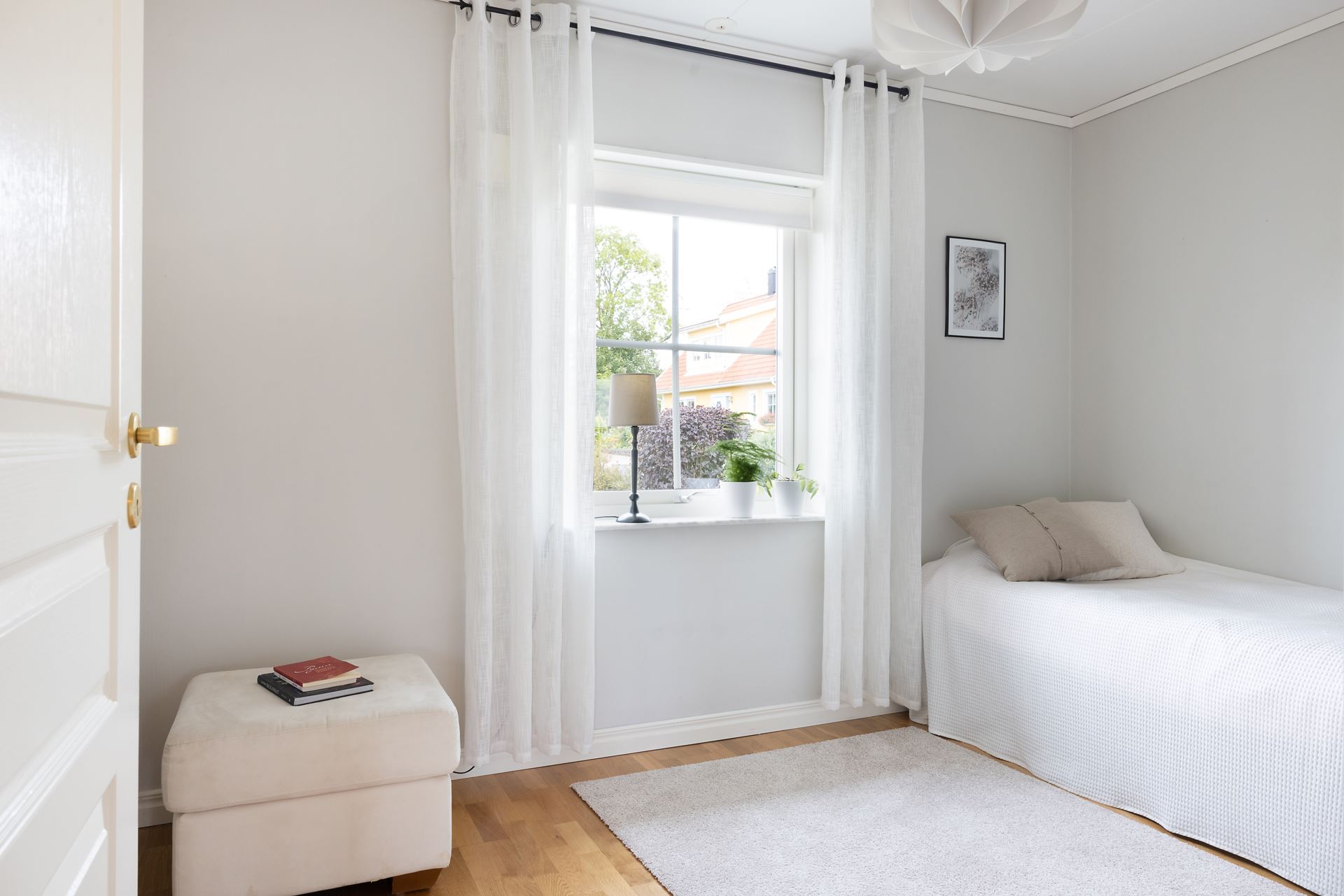 I direkt anslutning till vardagsrummet finns ett rum som idag fungerar som en förlängning av sällskapsytorna, men som lika väl kan bli ett trivsamt sovrum om så skulle önskas. Här fortsätter den enhetliga interiören med ekparkett, vita väggar och tak. Det generösa fönsterpartiet låter ljuset flöda in och förstärker känslan av rymd.