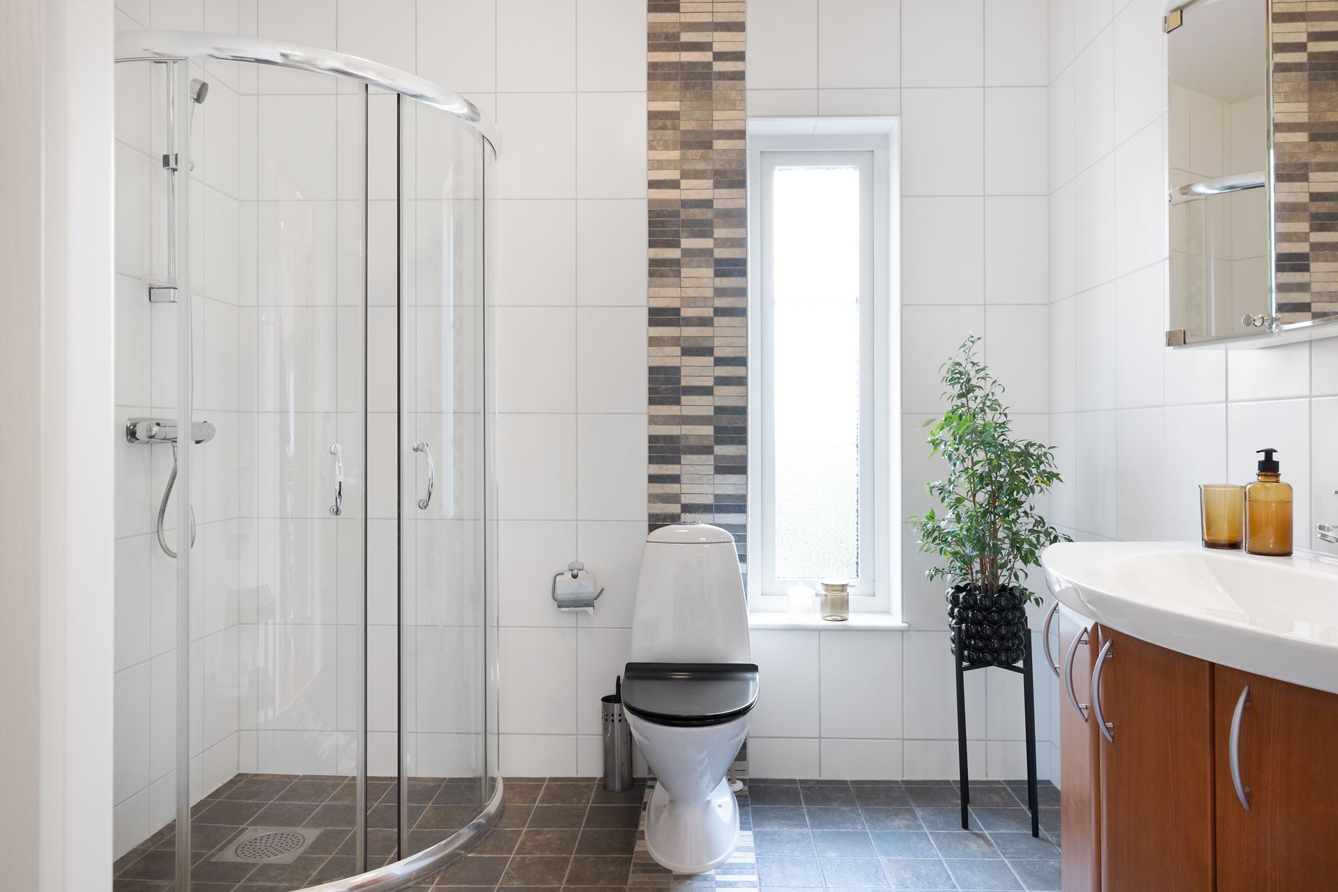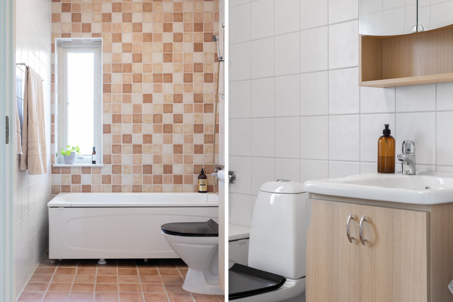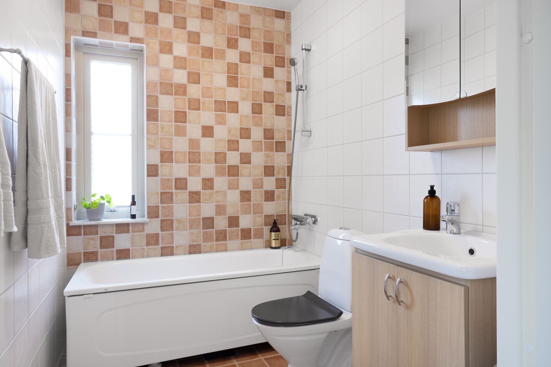 Från sovrummet nås ett helkaklat badrum med rostfärgat klinkergolv och vita kaklade väggar, kompletterat med en matchande fondvägg som harmonierar med golvets ton. Fönsterpartiet med frostat glas släpper in behagligt dagsljus samtidigt som det ger integritet. Badrummet är utrustat med wc, Vedum-tvättställ, spegelskåp och ett rymligt badkar.