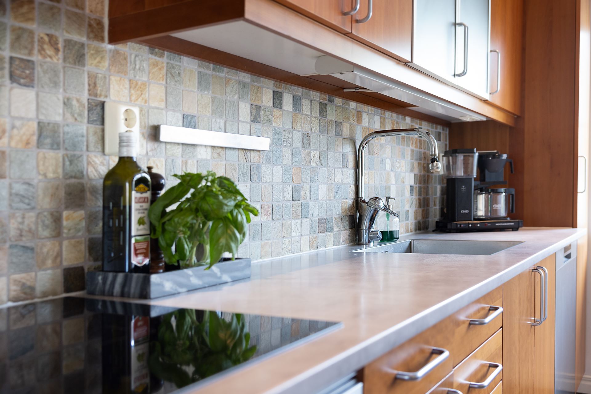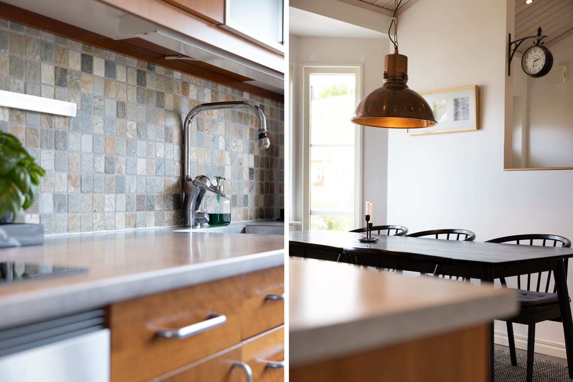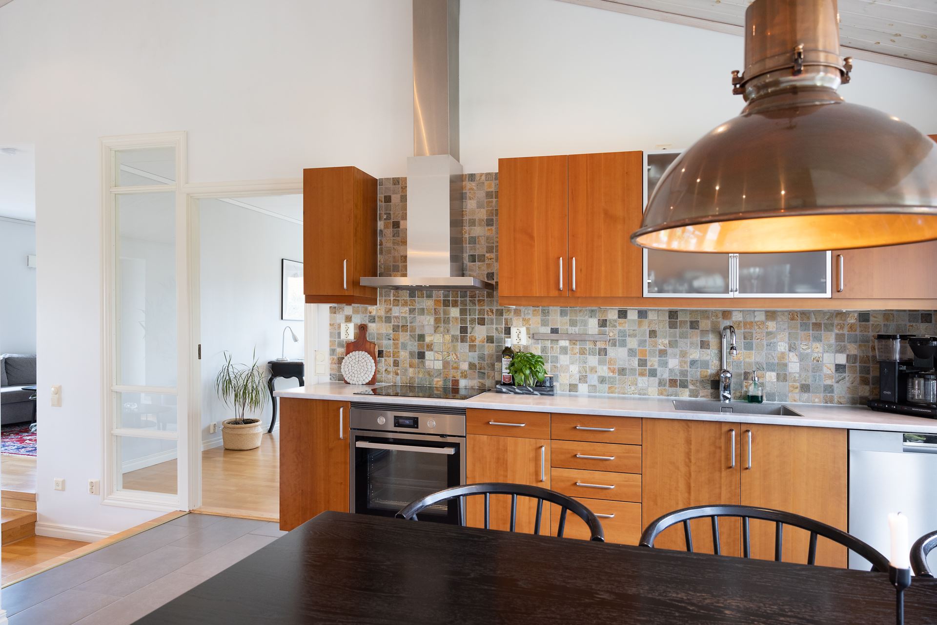 Köket från HTH erbjuder gott om förvaring bakom släta träluckor och generösa arbetsytor i ljust laminat. Ovanför pryder ett kakel i naturnära toner som skapar en varm och ombonad känsla. Den maskinella utrustningen består av kyl och frys i fullhöjd från Electrolux (2020), diskmaskin i rostfritt från Cylinda (2019), induktionshäll, inbyggd ugn och fläkt från IKEA (2019). Här finns rymliga ytor som enkelt rymmer ett större matbord, perfekt för både vardagsmiddagar och sociala tillställningar.