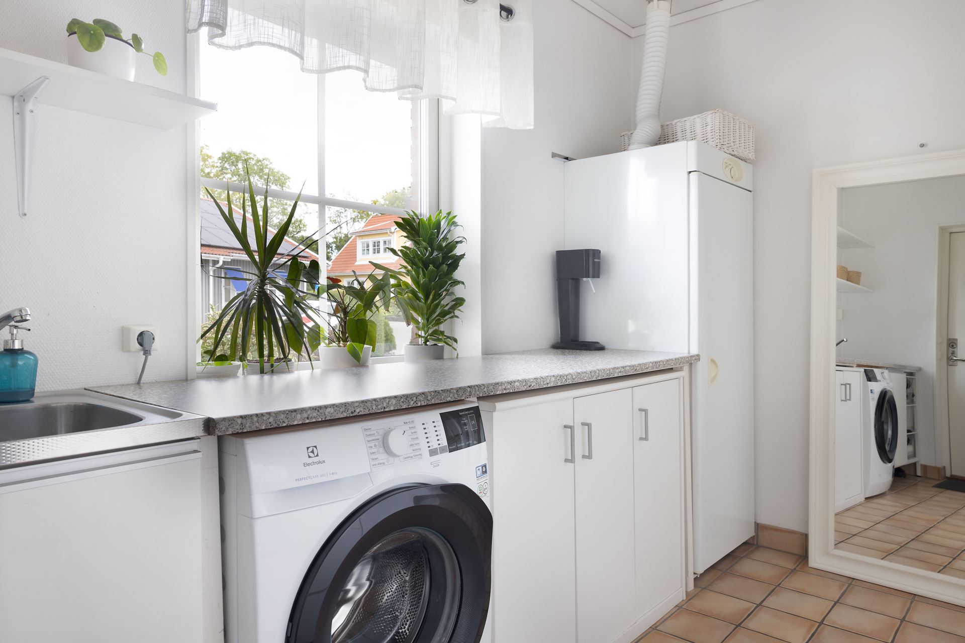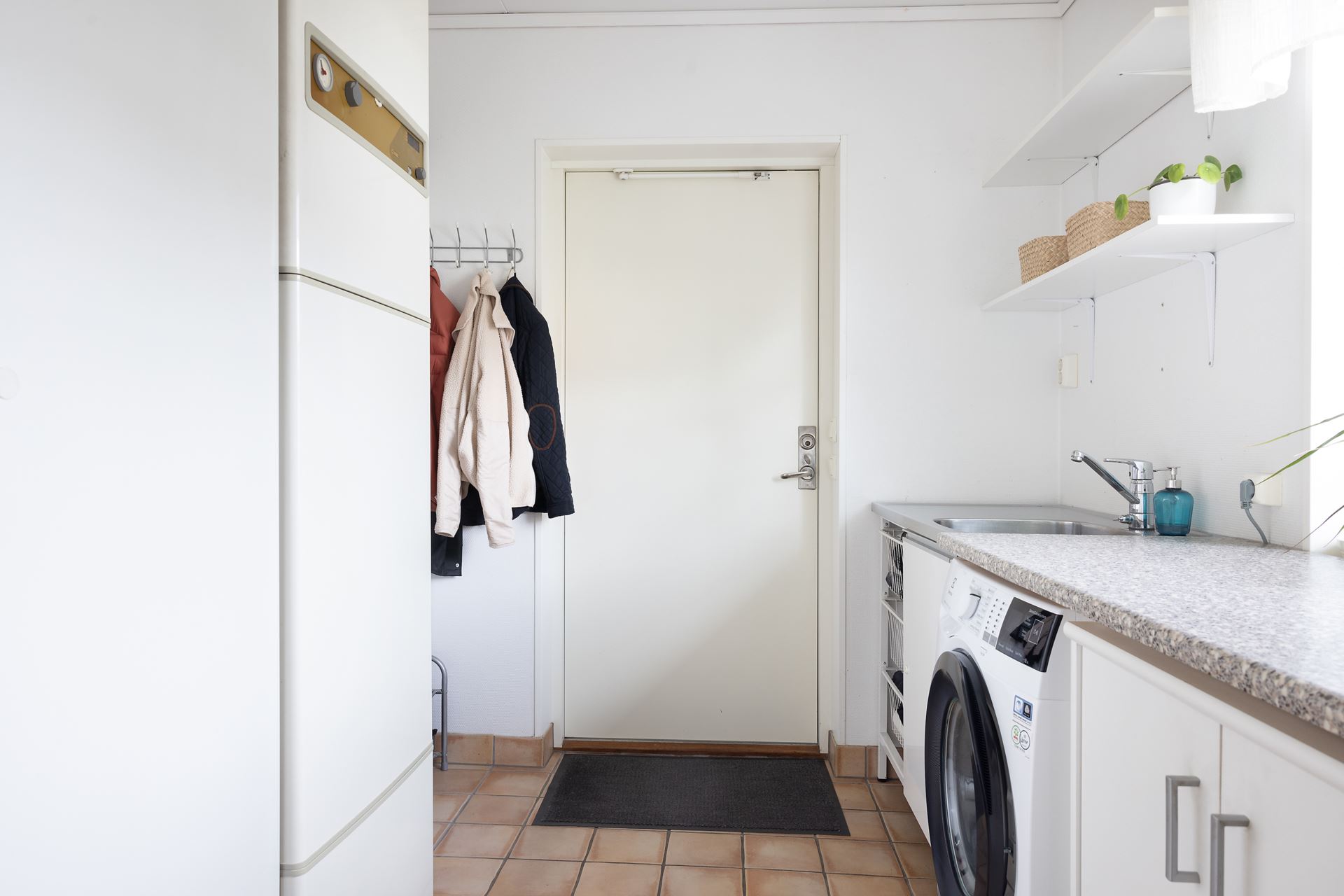 Tvättstugan nås smidigt via det tredje sovrummet och är inredd med beige klinkergolv, vita väggar och ett fönster som släpper in naturligt ljus. Här finns egen grovingång med praktiska avhängningsmöjligheter. Utrymmet är funktionellt utrustat med tvättmaskin från Electrolux (2023) med arbetsbänk i laminat ovan, torkskåp (2005), grovvask och frånluftsvärmepump (2005).