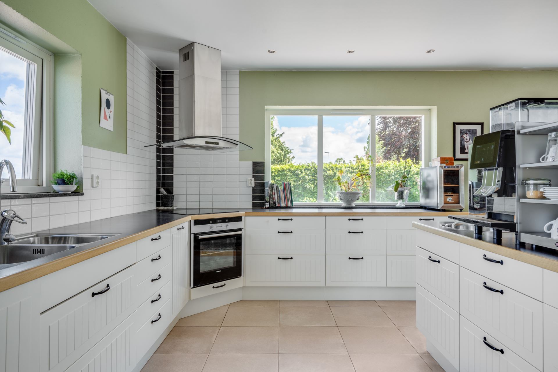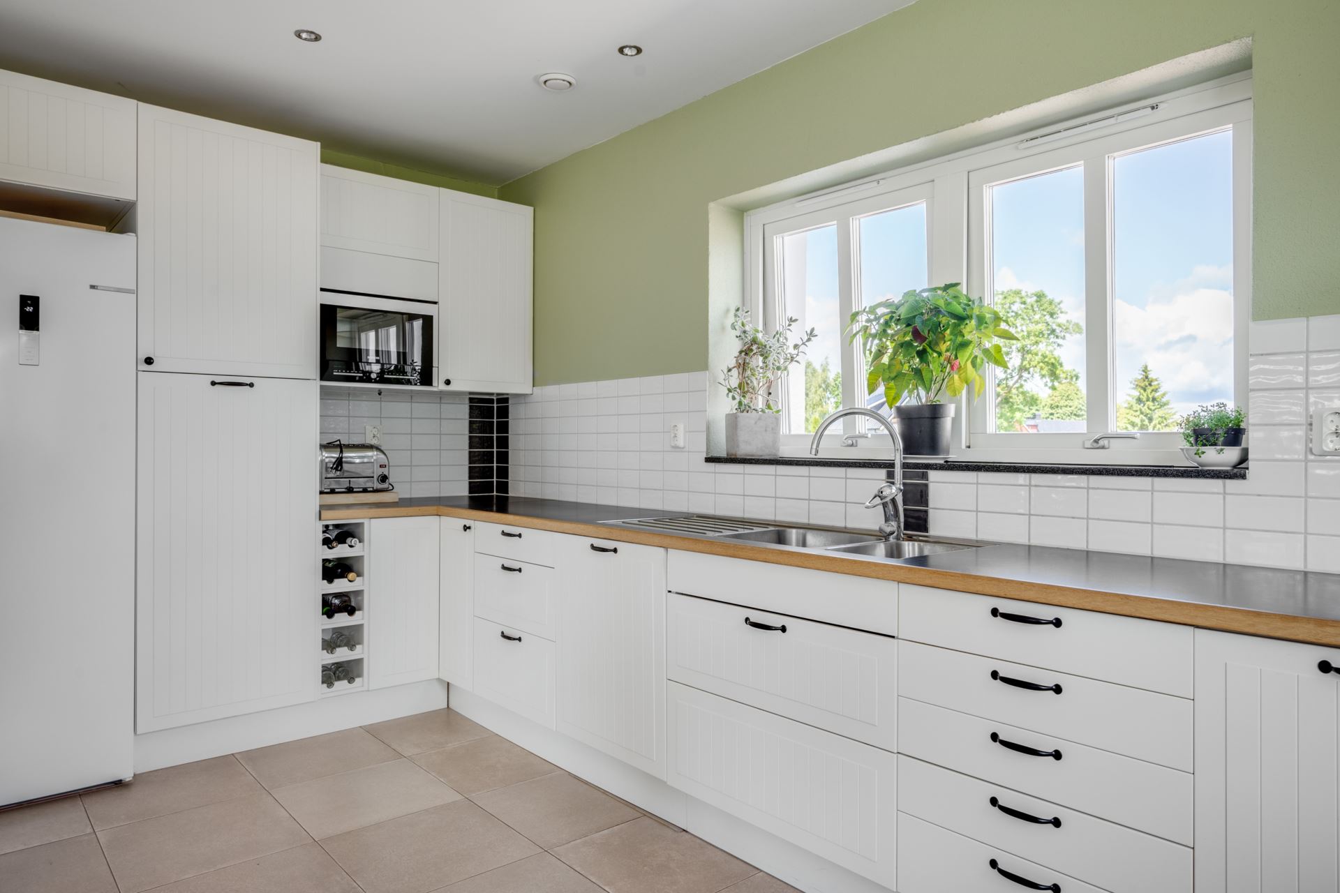 Vidare in väntar en smakfull köksinteriör i öppen planlösning med vida vardagsrumskvadrat. Goda förvaringsmöjligheter erbjuds bakom vita luckor, som möter vitt kakel ovanför mörka arbetsytor i laminat. Den maskinella utrustningen består av ugn, spishäll, fläkt, integrerad diskmaskin, mikro samt kyl och frys i fullhöjd. Stor köksö och fint ljusinsläpp genom flera fönster ovanför både vask och arbetsyta. Även här finner vi snyggt klinkergolv och infällda takspotlights.