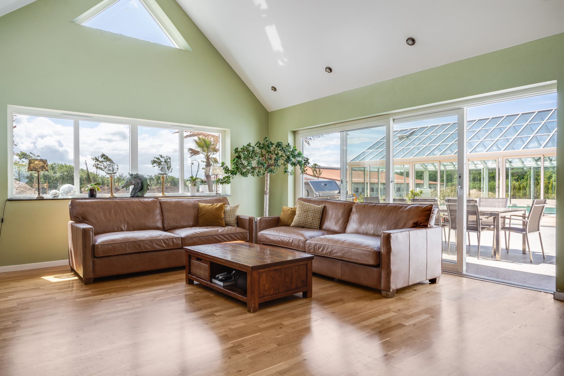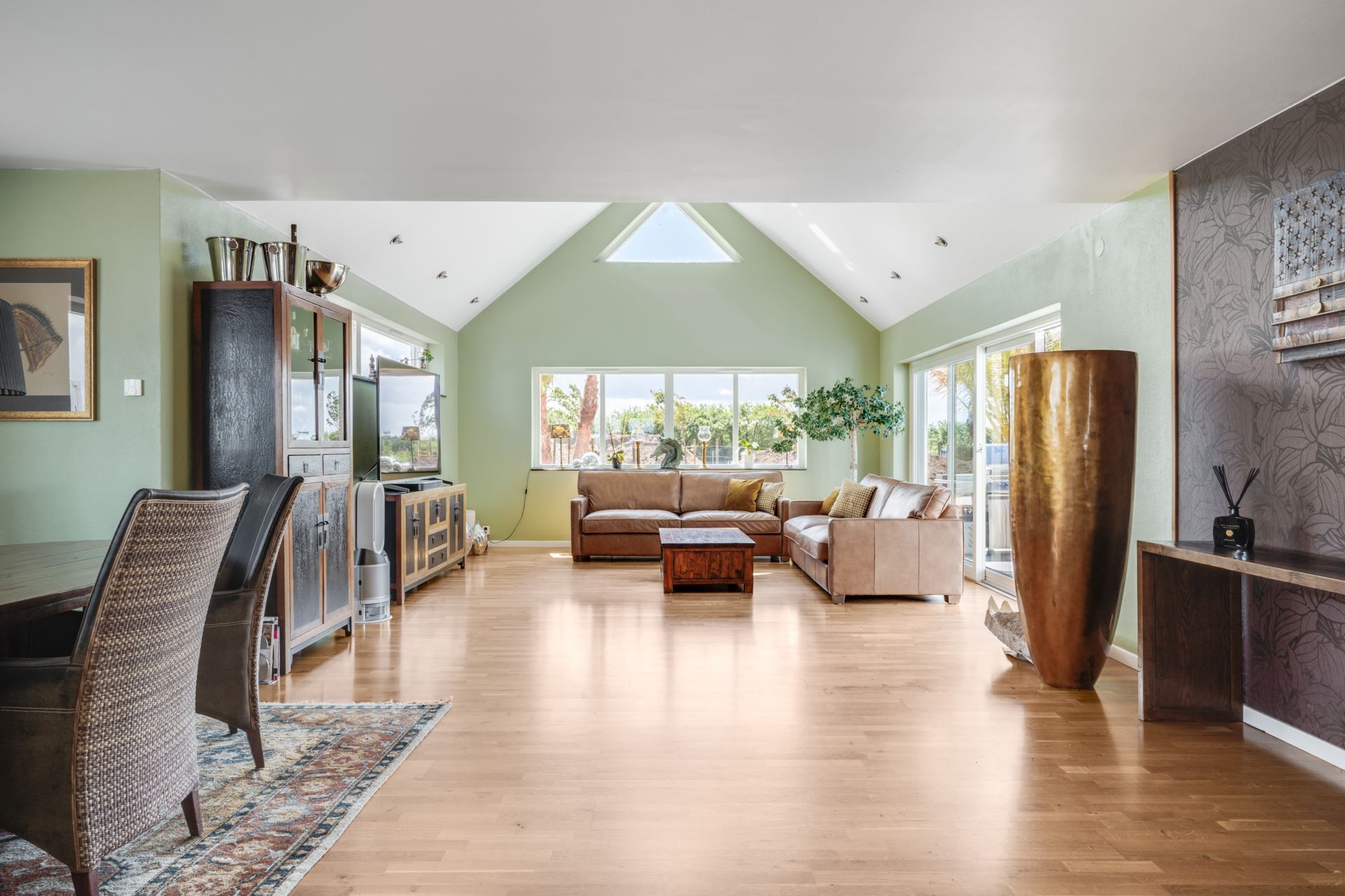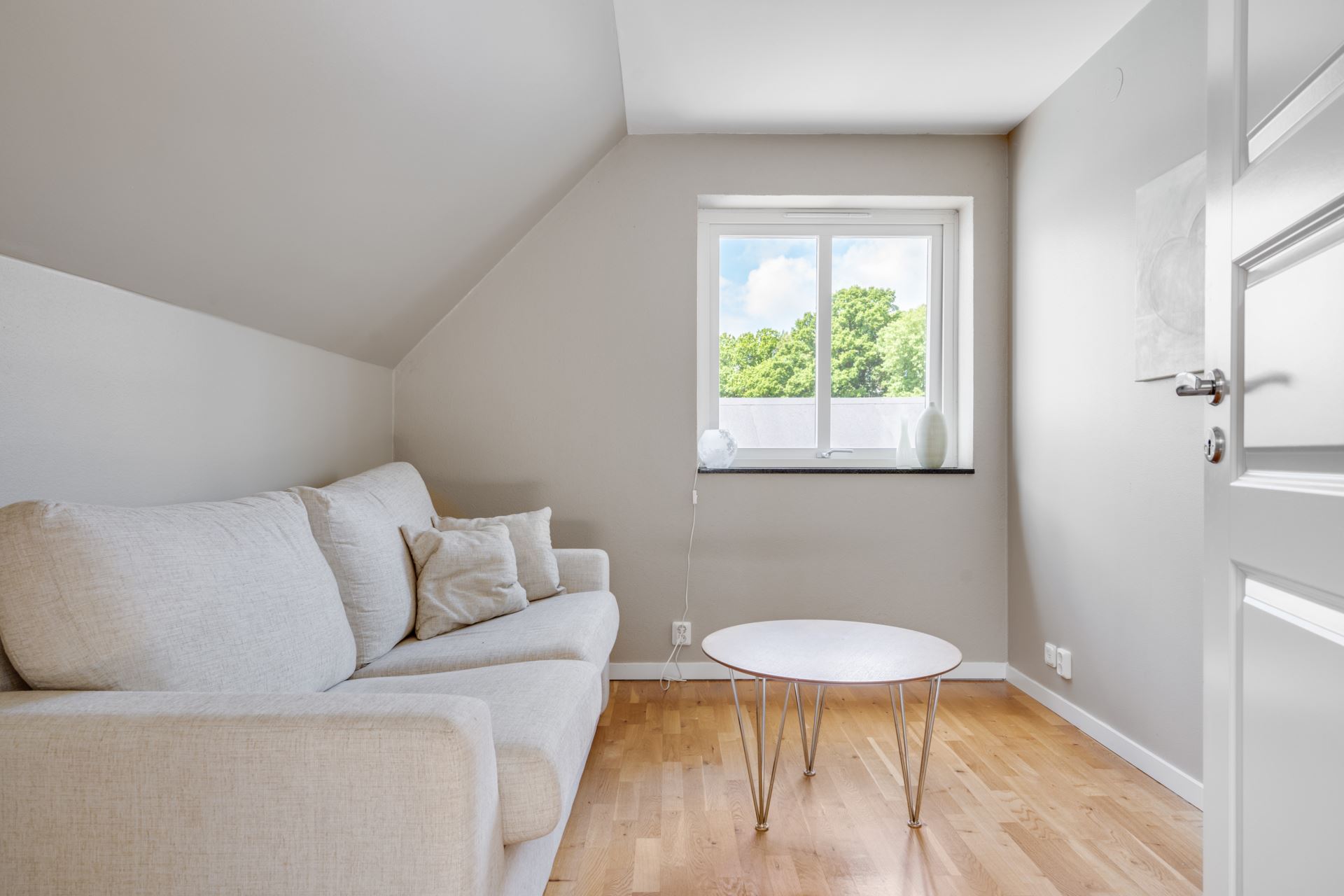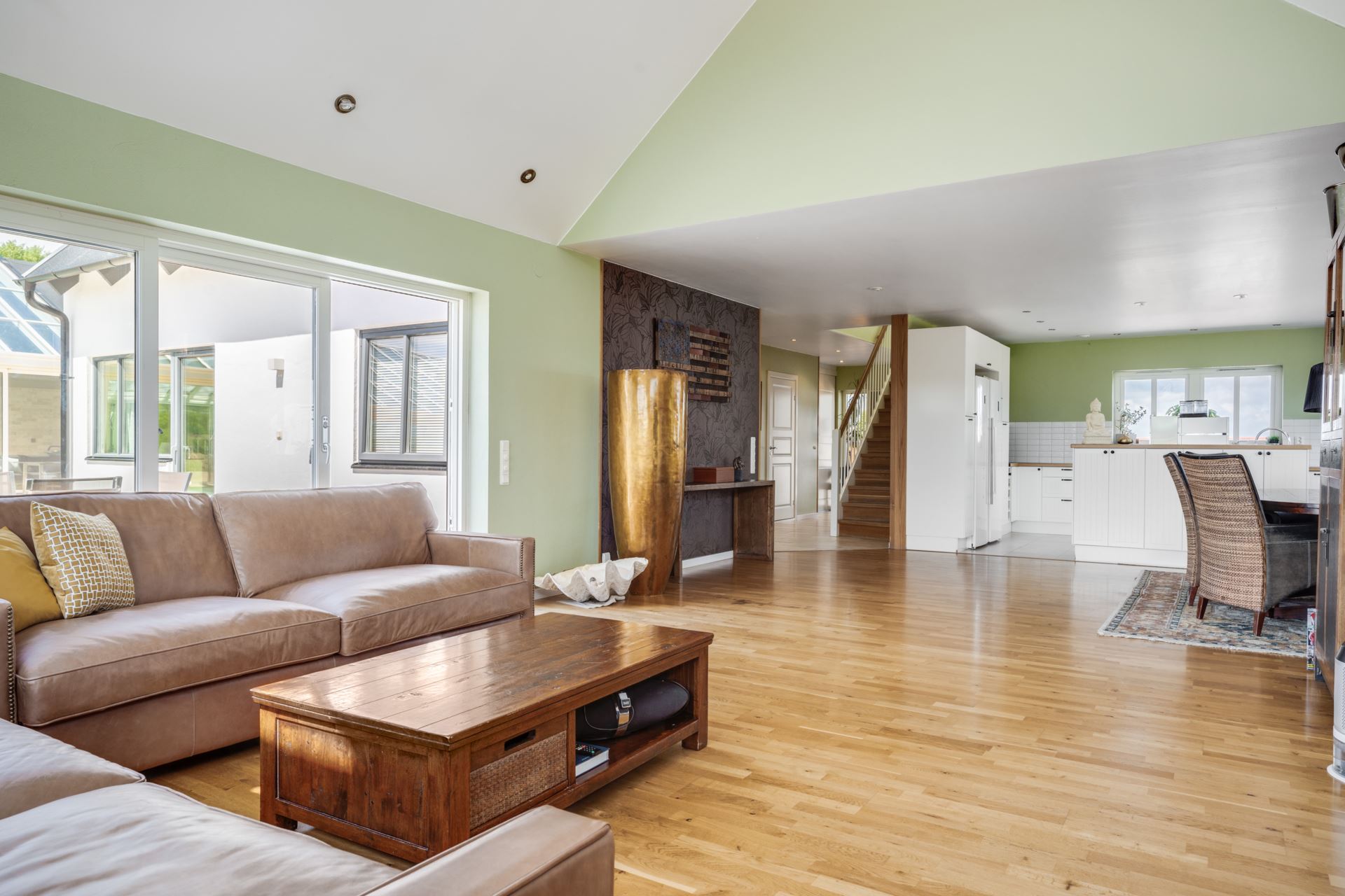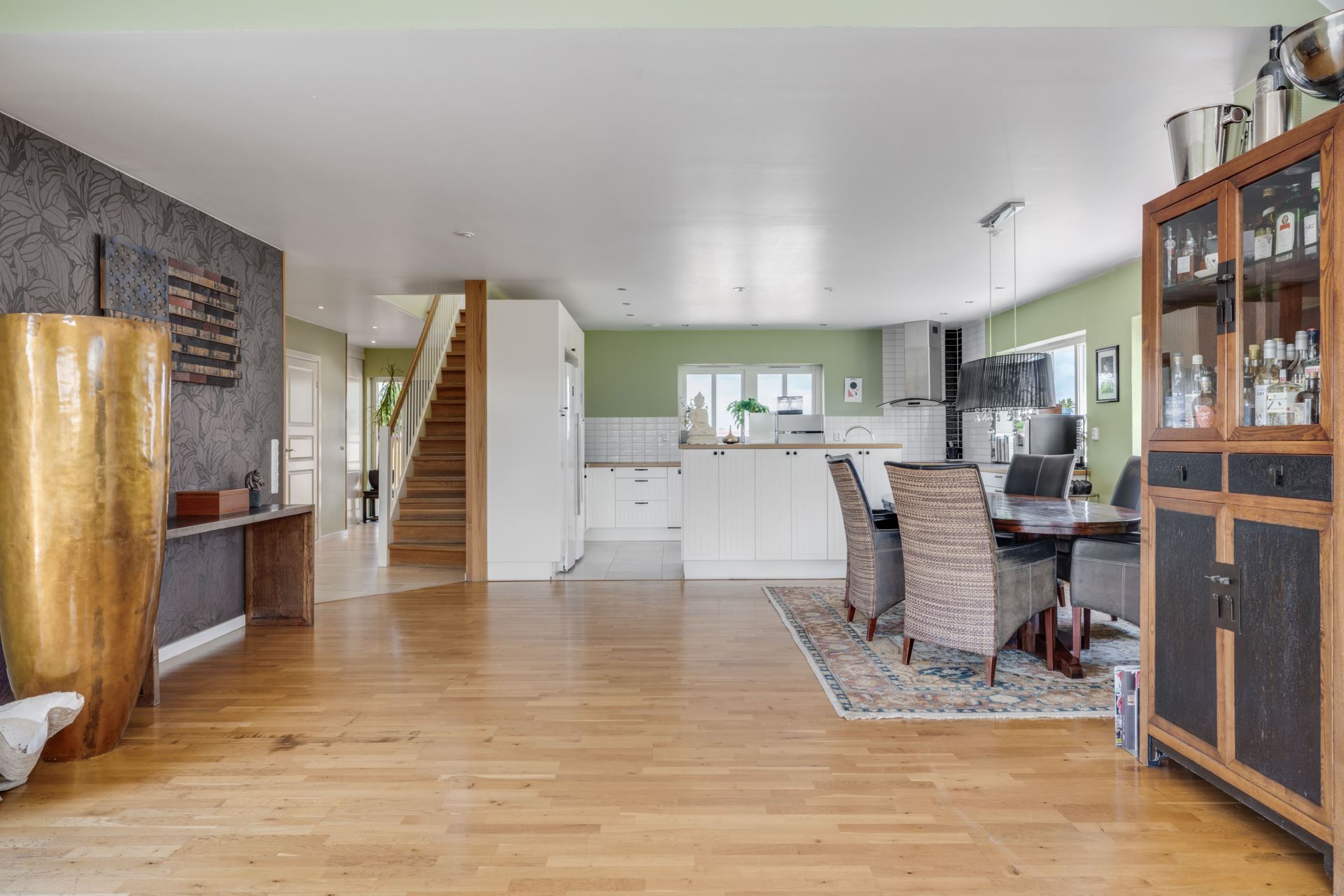 Vardagsrummet i direkt anslutning bjuder på massor av plats för såväl soffgrupp och sköna fåtöljer som middagsbord för vänner och familj. Parkettgolv ackompanjeras av läcker takhöjd med delvis öppet till nock med fantastiska, stora fönsterpartier i tre väderstreck som släpper in ett strålande ljusinsläpp. Generösa glasskjutpartier från golv till tak visar vägen ut till njutbar uteplats som extra bonus.