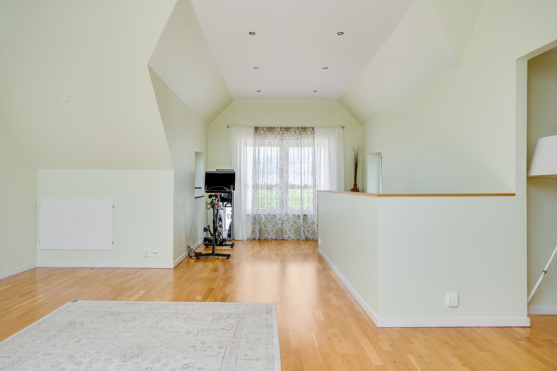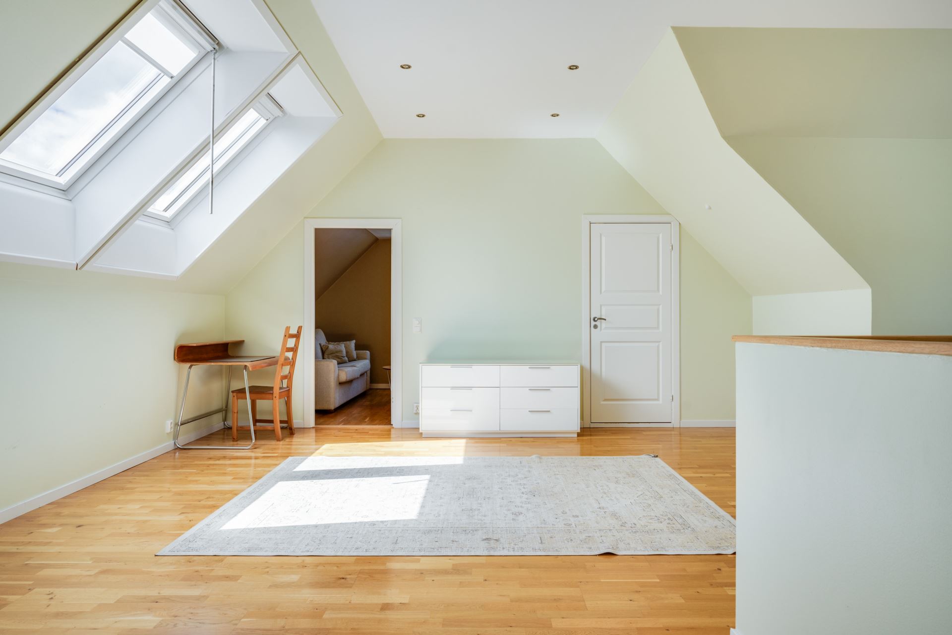 En trappa upp tar ett härligt ljust och stort allrum emot med trägolv och ett slående ljusinsläpp ifrån både takfönster i par och burspråk med vidsträckt utsikt. Infällda takspotlights och fina ytor för både soffmöbel och TV samt hemmakontoret om man så önskar.