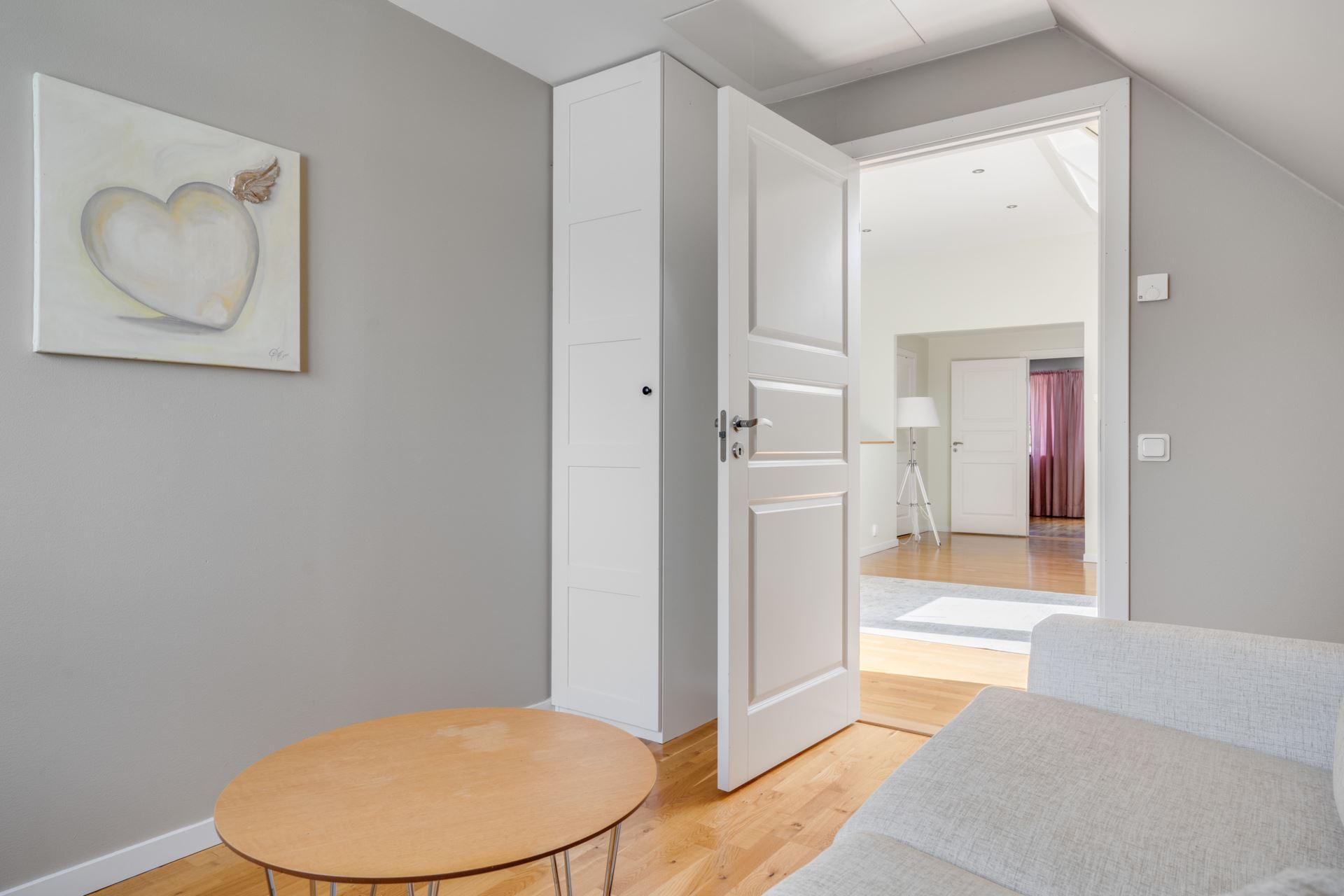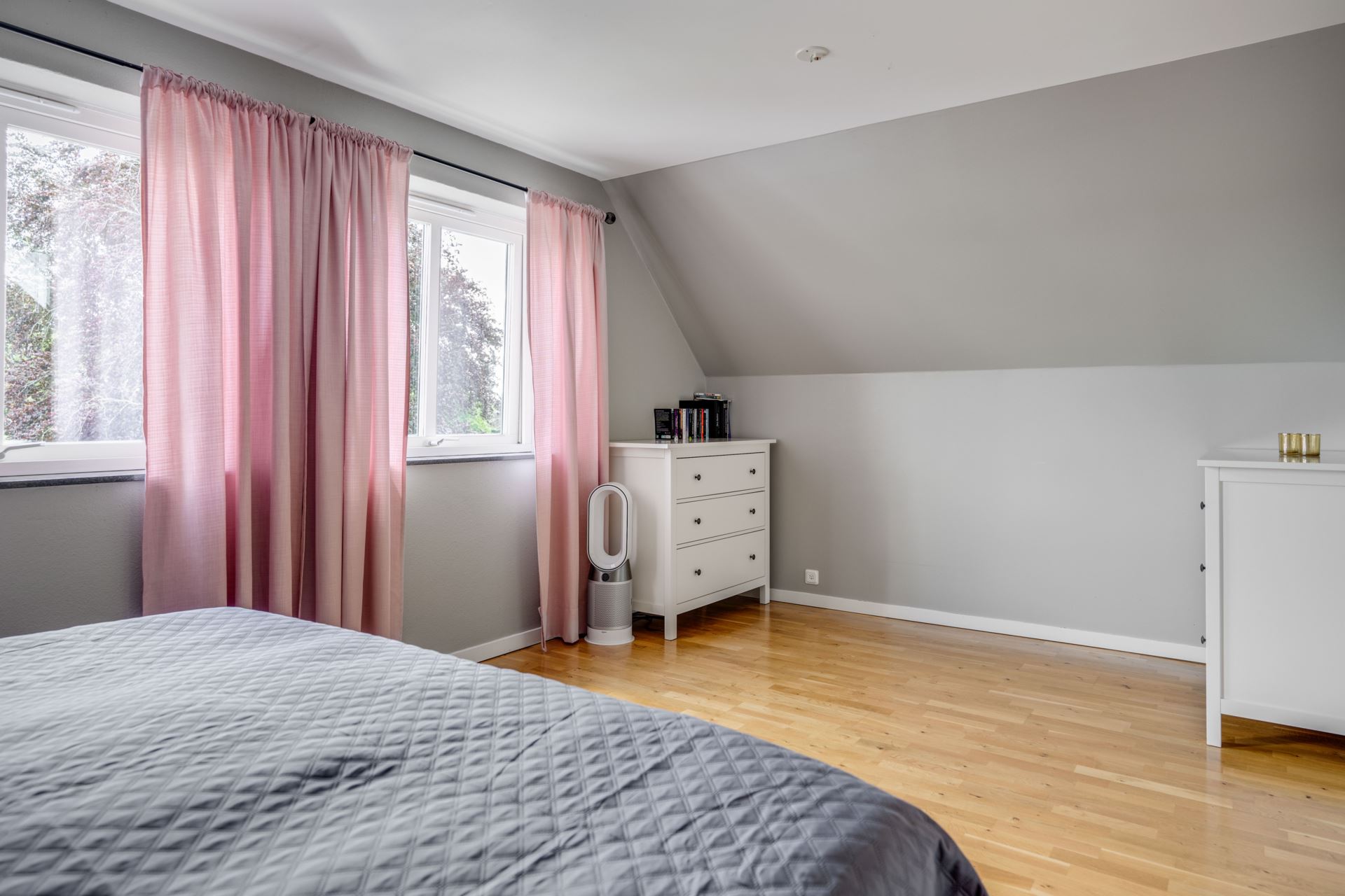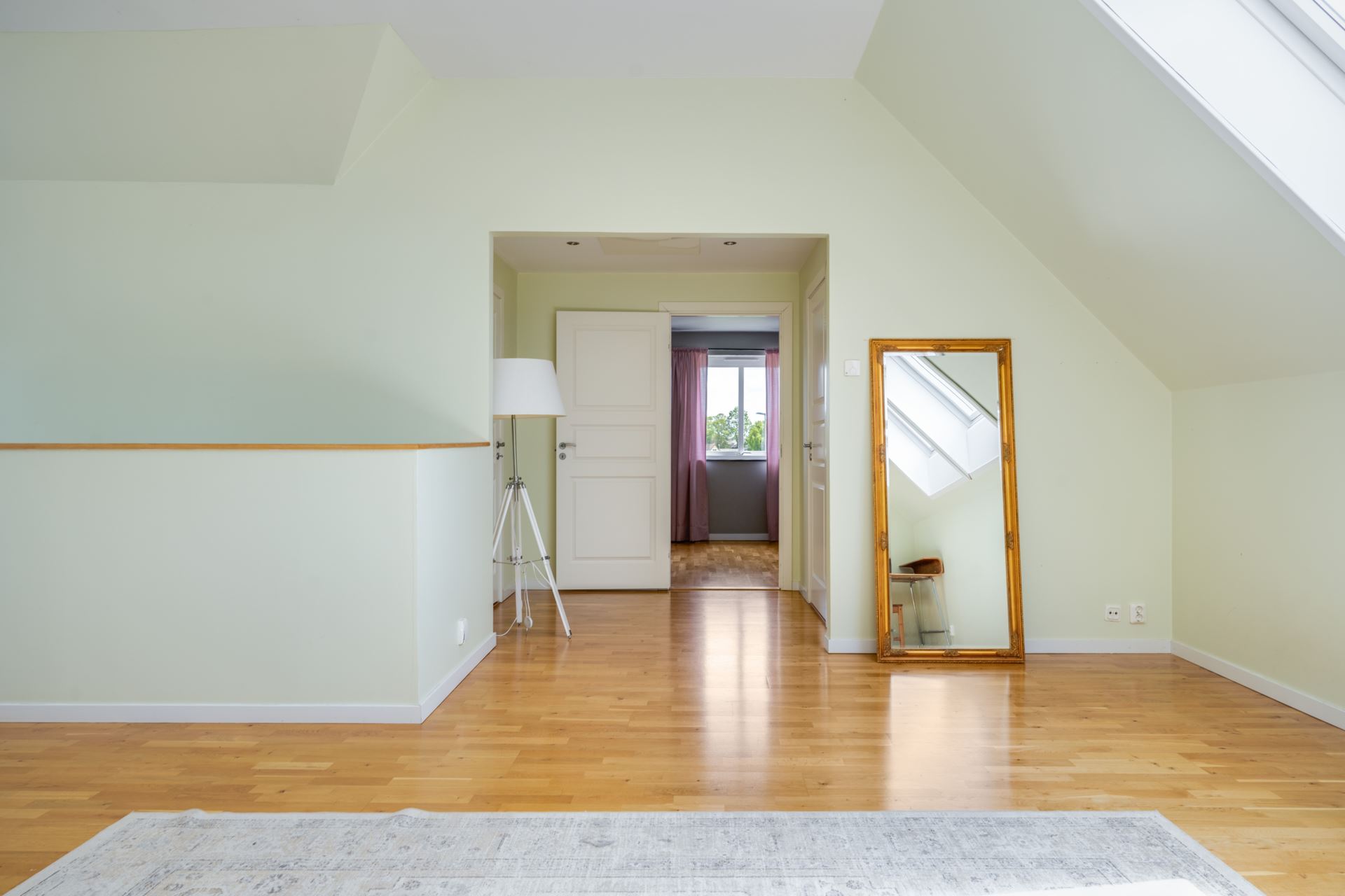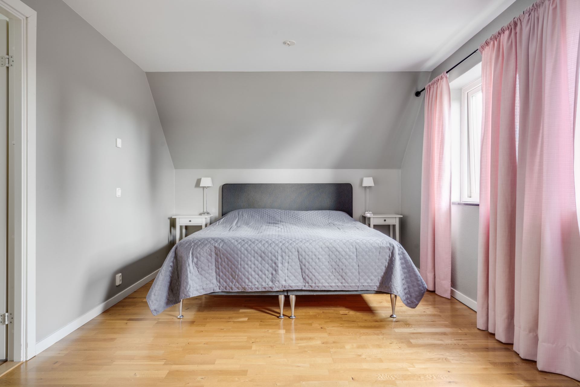 I ena delen av våningsplanet är ett mycket rymligt sovrum beläget. Rummet kan med fördel delas av till två sovrum vid behov. Två fönster släpper in ljuset på bästa sätt och här finns även parkettgolv och angränsande klädkammare.