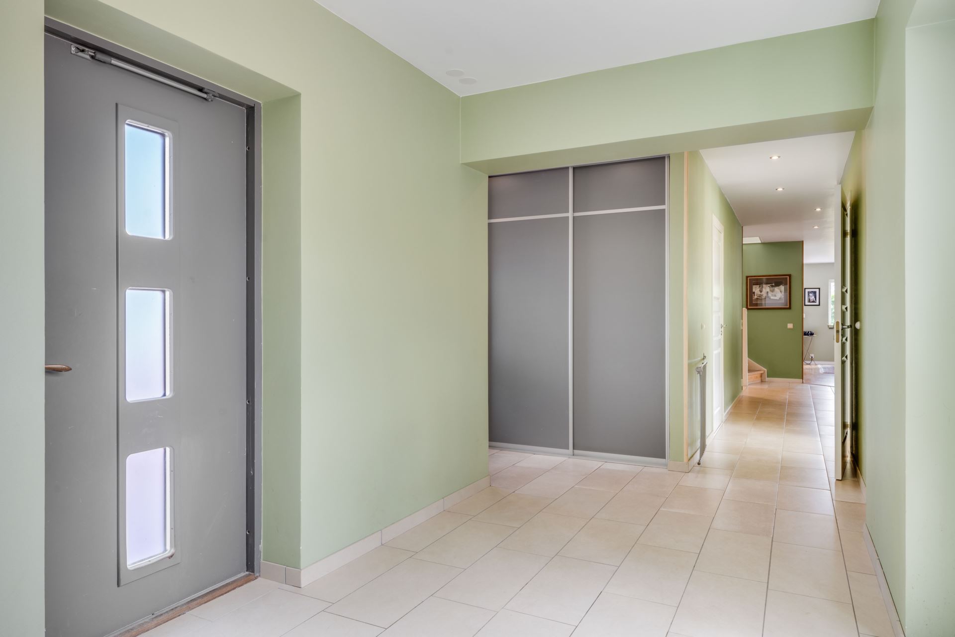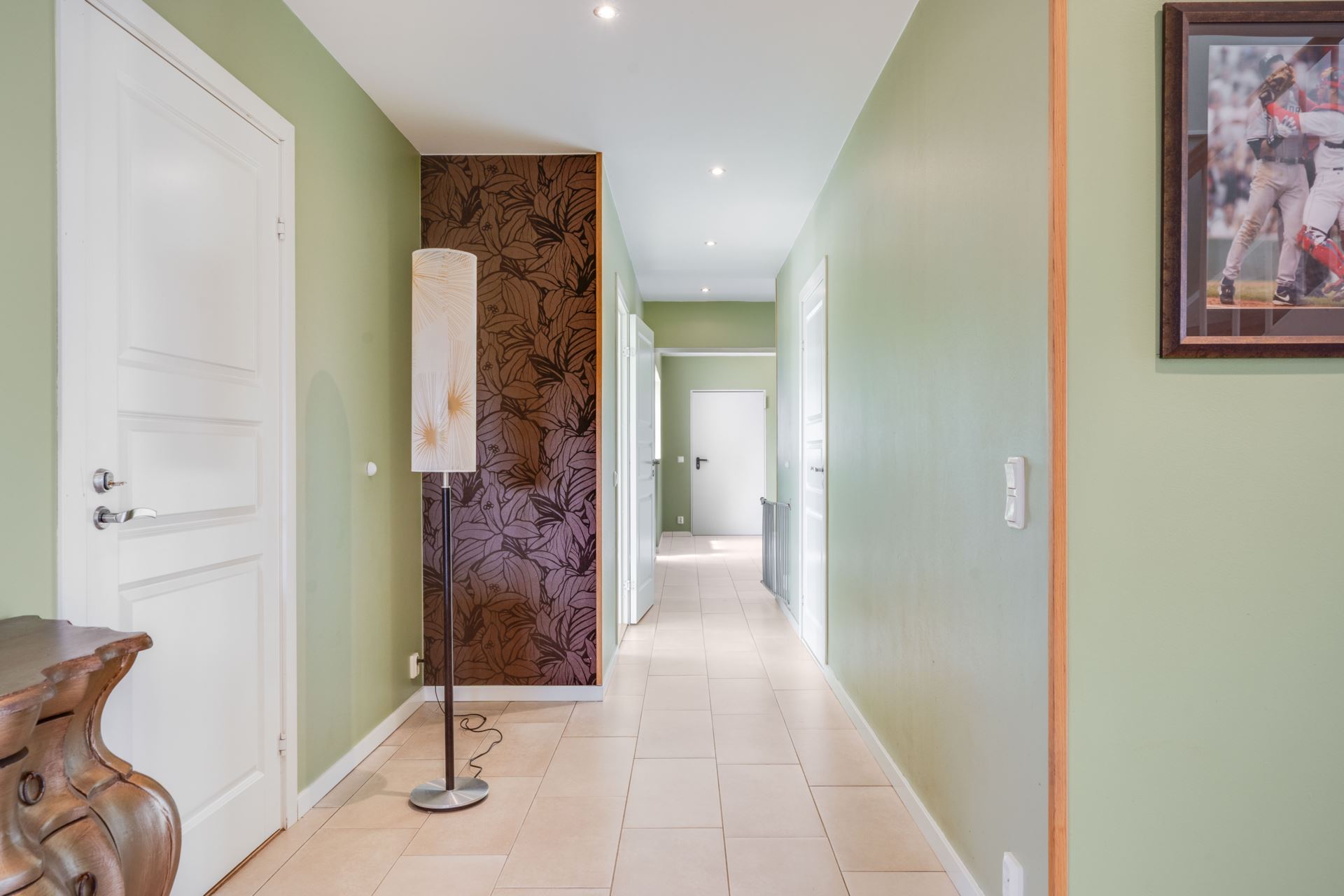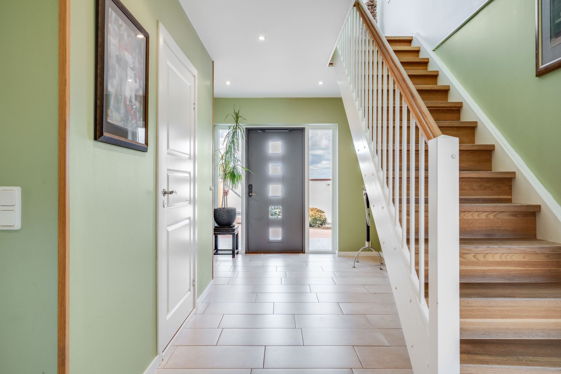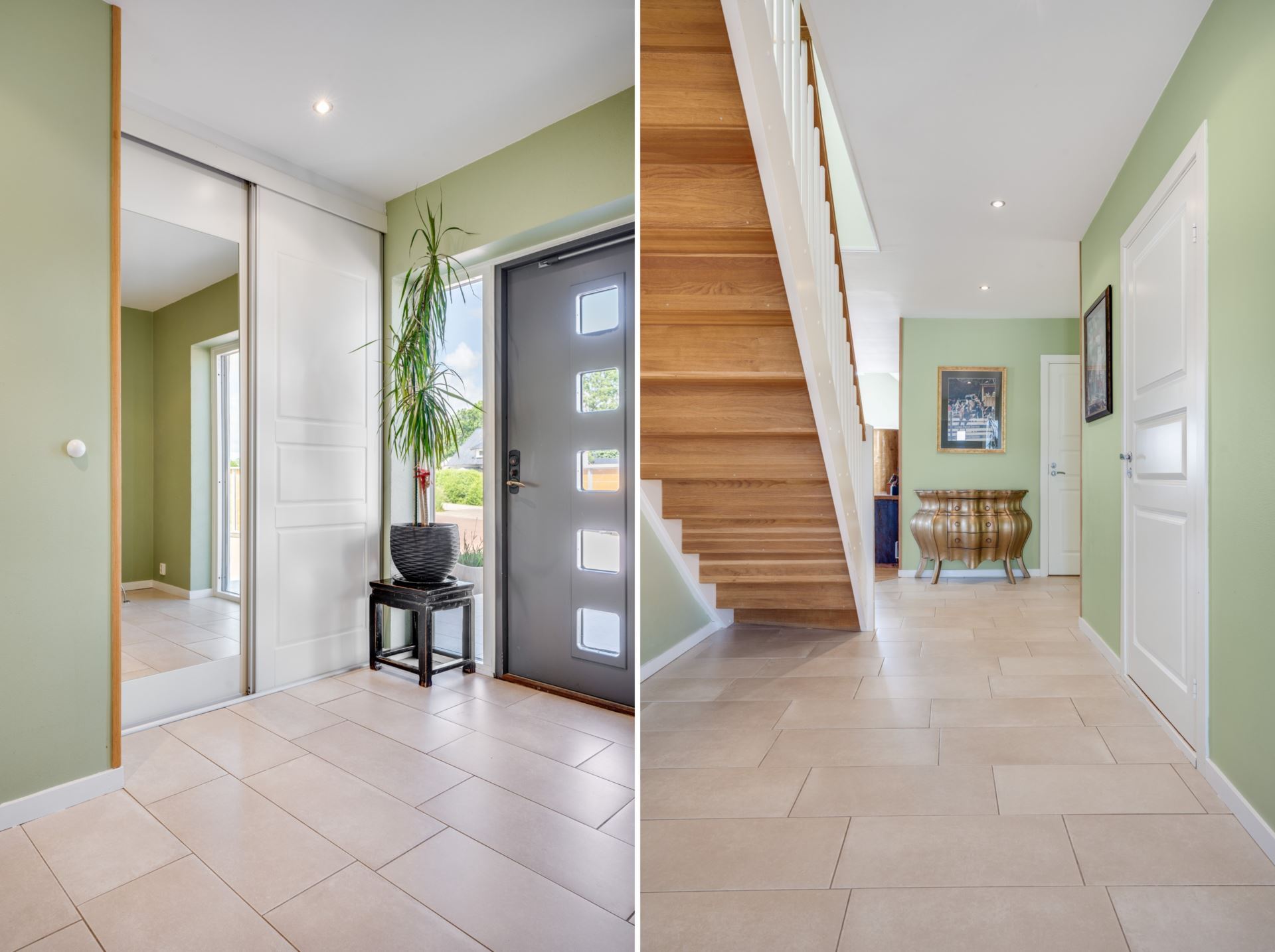 Representativ hallmiljö med elegant stengolv och luftiga ytor. Rikligt med ljusinsläpp genom såväl ytterdörrens fönster som stora sidoljus. Här finns gott om plats för avhängning av ytterkläderna och utmärkt förvaring i en rymlig garderob bakom skjutdörrsbeklädda dörrar i vitt respektive spegel. Behaglig belysning därtill med infällda takspotlights.