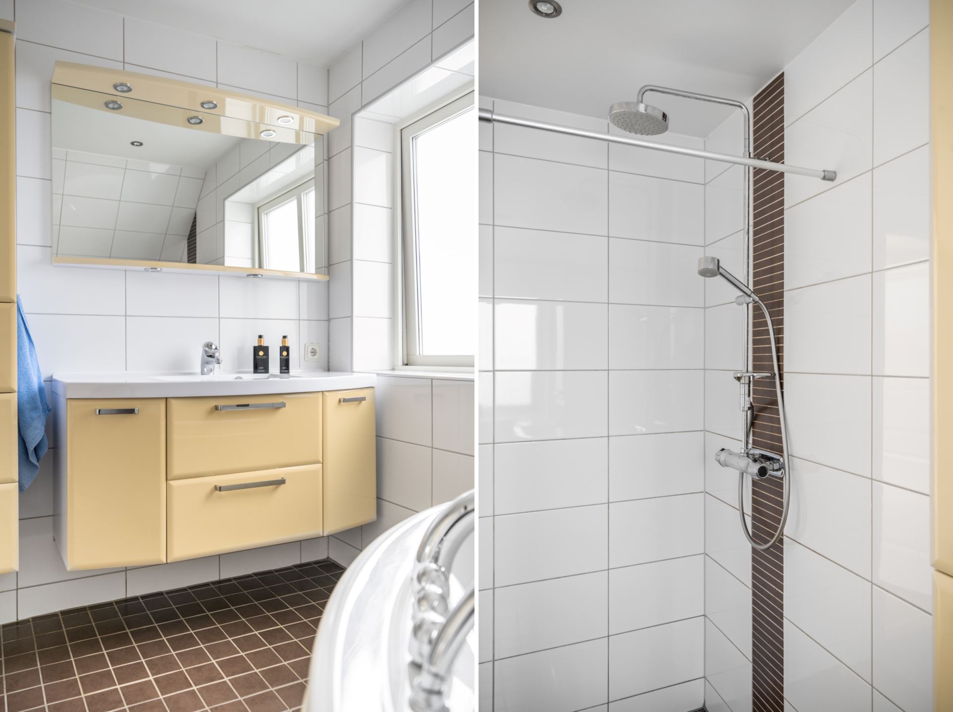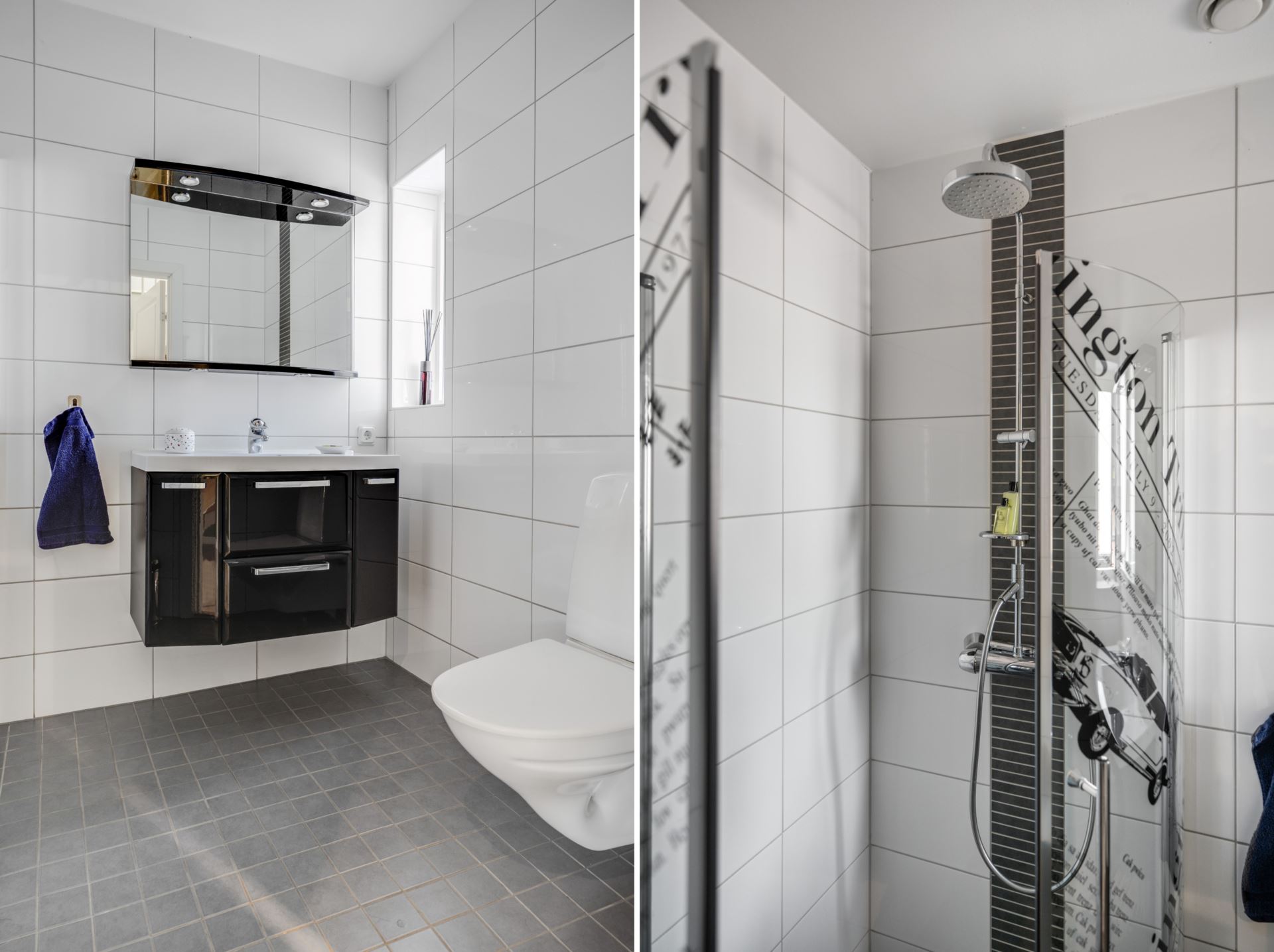Till höger är entréplanets badrum beläget. Badrummet är försett med helkaklade ytskikt i grått och vitt, handfat med svart kommod och matchande spegel med belysning, vägghängd wc samt dusch bakom vikdörrar i glas.