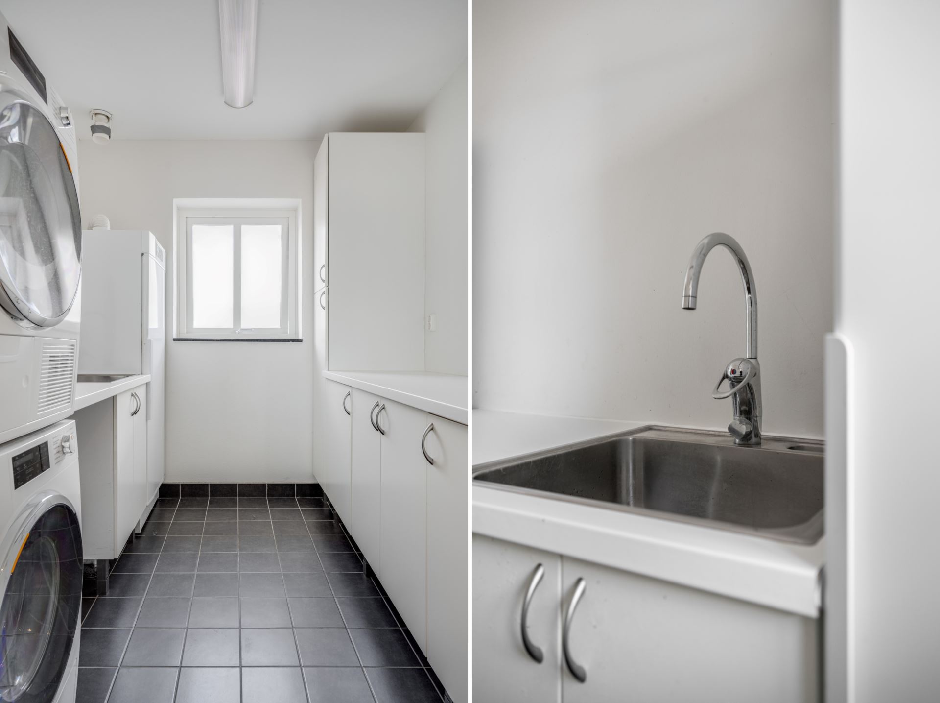 Bostadens tvättrum är välutrustat med grått klinkergolv, vask och bra förvaring i flertalet vita skåp. Här finns förstås även tvättpelare med tvättmaskin och torktumlare.
