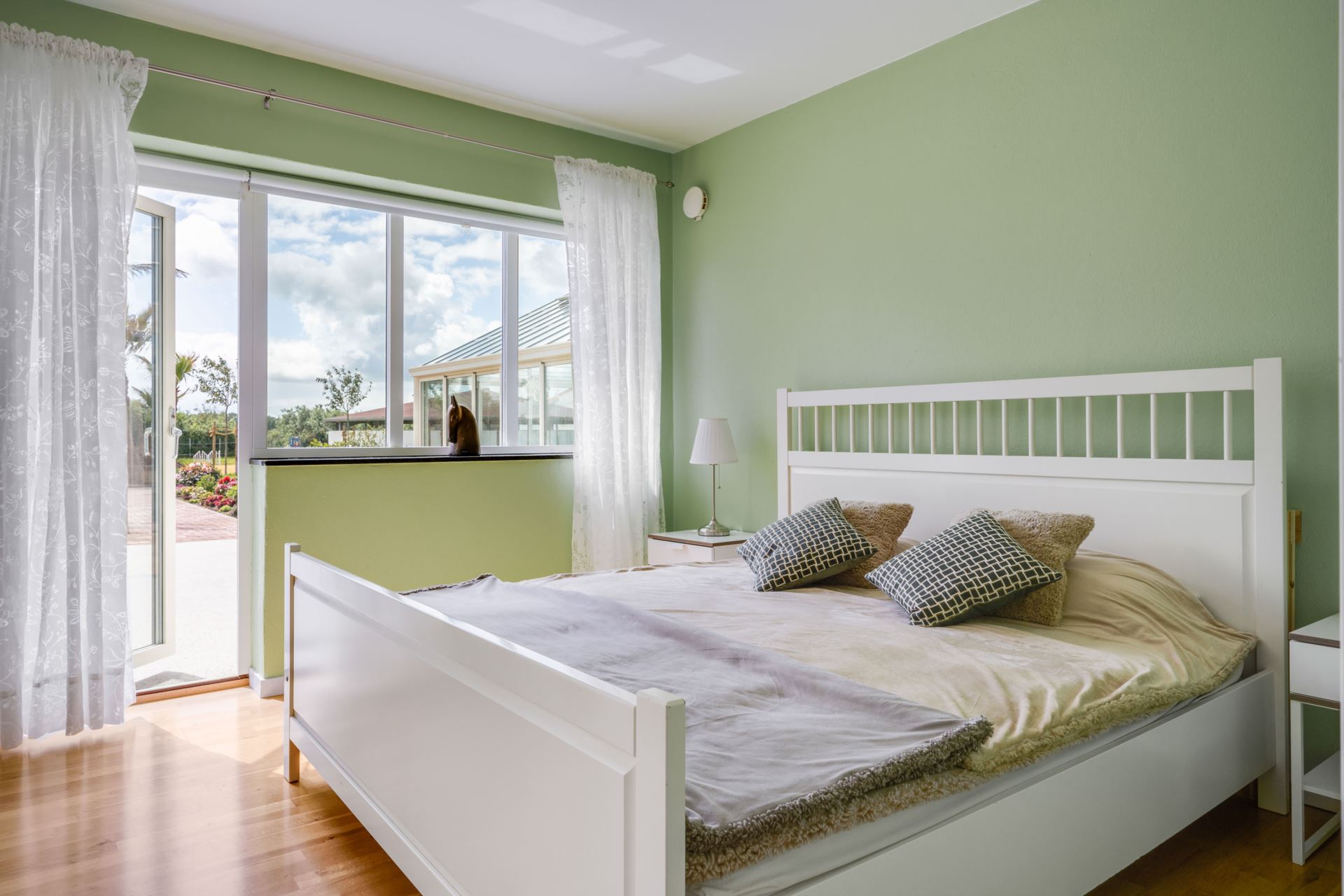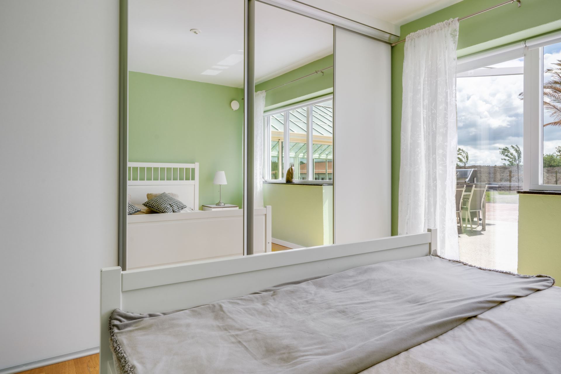 Vägg i vägg finner vi ett sovrum av god storlek, där parkettgolv samspelar med både fönster och ljusbringande terrassdörr mot uteplatsen. Förutom dubbelsäng och tillhörande möblemang finns en rejäl skjutdörrsgarderob för enkel förvaring av säsongernas plagg.