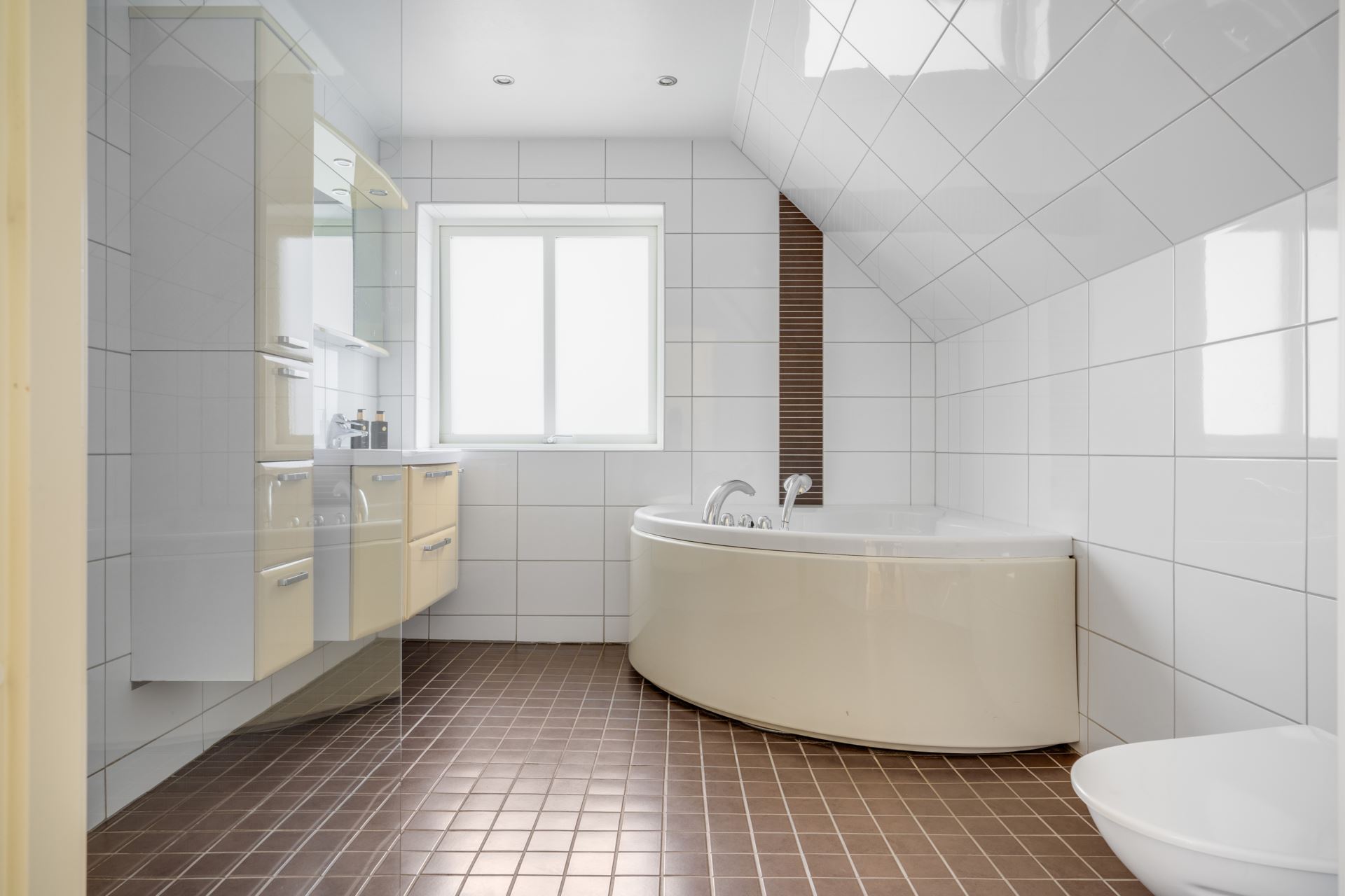 Ovanvåningens badrum är i helkaklat utförande med nougatbrunt klinkergolv och vitkaklade väggar med bruna dekorativa inslag. Badrummet är utrustat med hörnbadkar, infällda takspotlights, handfat med ljus kommod och matchande högskåp, spegel med belysning samt vägghängd wc och dusch bakom glasvägg.