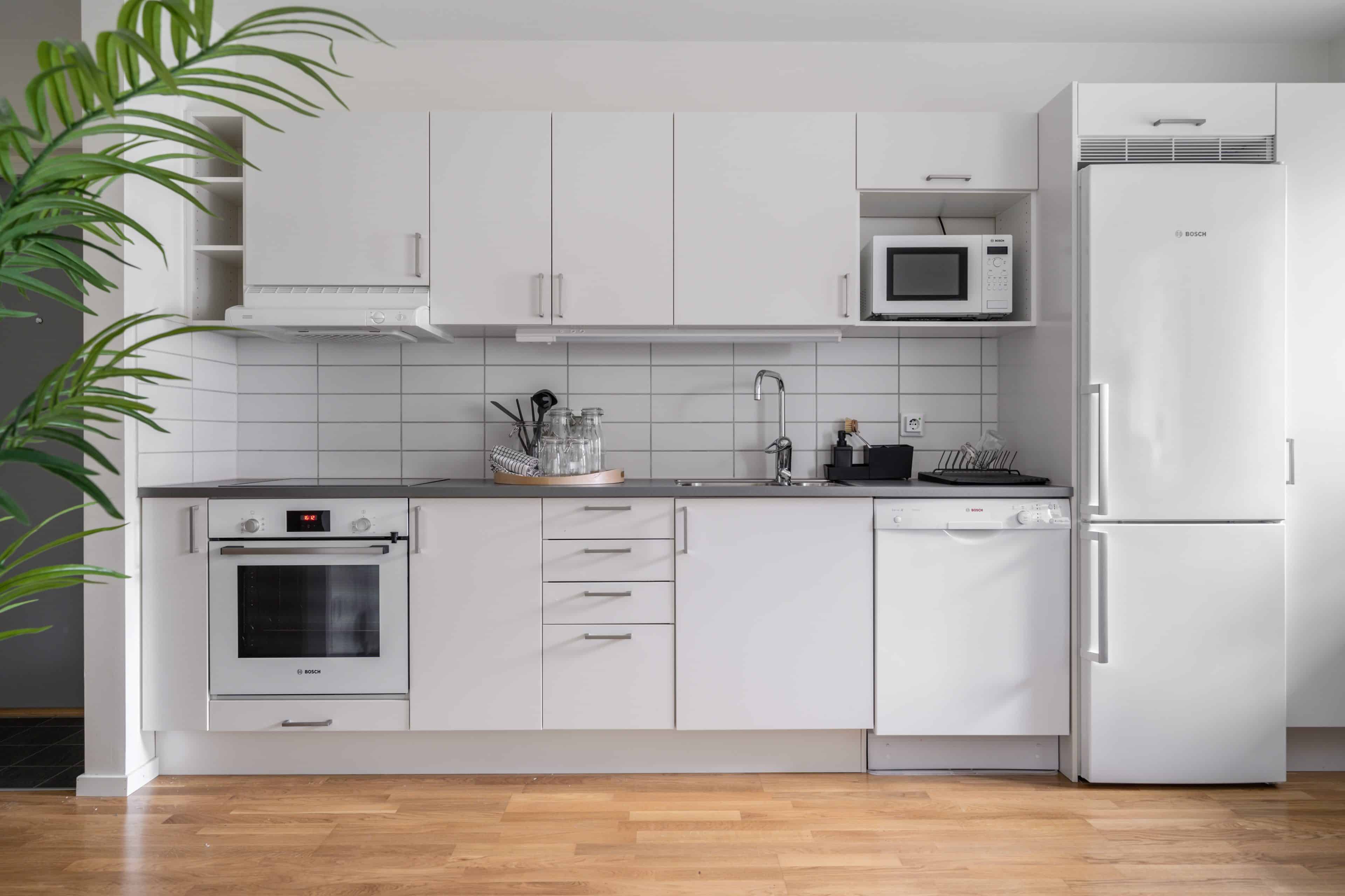 Köket består av vita släta luckor och är utrustade med diskmaskin samt microvågsugn.
