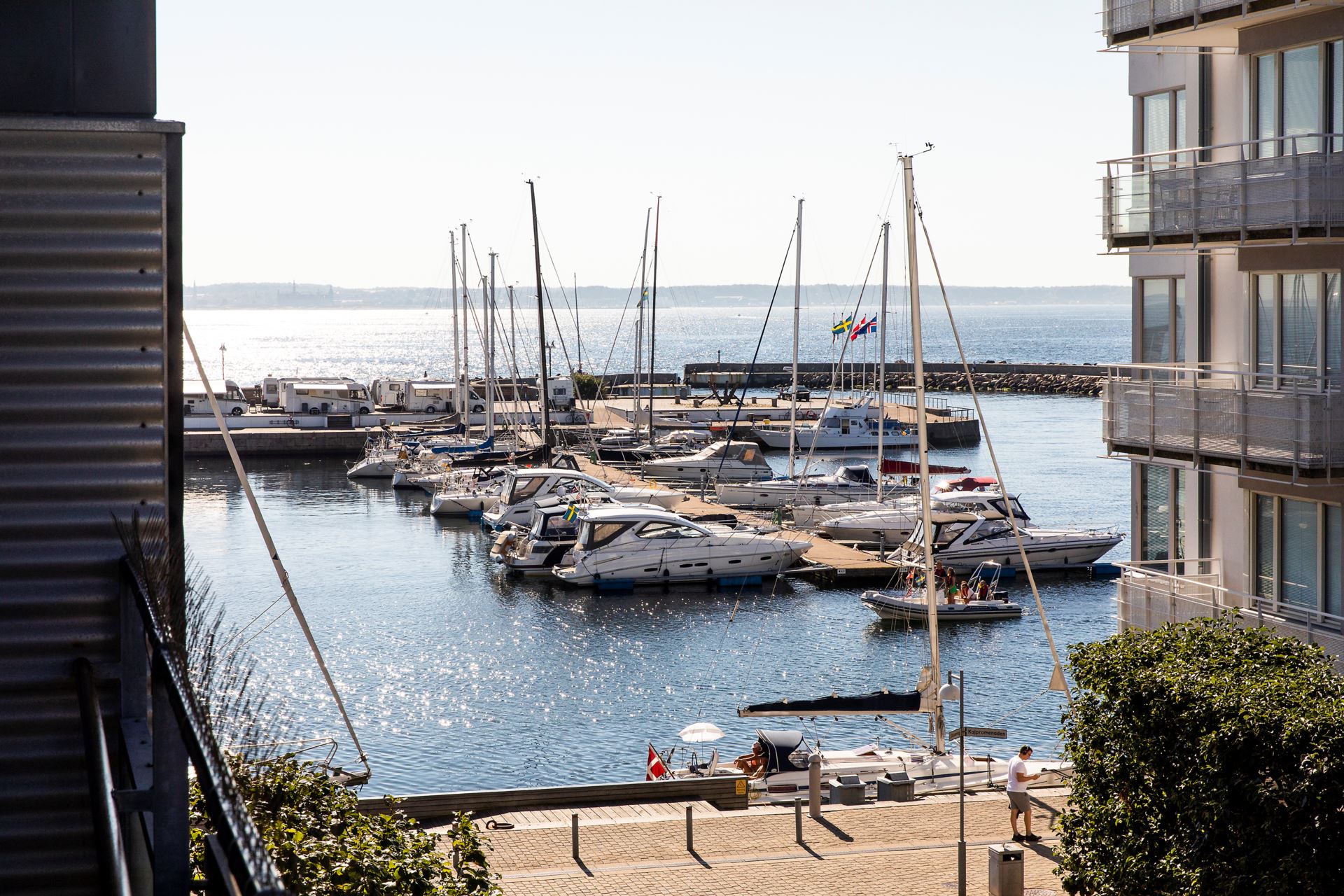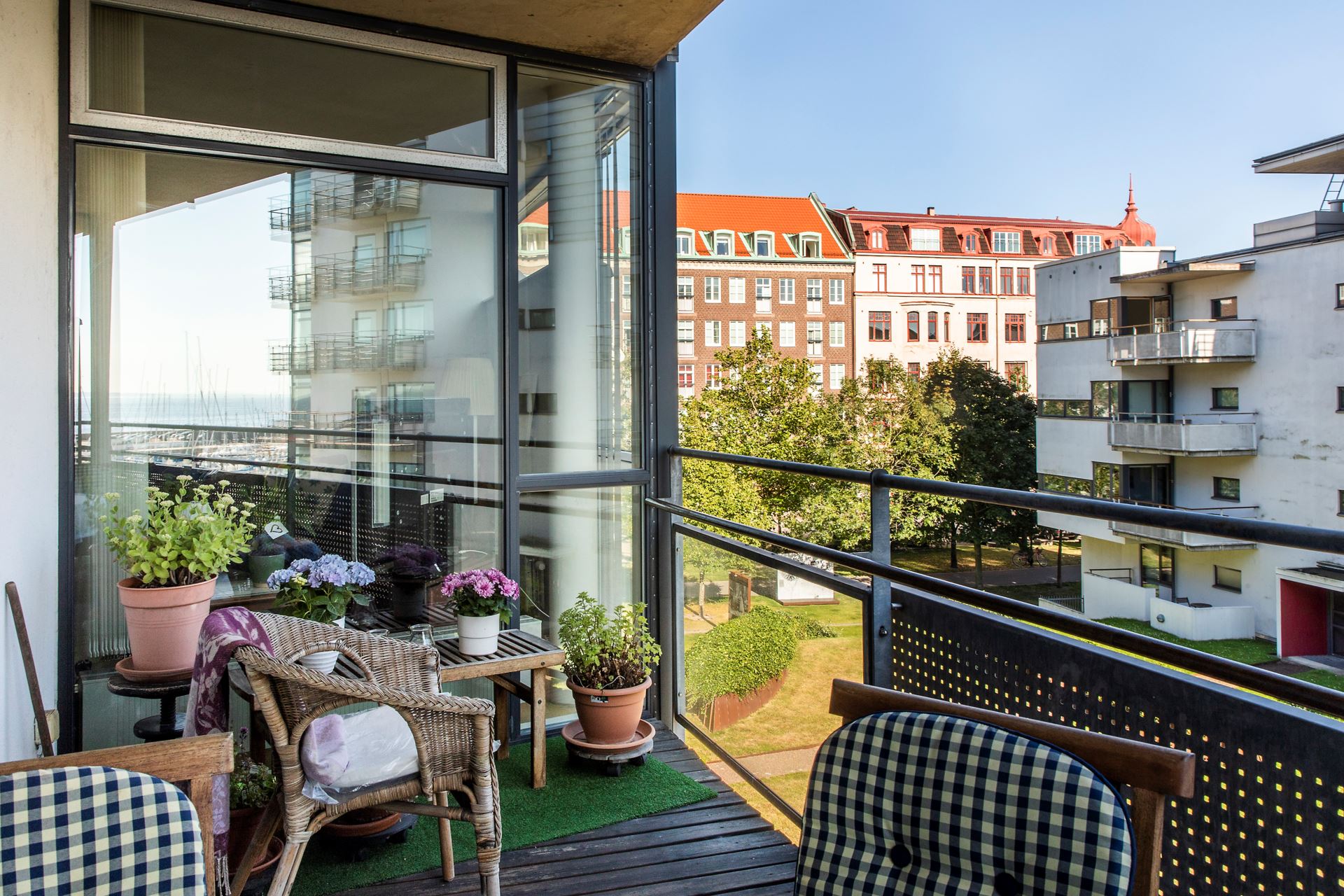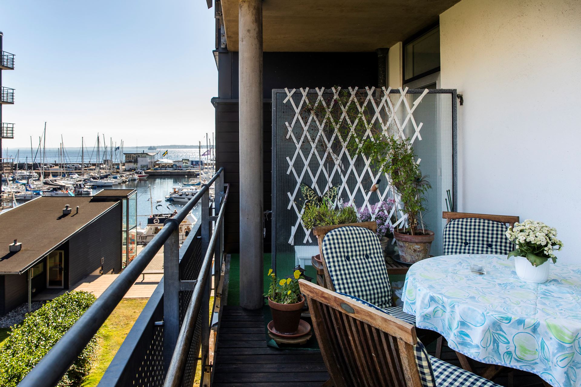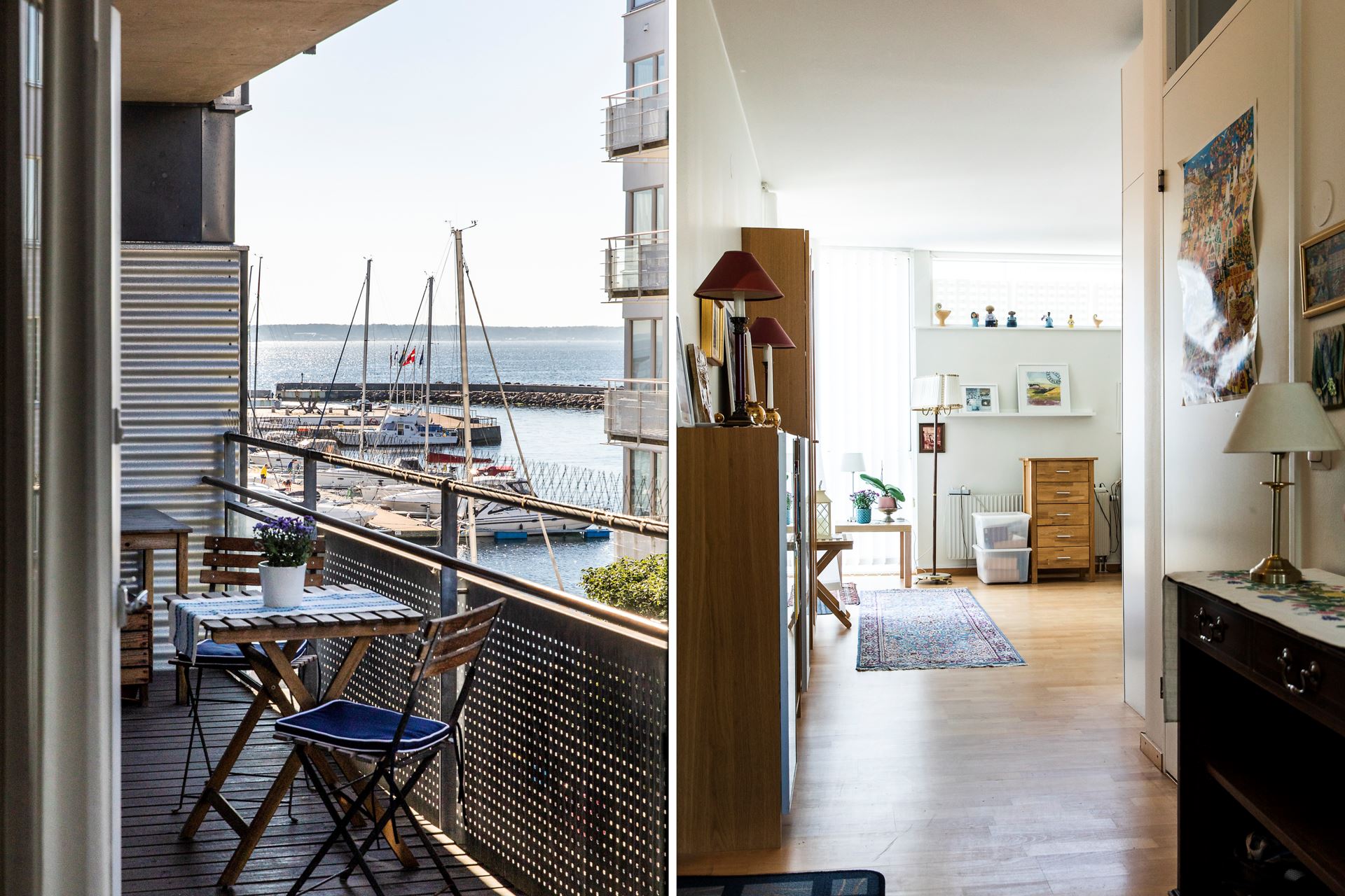 Det rymliga vardagsrummet erbjuder fina sociala sällskapsytor och det finns gott om plats för både soffgrupp, fåtöljer samt tv-möblemang. Den underbara balkongen med magnifik utsikt över Öresund och Danmark gör rummet till något alldeles extra. Här kan du med fördel njuta av morgonsolen från första parkett.