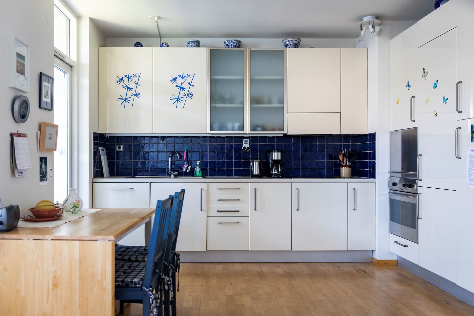 Bostadens kök är rymligt och har en öppen planlösning mot vardagsrummet. Köksinredning går i vitt och kompletteras av blått kakel ovanför bänkskivan. Fönster med vy över Öresund ger ett härligt ljusinsläpp.