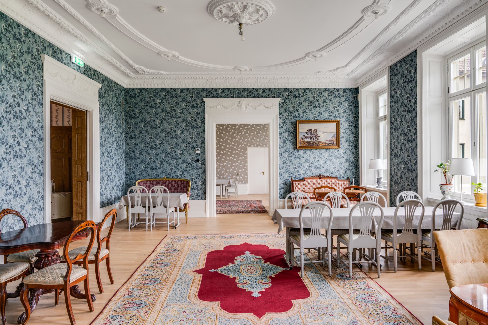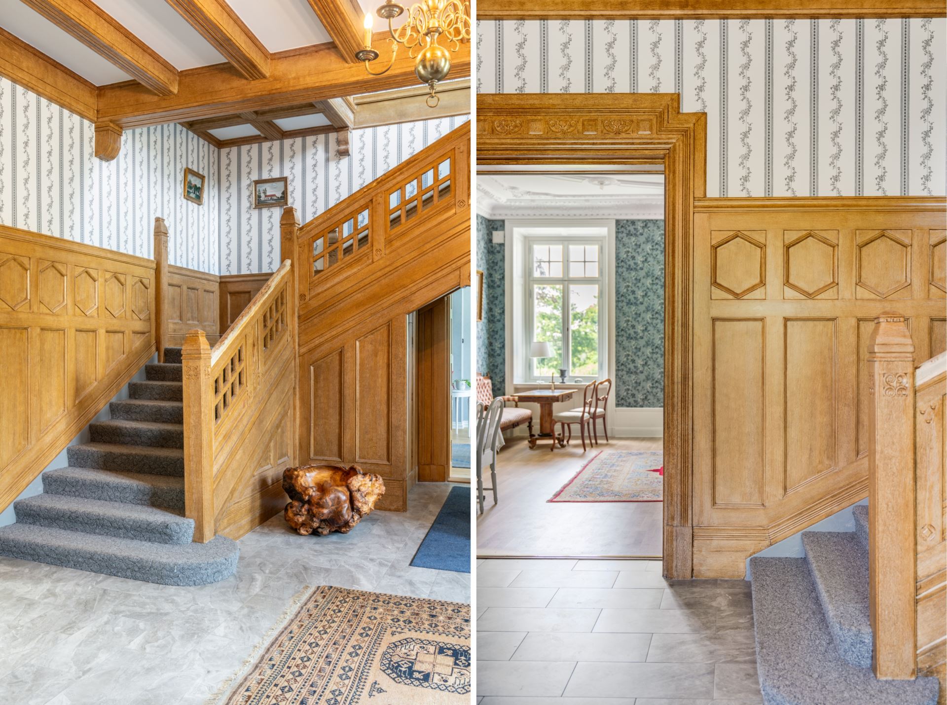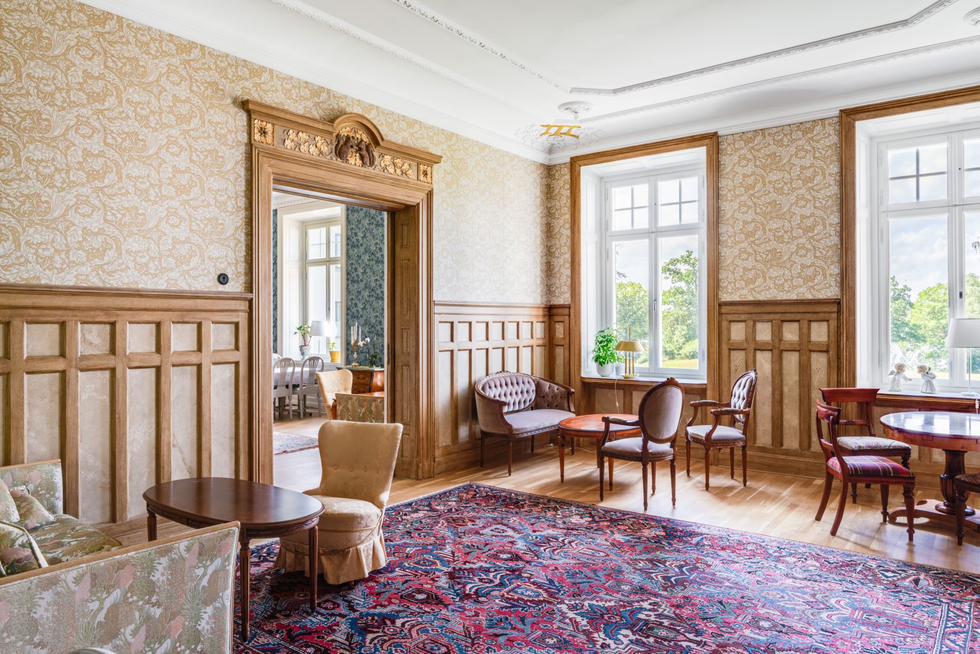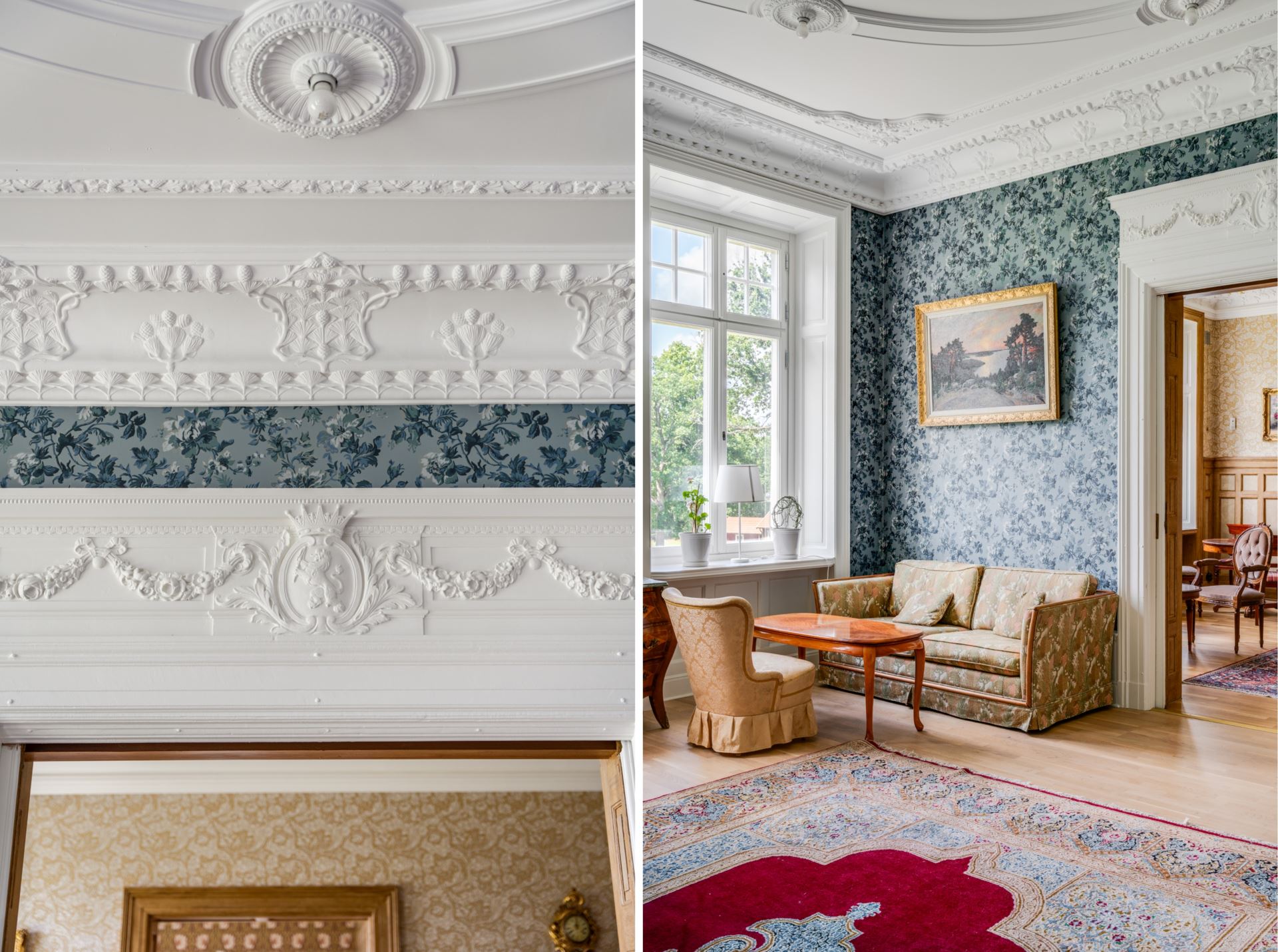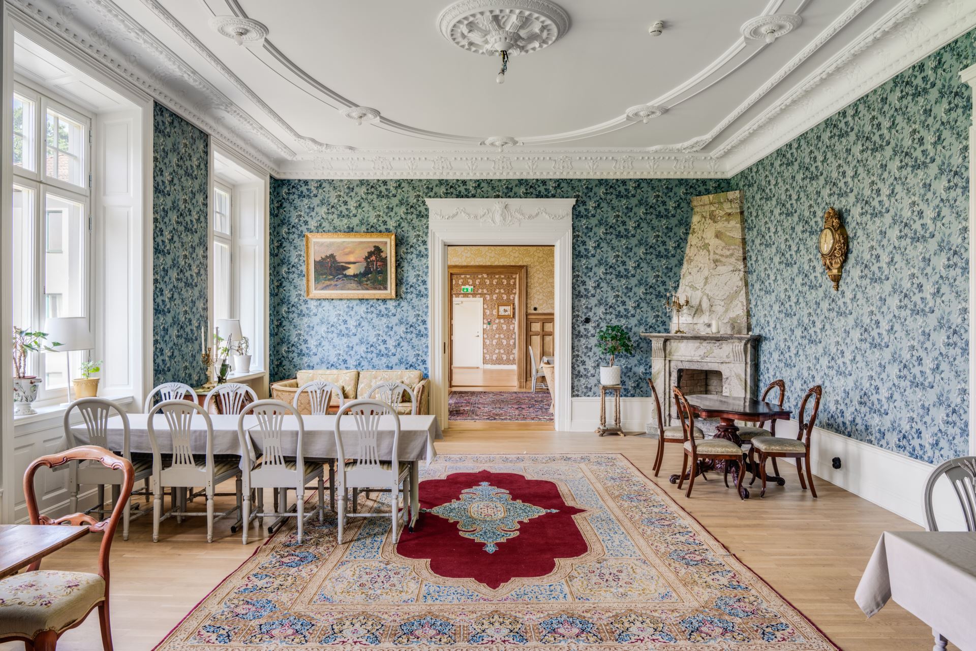 Entréplan med stora sällskapsytor, stuckaturer, väggpaneler, dekorerade lister och högresta fönster. Övre plan har 7 övernattningsrum med egna badrum.