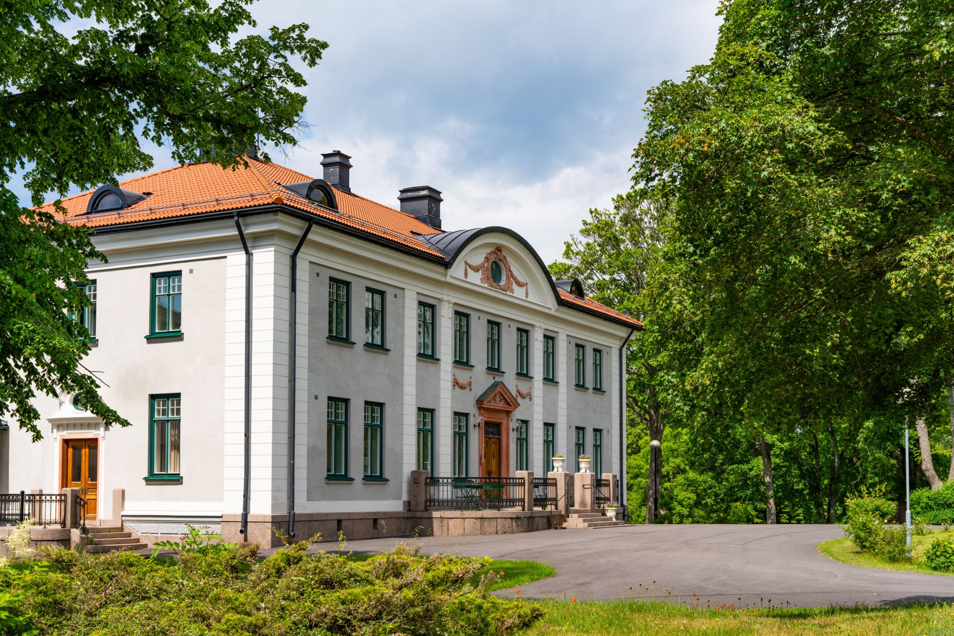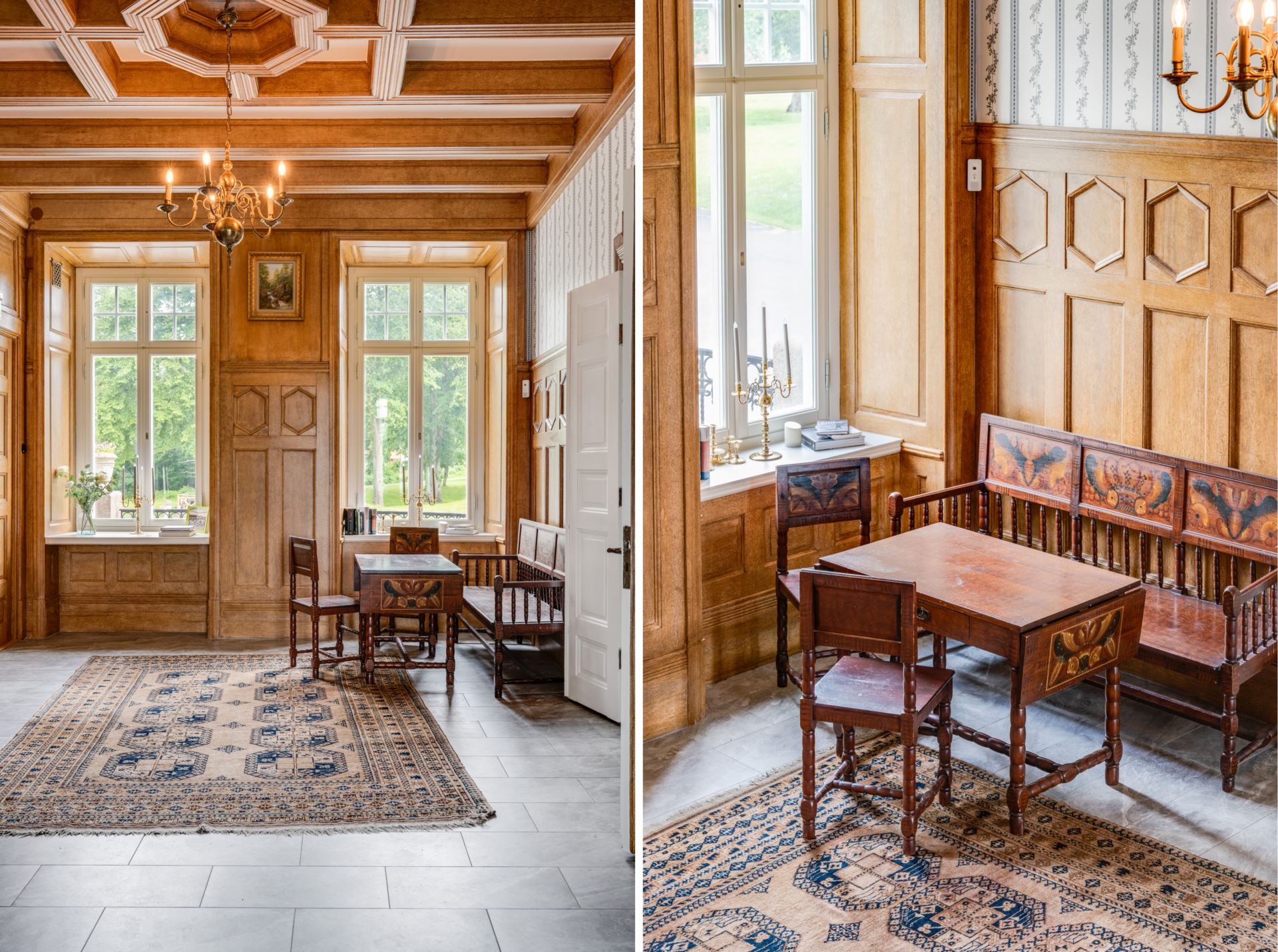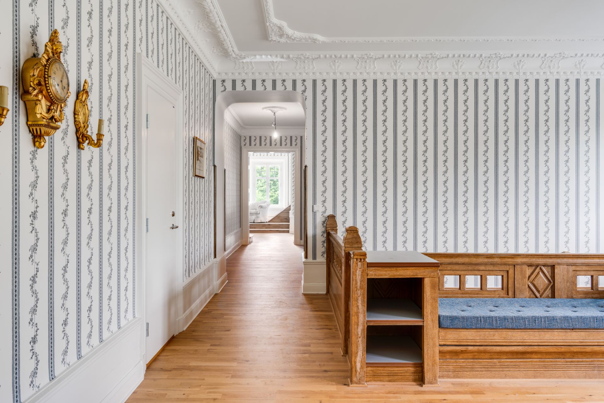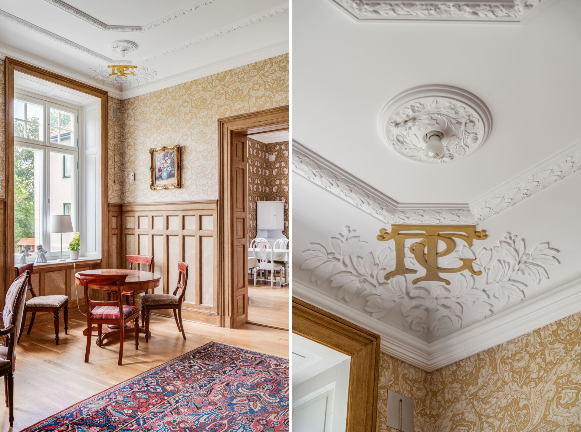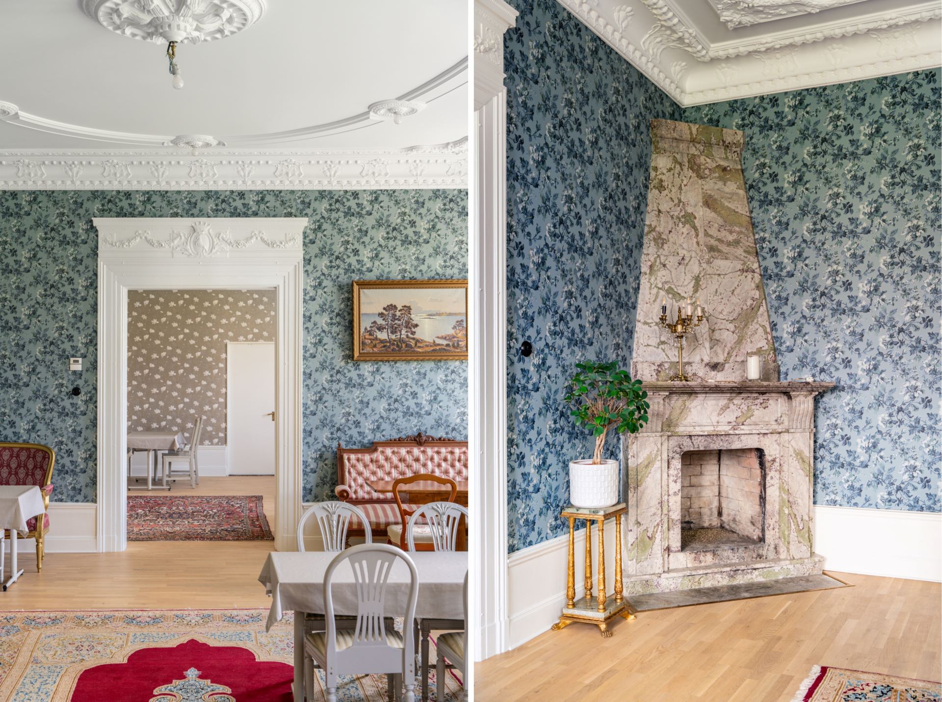 Entréplan med stora sällskapsytor, stuckaturer, väggpaneler, dekorerade lister och högresta fönster. Övre plan har 7 övernattningsrum med egna badrum.