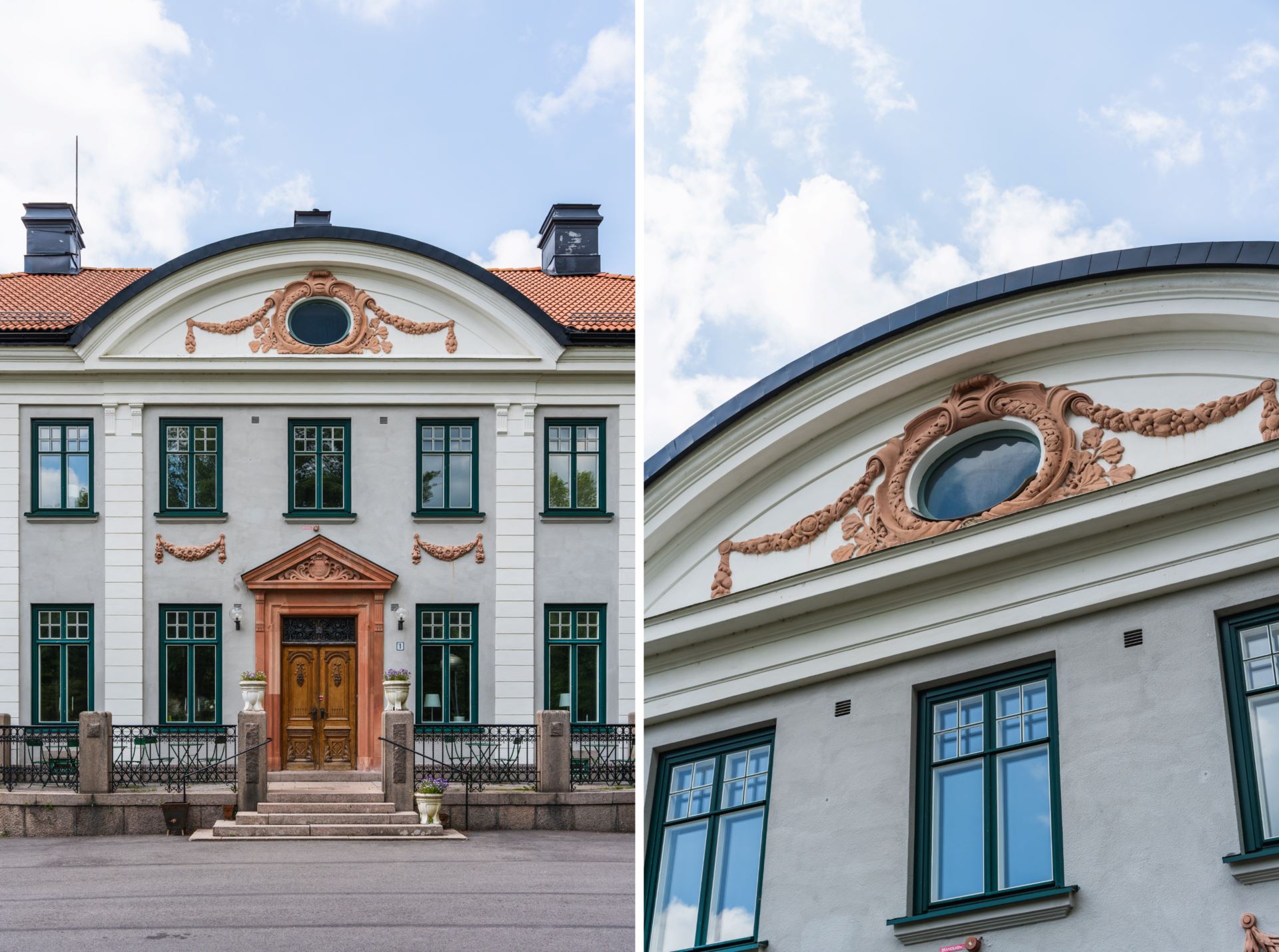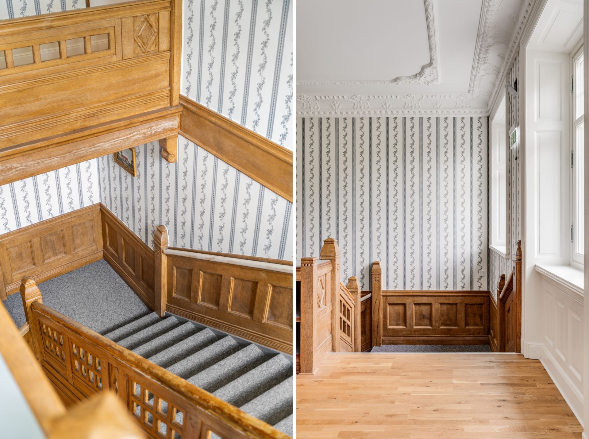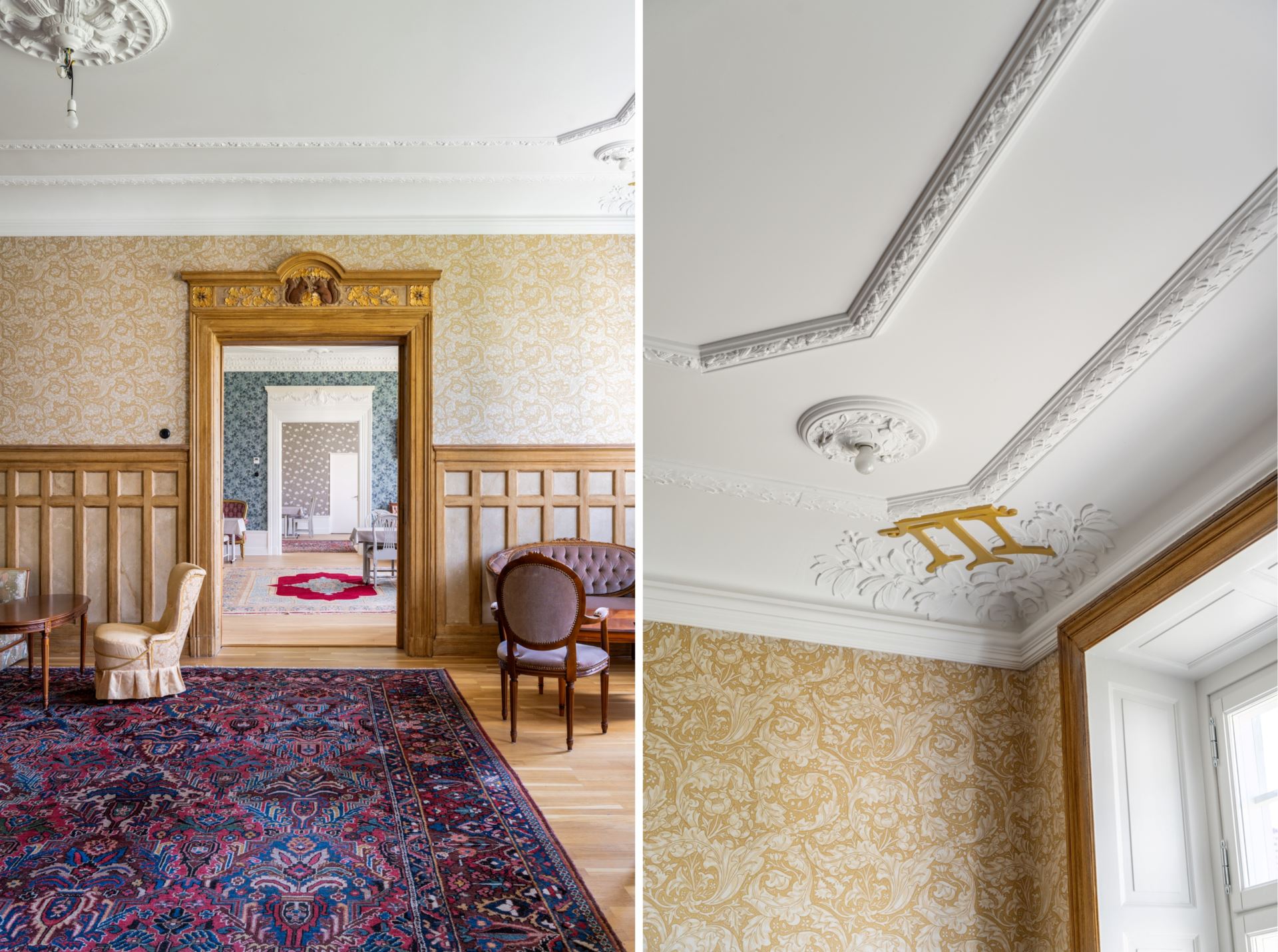Återskapande av stuckaturer och dekorationer i huvudbyggnaden samt ny ådringsmålning.