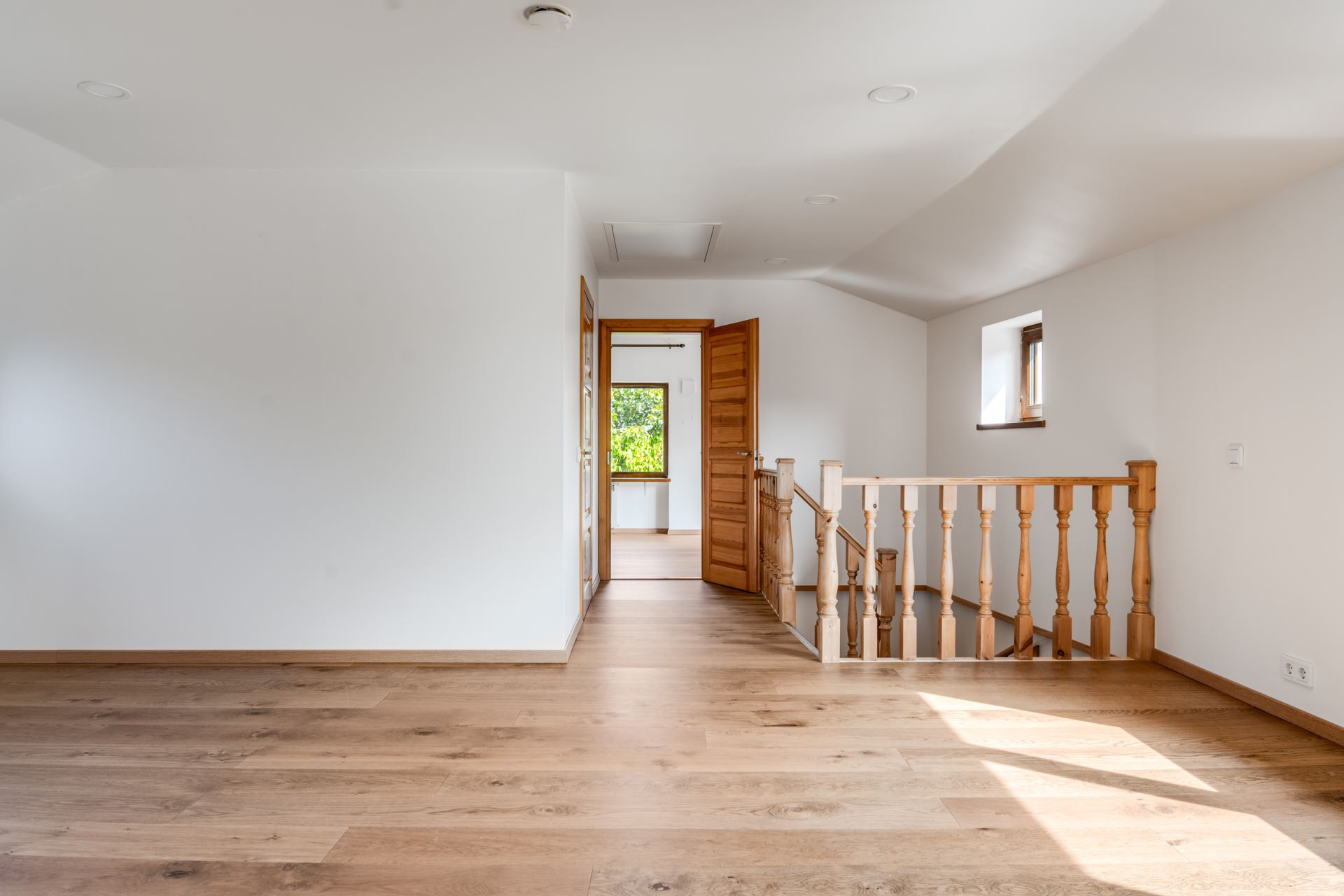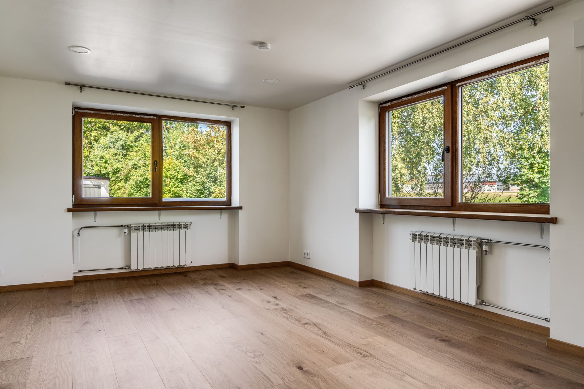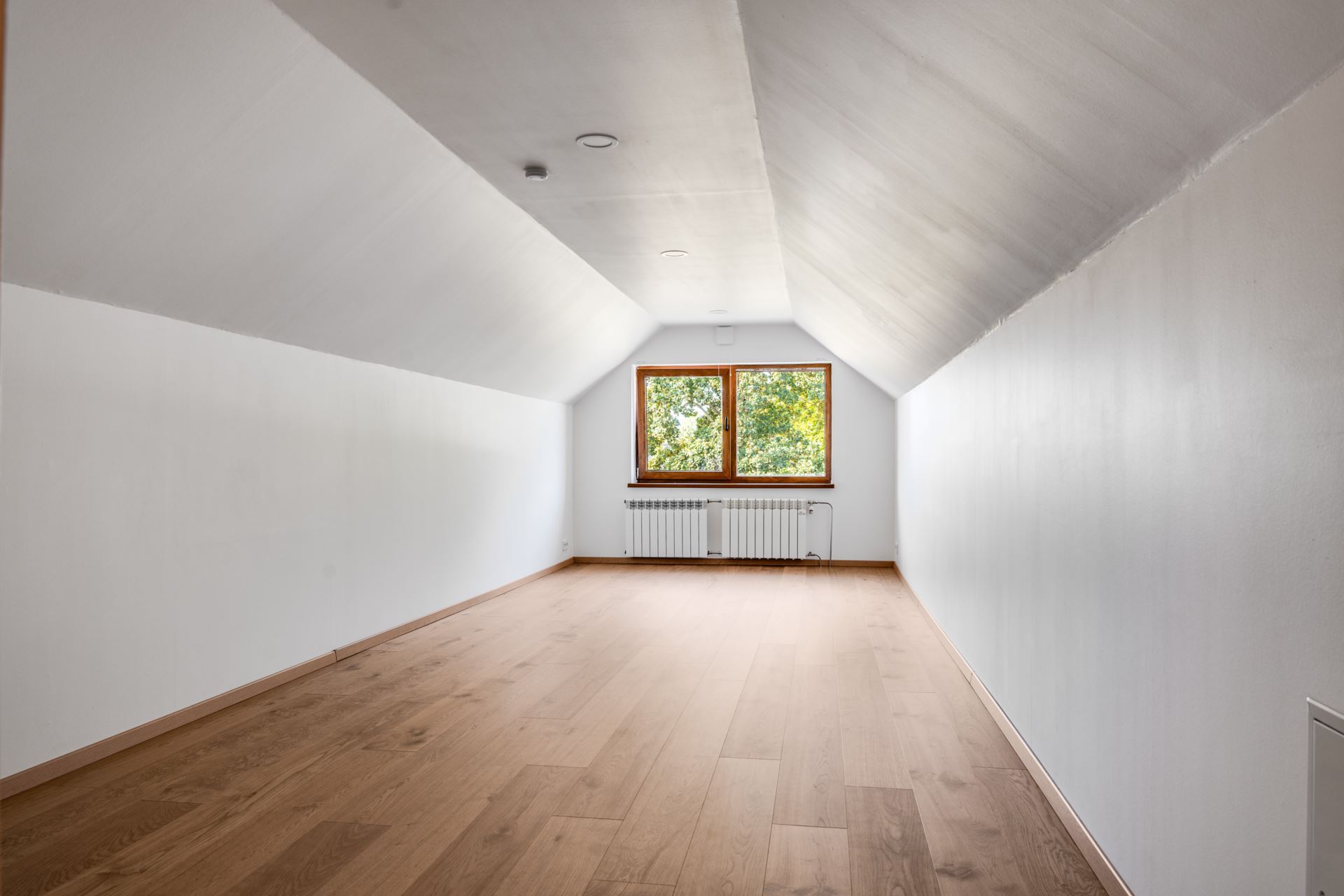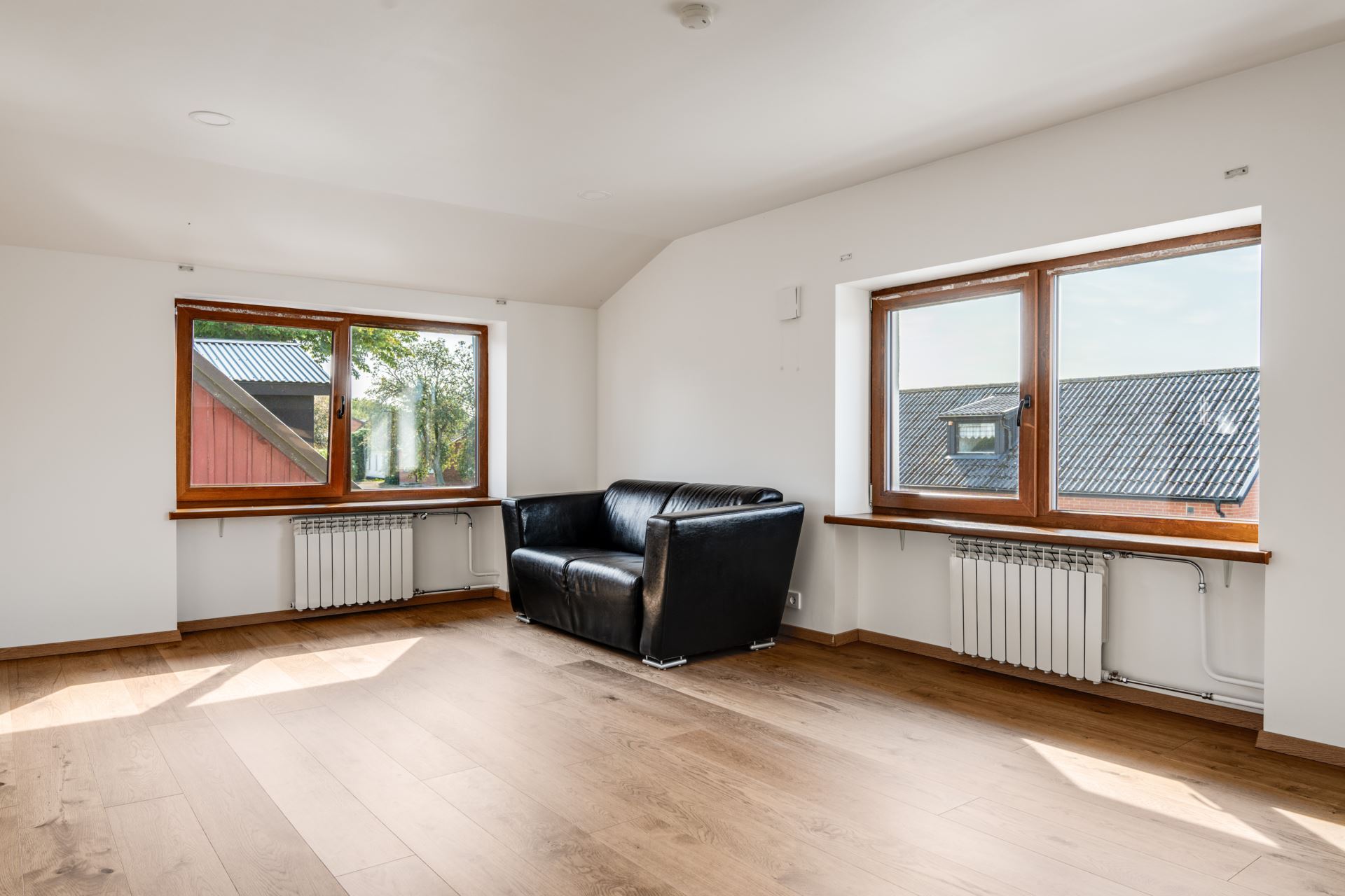 En trappa upp erbjuds vi ytterligare allrumskvadrat med enstavig parkett på golv i samspel med vita väggar och fantastiskt ljusinsläpp via fönsterparti.