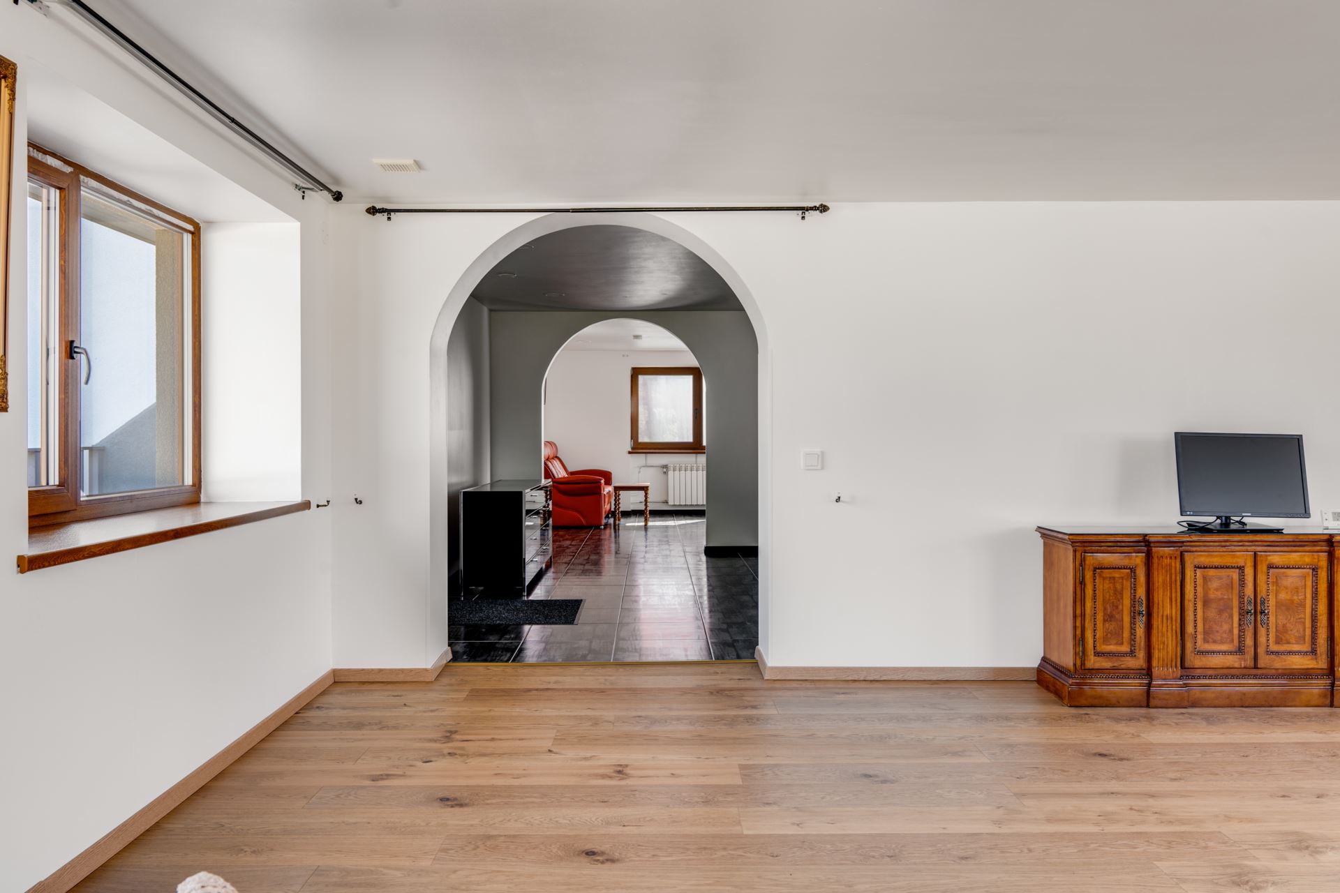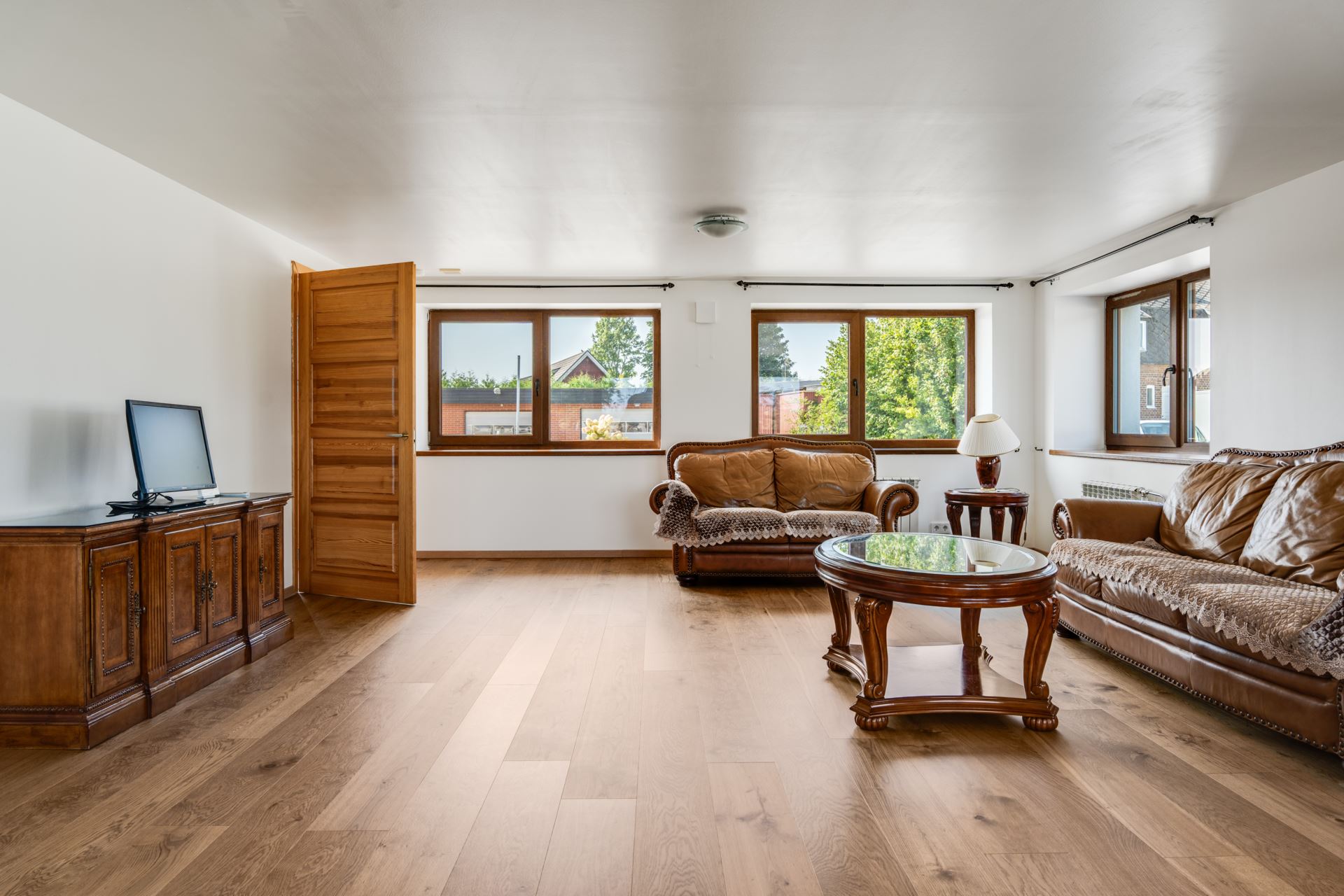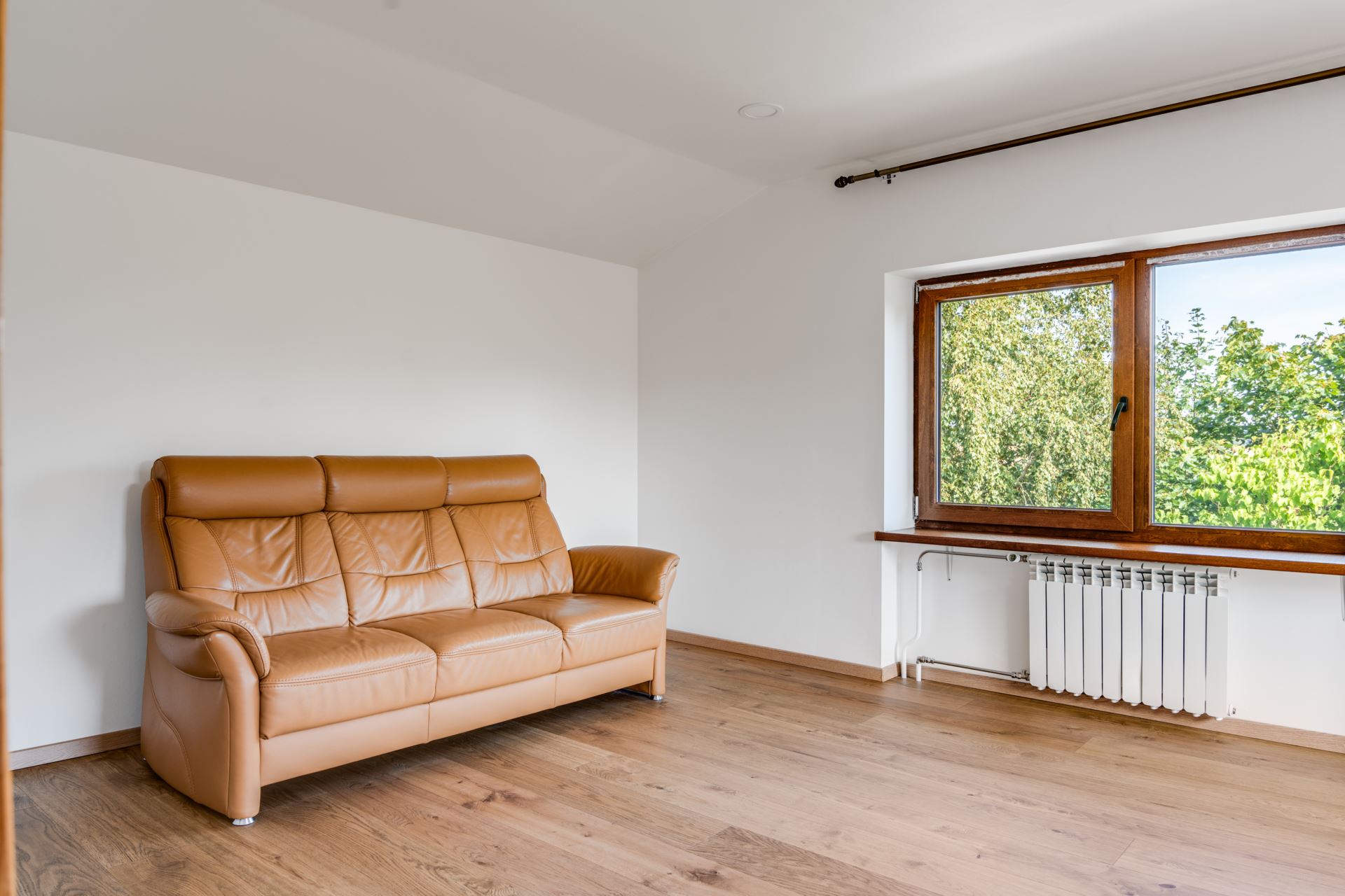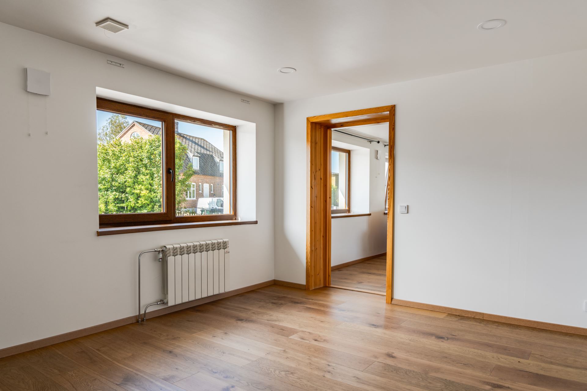 En trappa upp erbjuds vi ytterligare allrumskvadrat med enstavig parkett på golv i samspel med vita väggar och fantastiskt ljusinsläpp via fönsterparti.