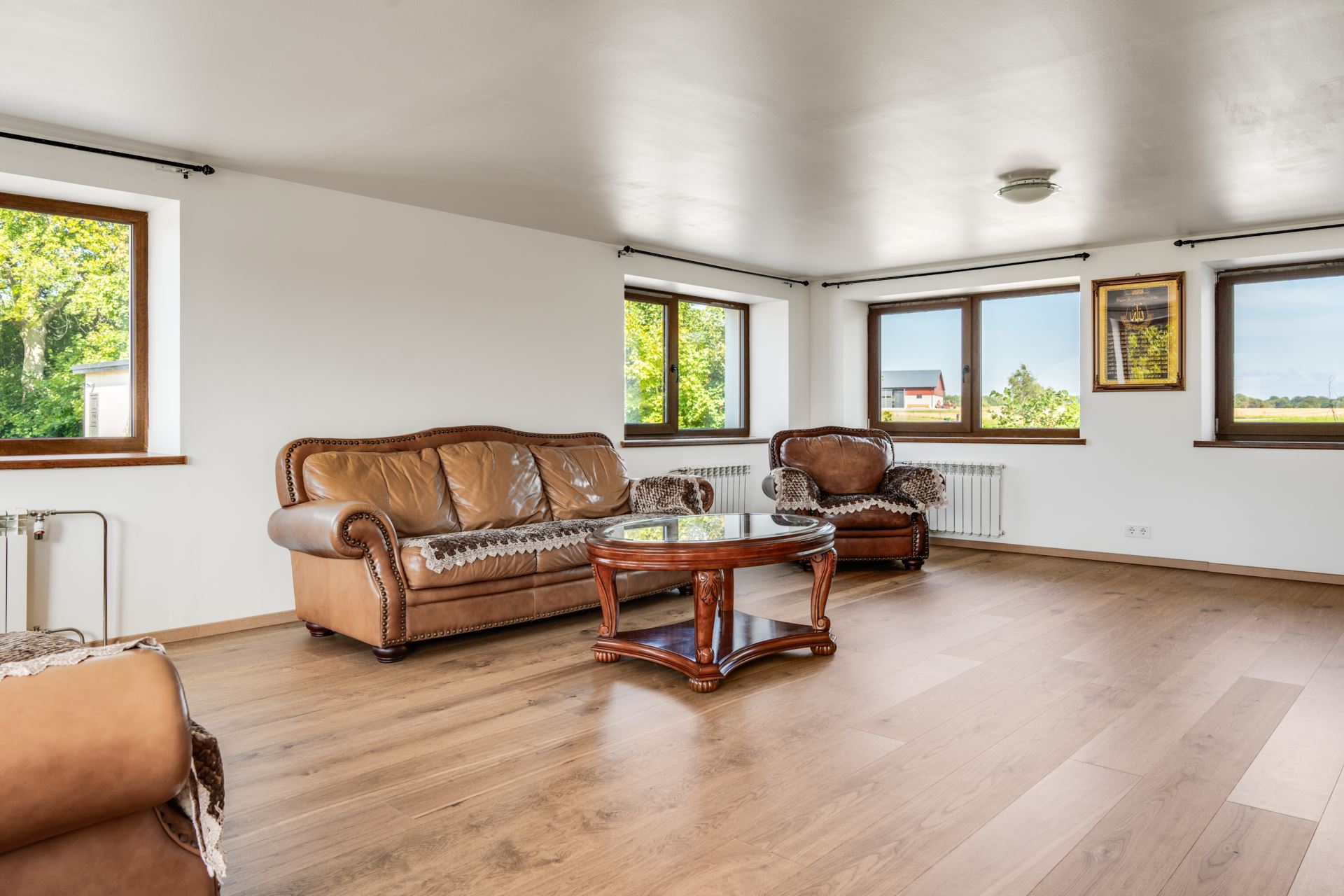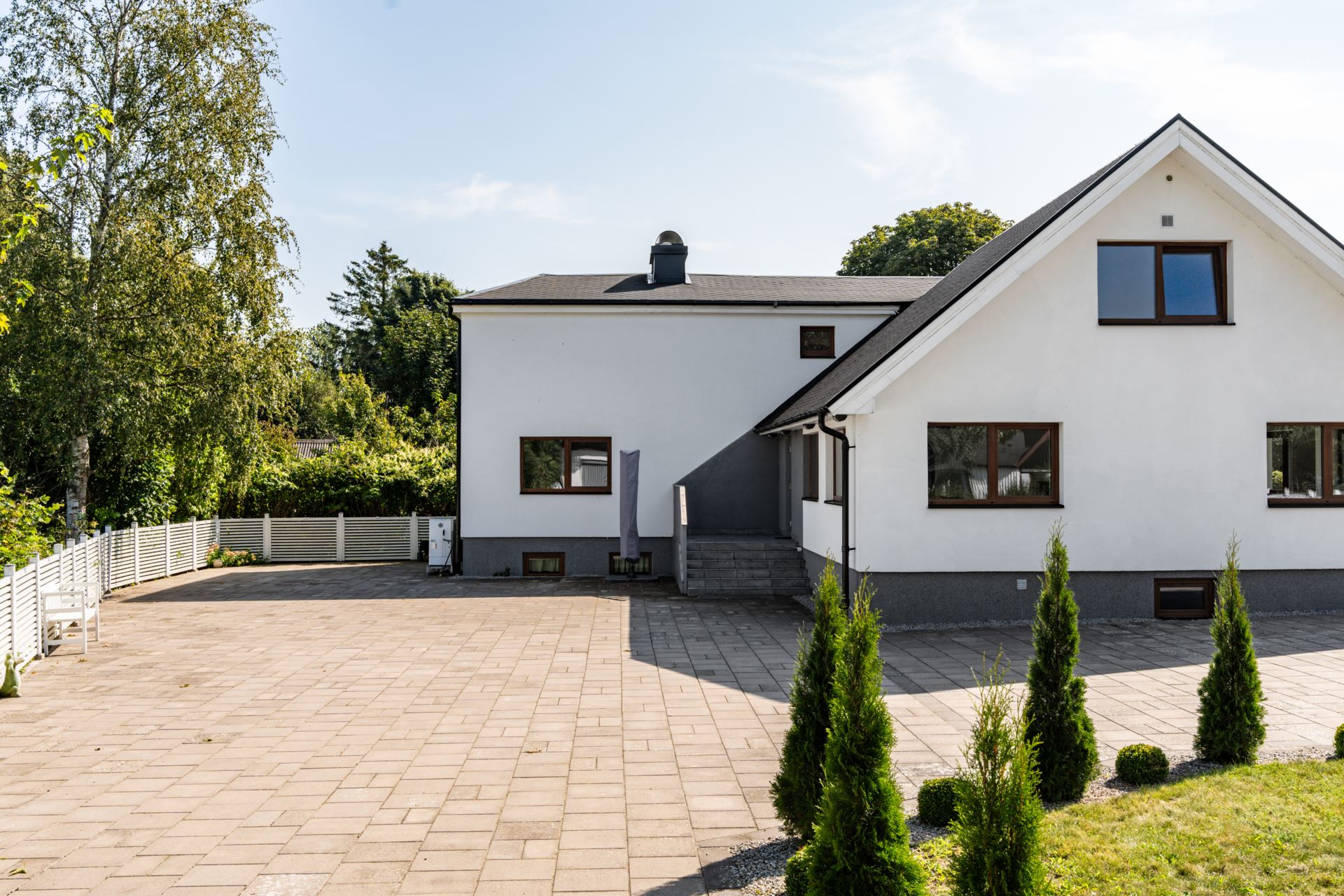 När du stiger in möts du av en känsla av rymd och ljus, tack vare enhetliga golv som sträcker sig över två plan. Tillsammans med klinkergolv i hall, kök och de båda smakfullt helkaklade badrummen skapar detta en perfekt balans mellan stil och funktionalitet. De öppna ytorna ger varje rum en harmonisk och rymlig atmosfär, oavsett om du befinner dig i det inbjudande vardagsrummet, det stora och smakfullt inredda köket eller något av de fem rymliga sovrummen.