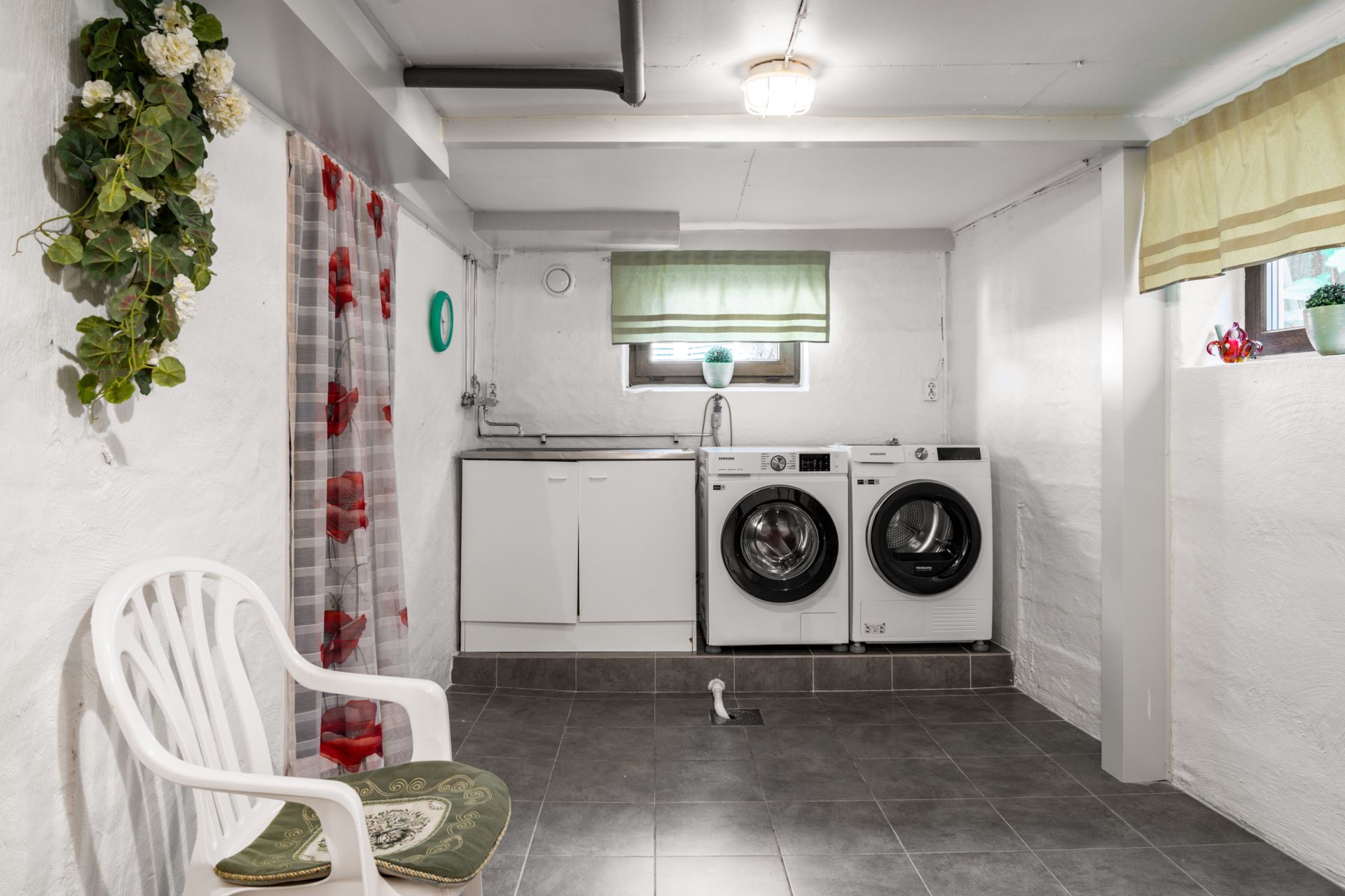 Tvättstugan finns placerad i källaren och är inredd med grå klinker på golv och målade väggar i vitt samt ljusbringande fönsterpartier. Här finns vask, tvättmaskin och torktumlare Samsung ca 1 år gamla.