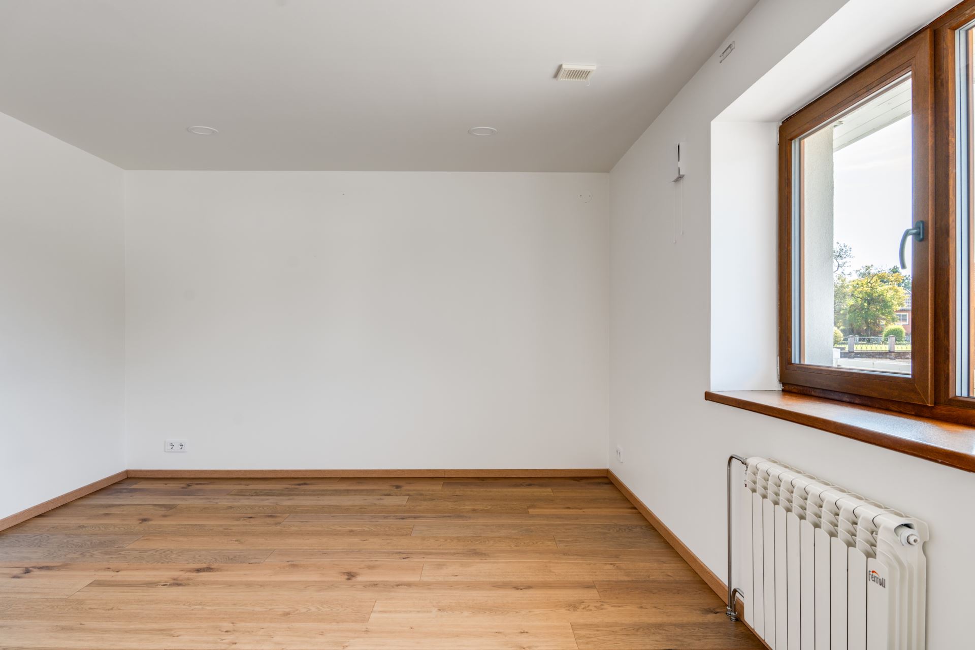 Entréplanets två sovrum förser oss med enhetlig interiör med enstavig parkett på golv, vita väggar och ljusbringande fönsterpartier. Den vida kvadraten möjliggör för både dubbelsäng och tillhörande möblemang.