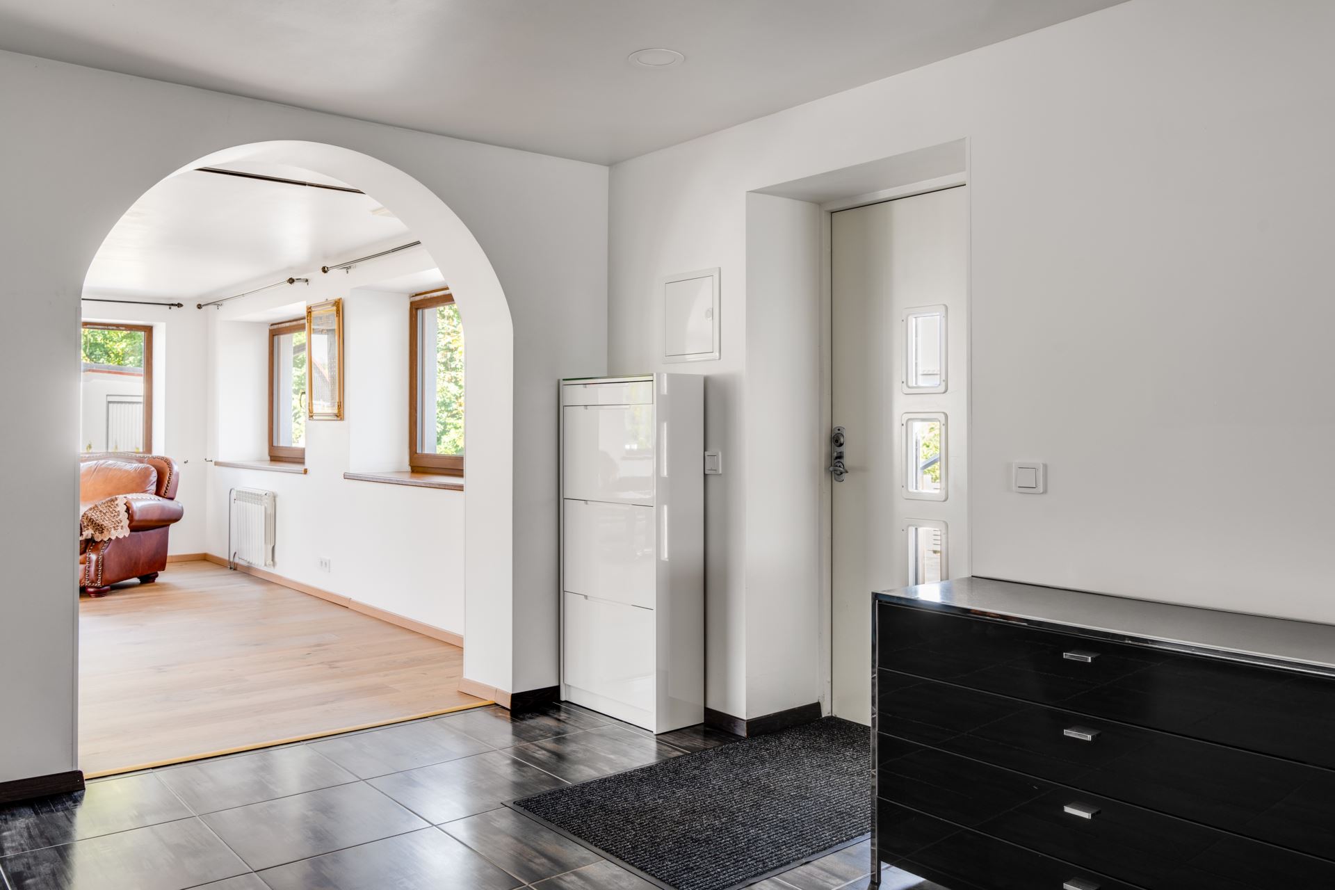 Hallen är inbjudande med fint ljusinsläpp genom ytterdörrens fönsterparti. Mörk klinker på golv samspelar med väggar i vitt med valv. Goda avhängnings möjligheter finns.