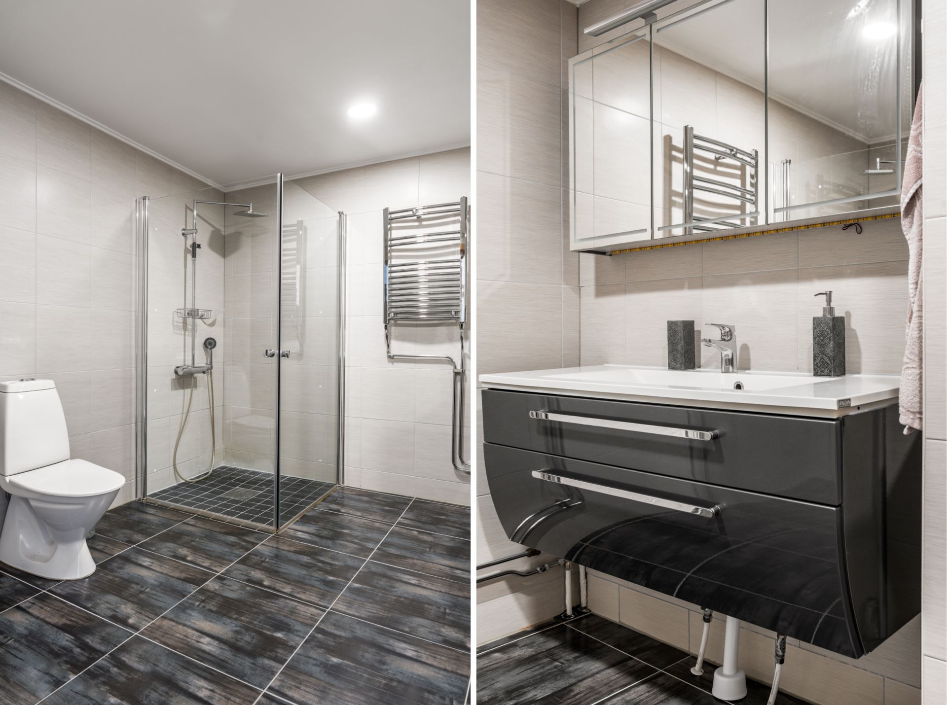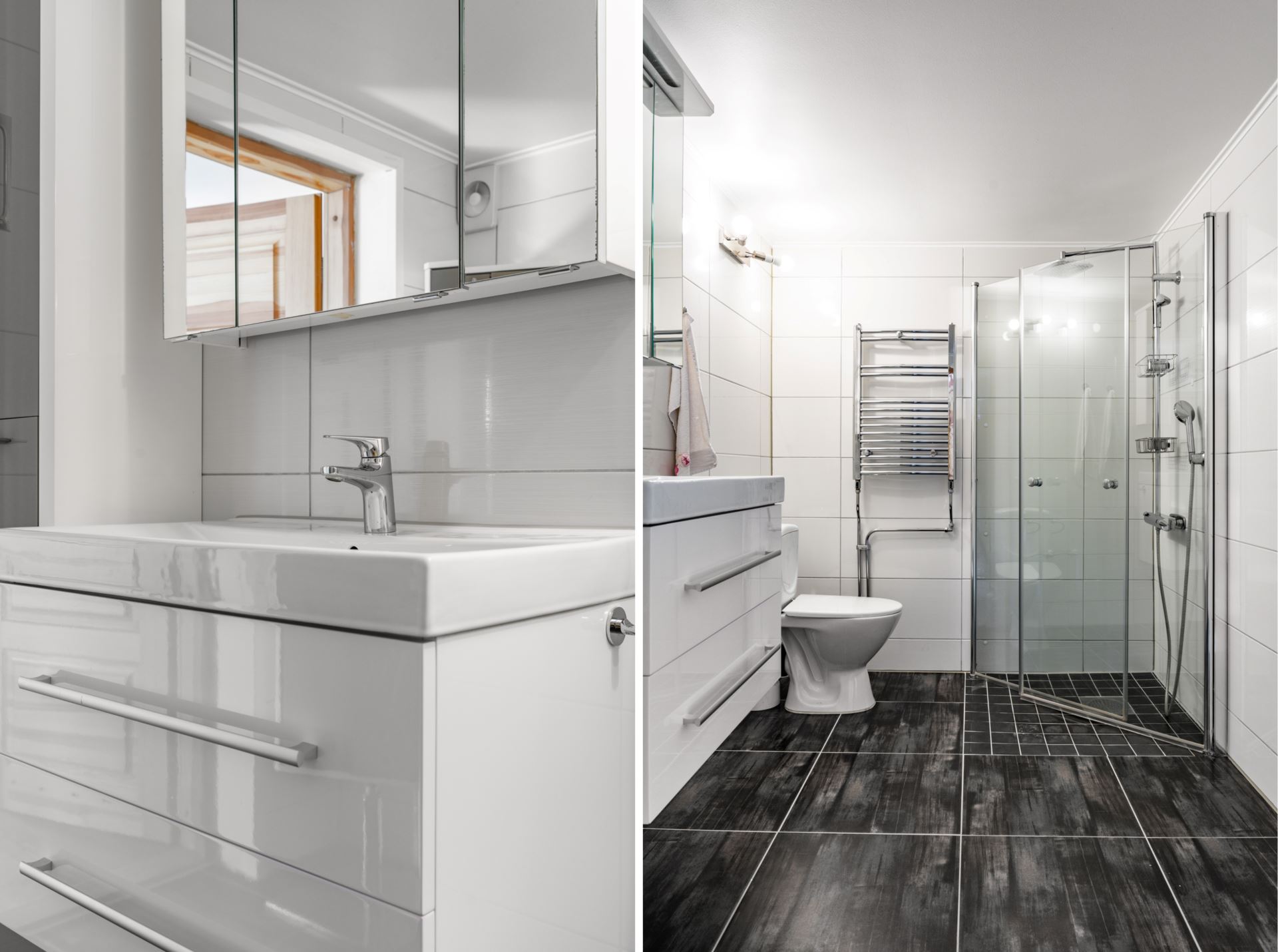 Det första badrummet är i helkaklat utförande med enhetlig klinker liksom i hall och vitt kakel på väggar. Här finns wc, handfat med vit kommod, spegelskåp, handdukstork och dusch med vikdörrar i klarglas