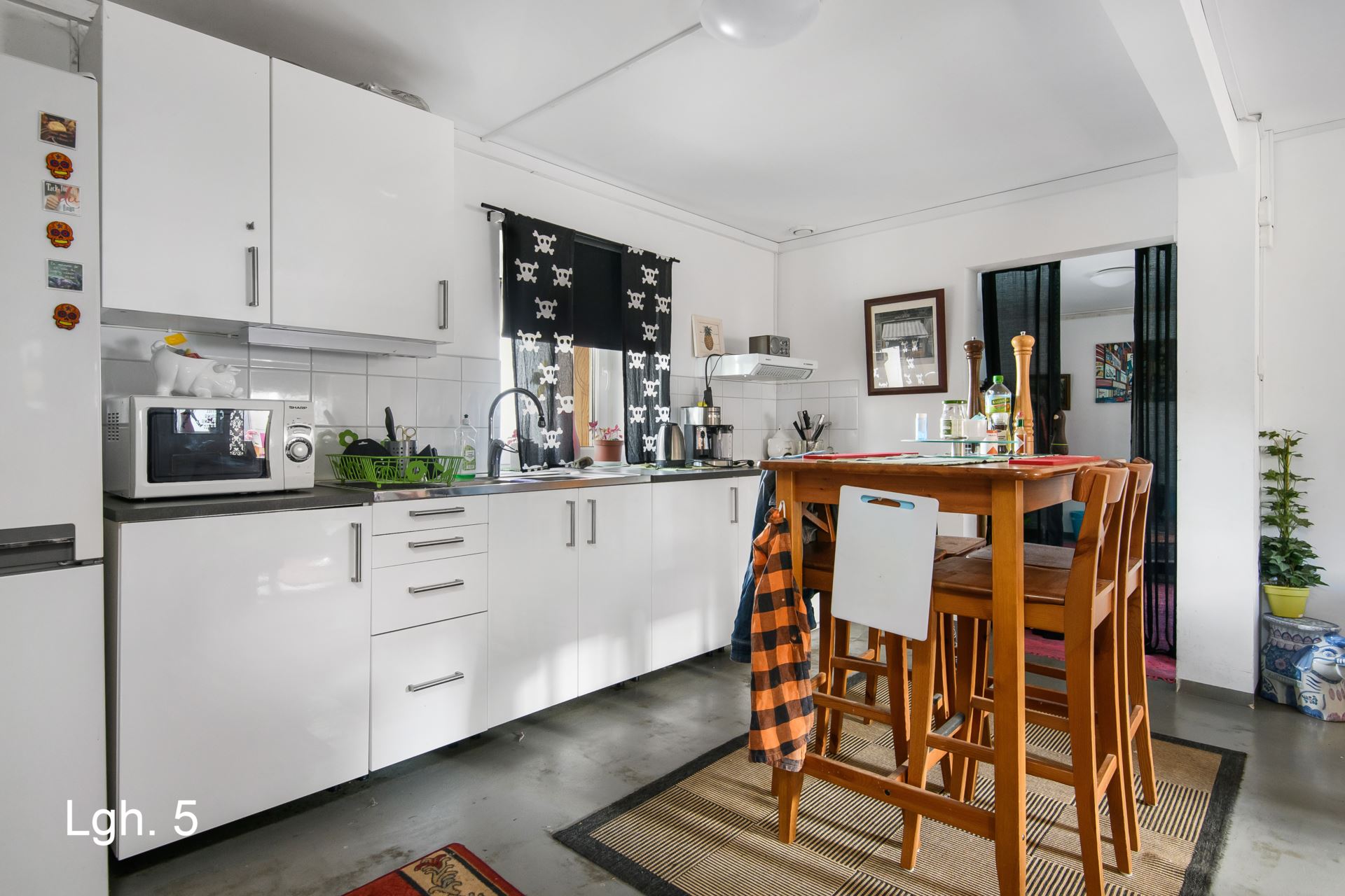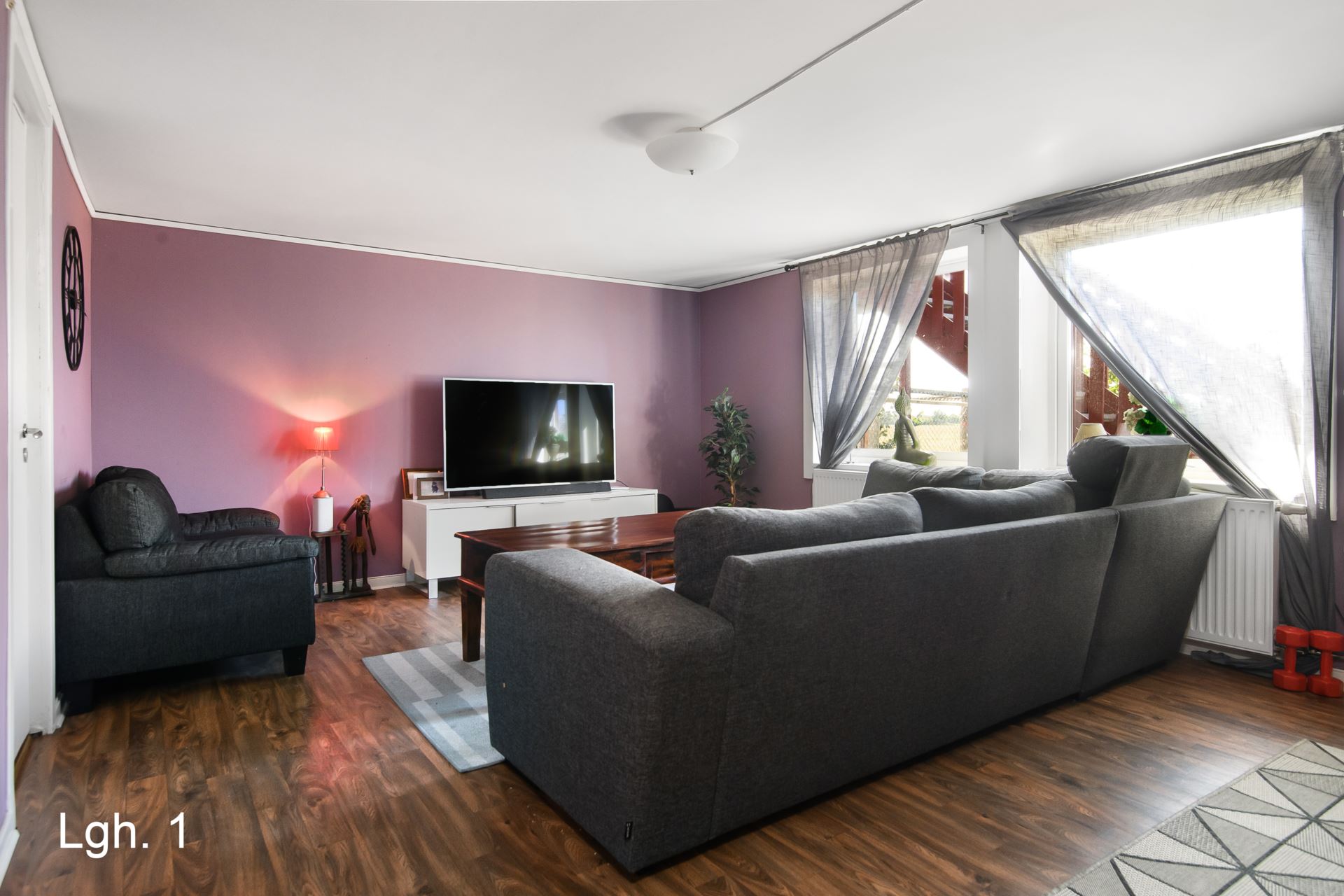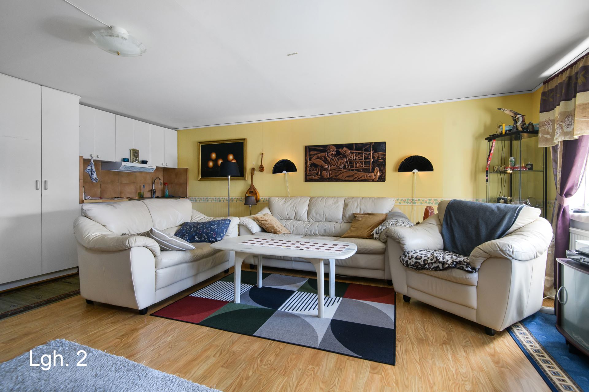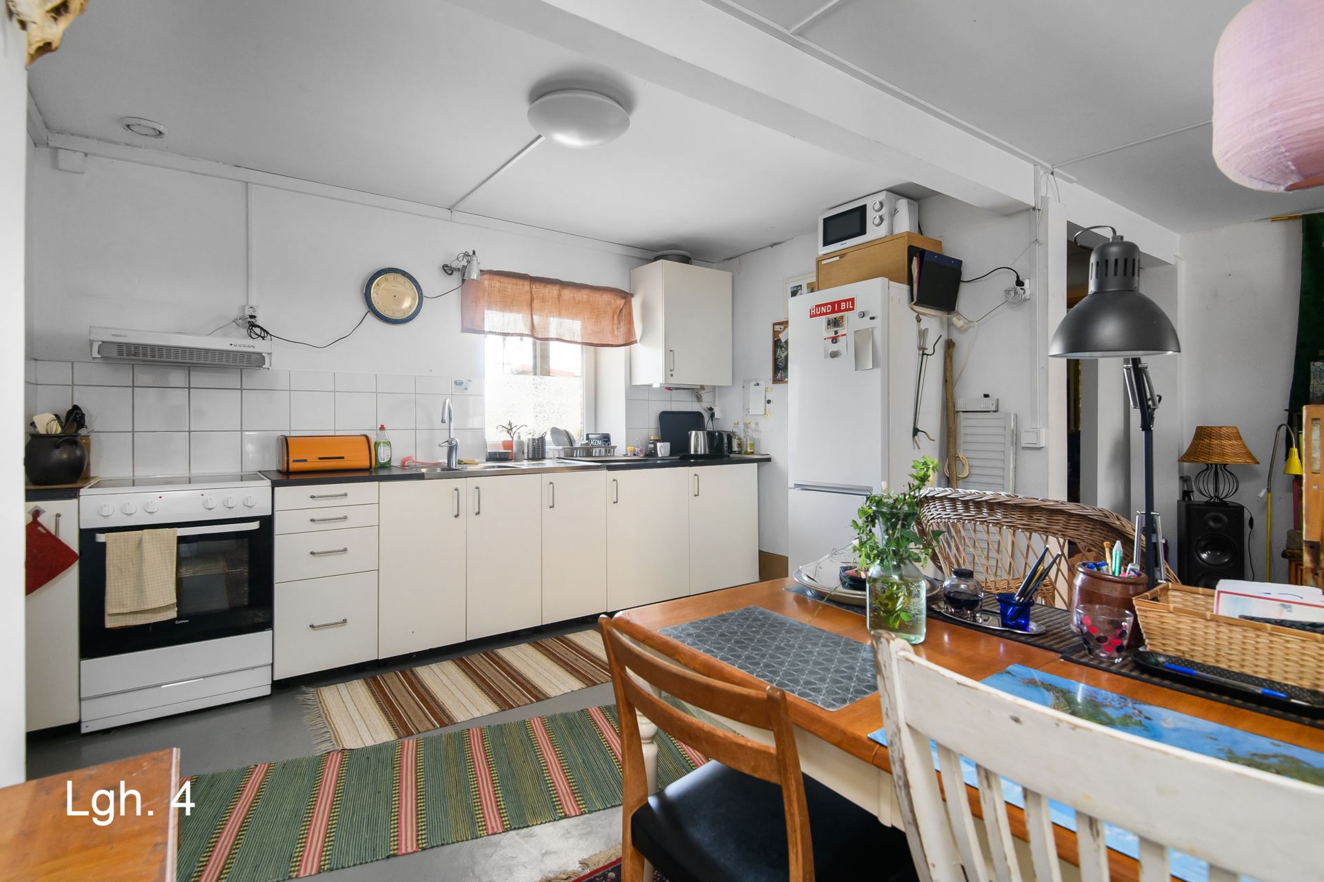 Länga i två plan med totalt fem lägenheter där två idag är sammanslagna. Bottenvåning med två tvårumslägenher samt en trerummare. Övre plan med två vindsvåningar om två rum. I gott bruksskick. Nedre plan B -lgh 1 - tvårummare om 73,4 kvm - hyra 6700 kr A - lgh 2 - stor lägenhet om 217kvm i två plan ( två sammanslagna lägenheter som kan delas) - hyra 14576 kr Övre plan C- lgh 3 - tvårummare om 75 kvm - hyra 6700 kr Övre plan D- lgh 4 - tvårummare om 85 kvm - hyra 6700 kr