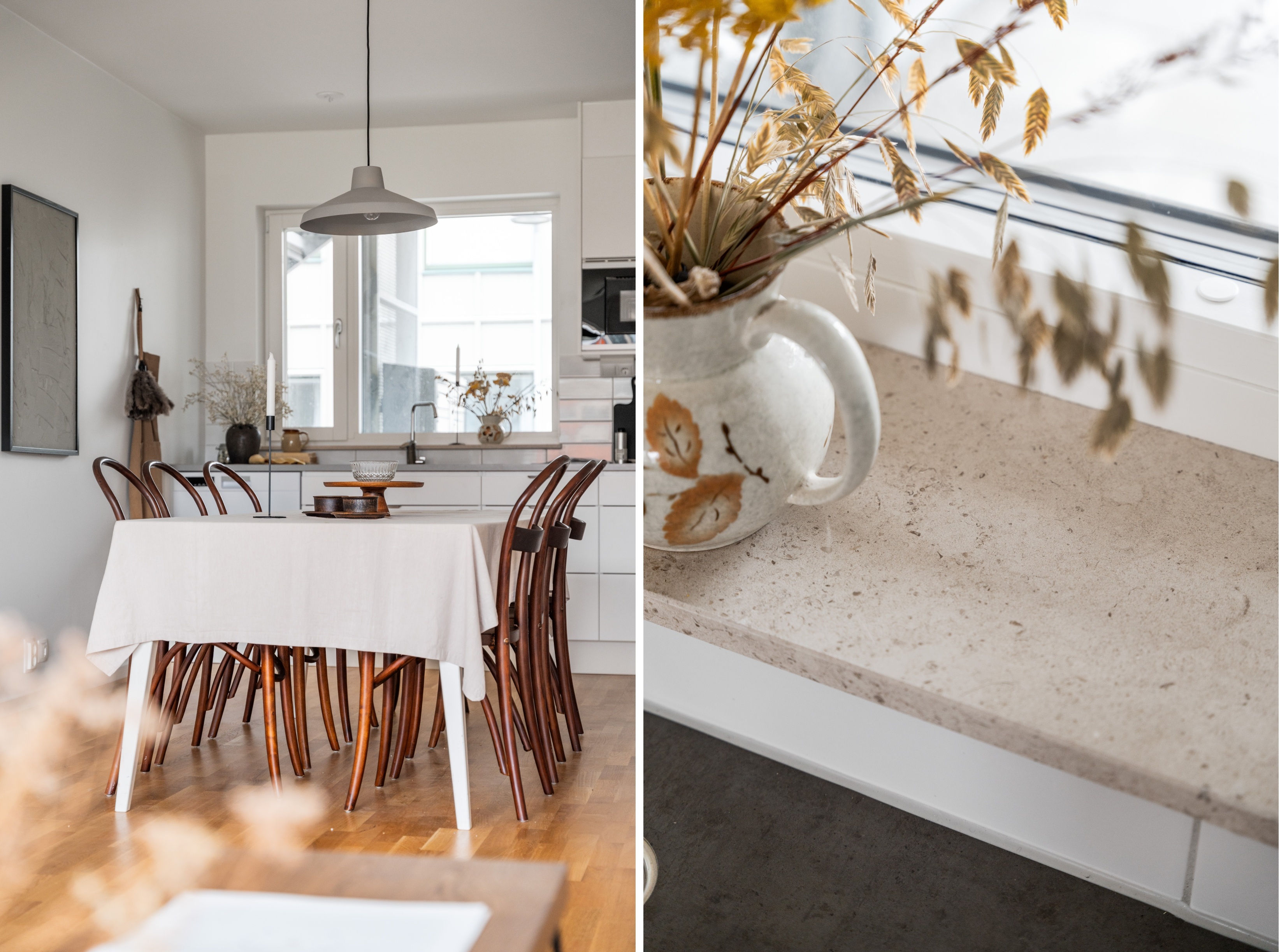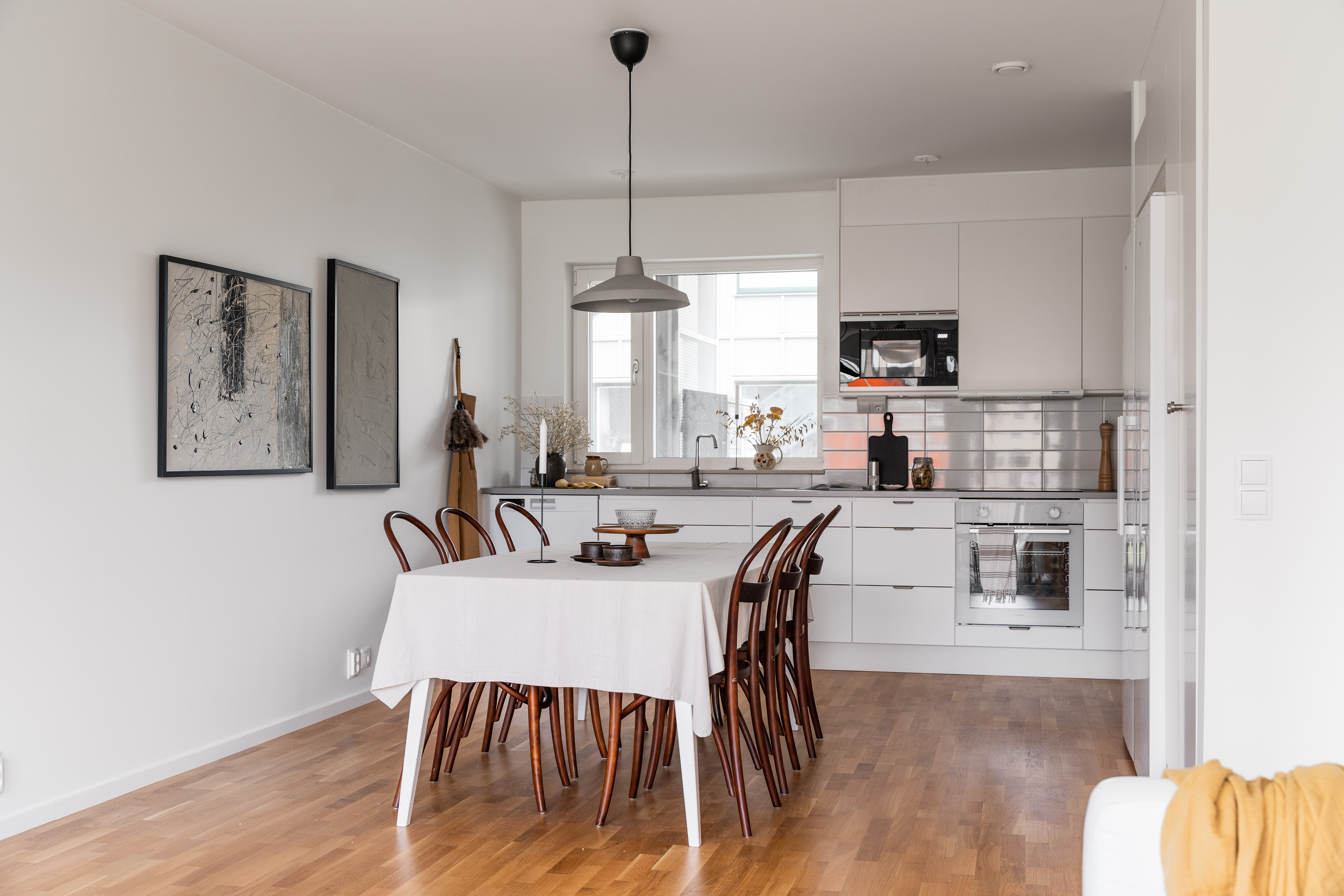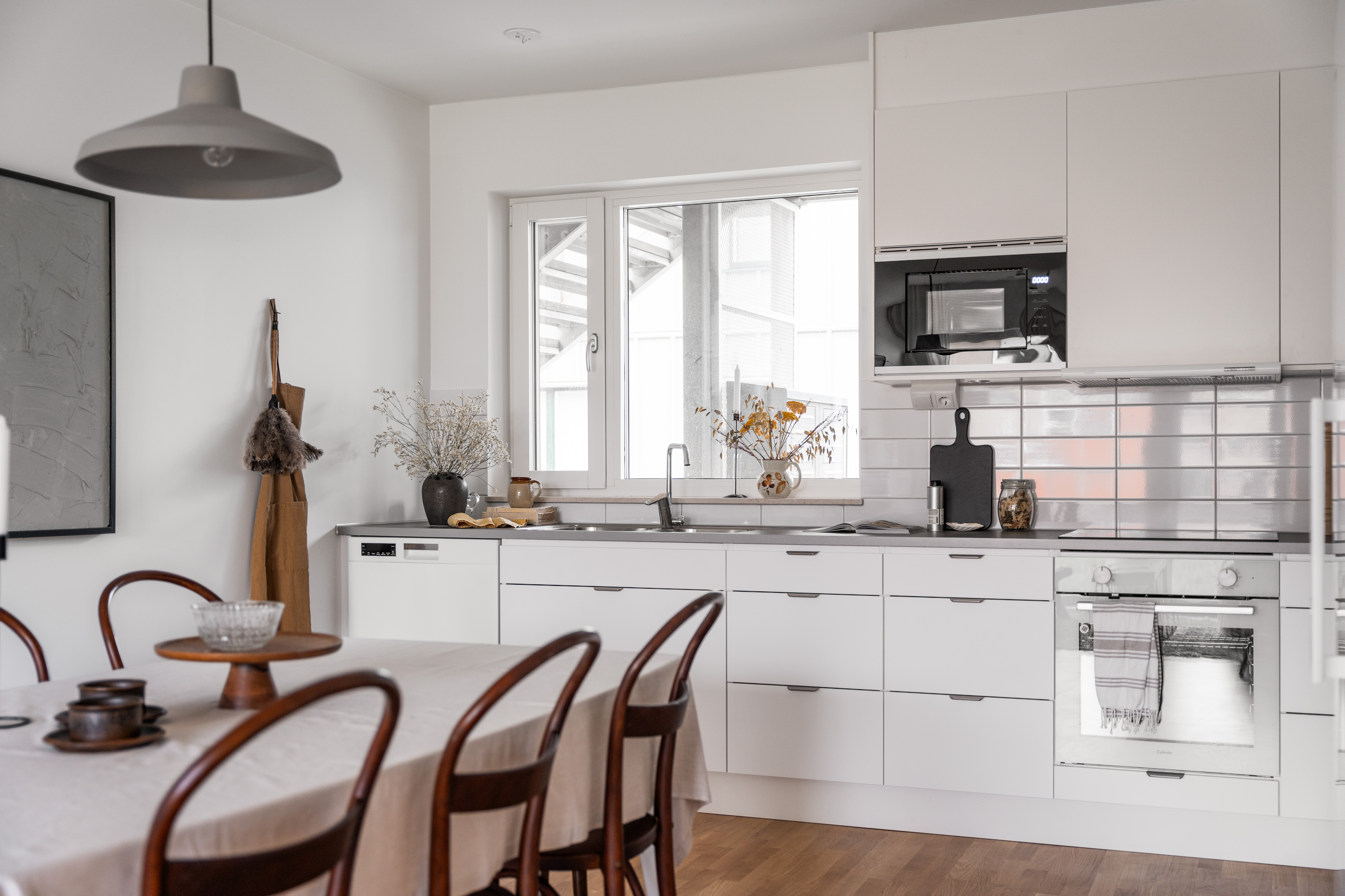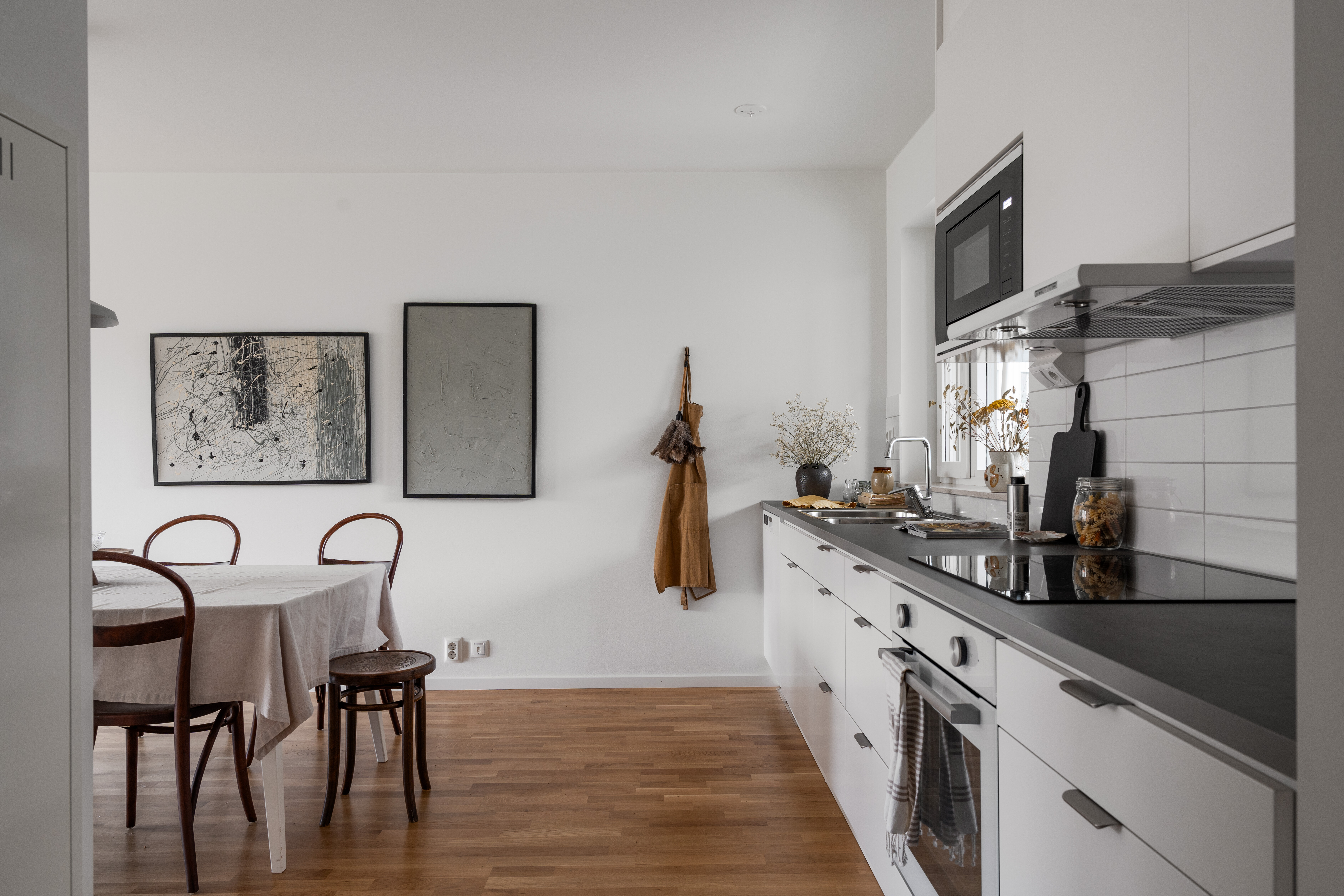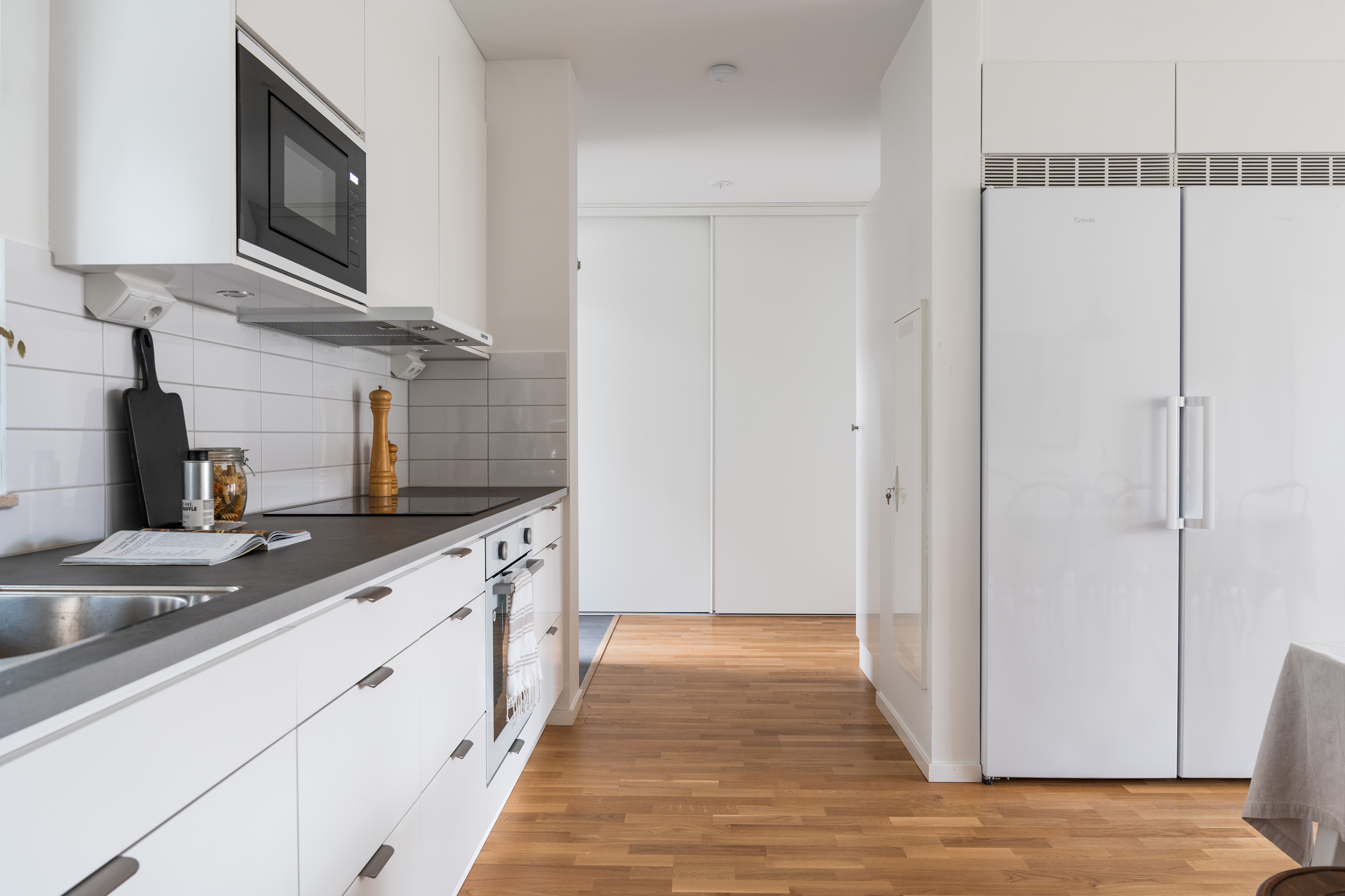 Golv: Parkett Väggar: Vitmålat, stänkskydd av kakel Tak: Vitmålat Maskiner: Kyl och frys, spishäll induktion, inbyggnadsugn och mikrovågsugn i högskåp, diskmaskin Inredning: Bänkskiva i laminat och fabriksmålade luckor