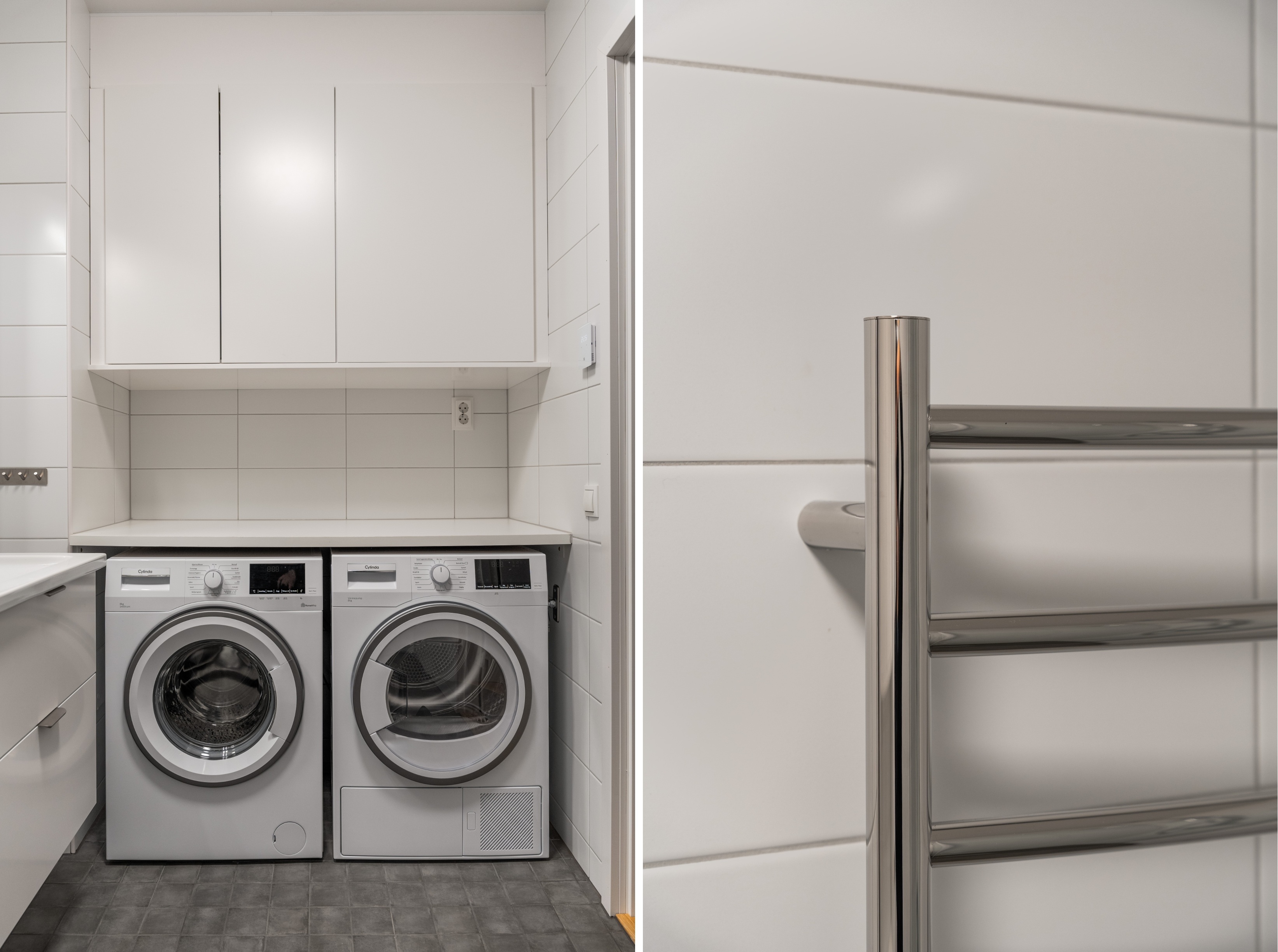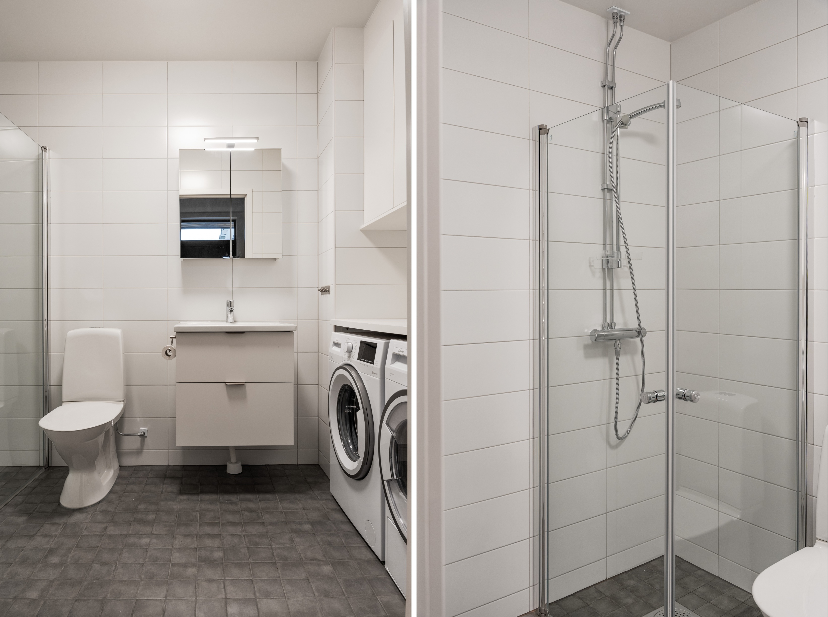 Golv: Klinker Väggar: Helkaklat Tak: Vitmålat Övrigt: Toalettstol, kommod, spegel, duschvägg, toalettpappershållare och handukskrokar. Tvättmaskin och torktumlare, laminatbänkskiva ovan maskiner.