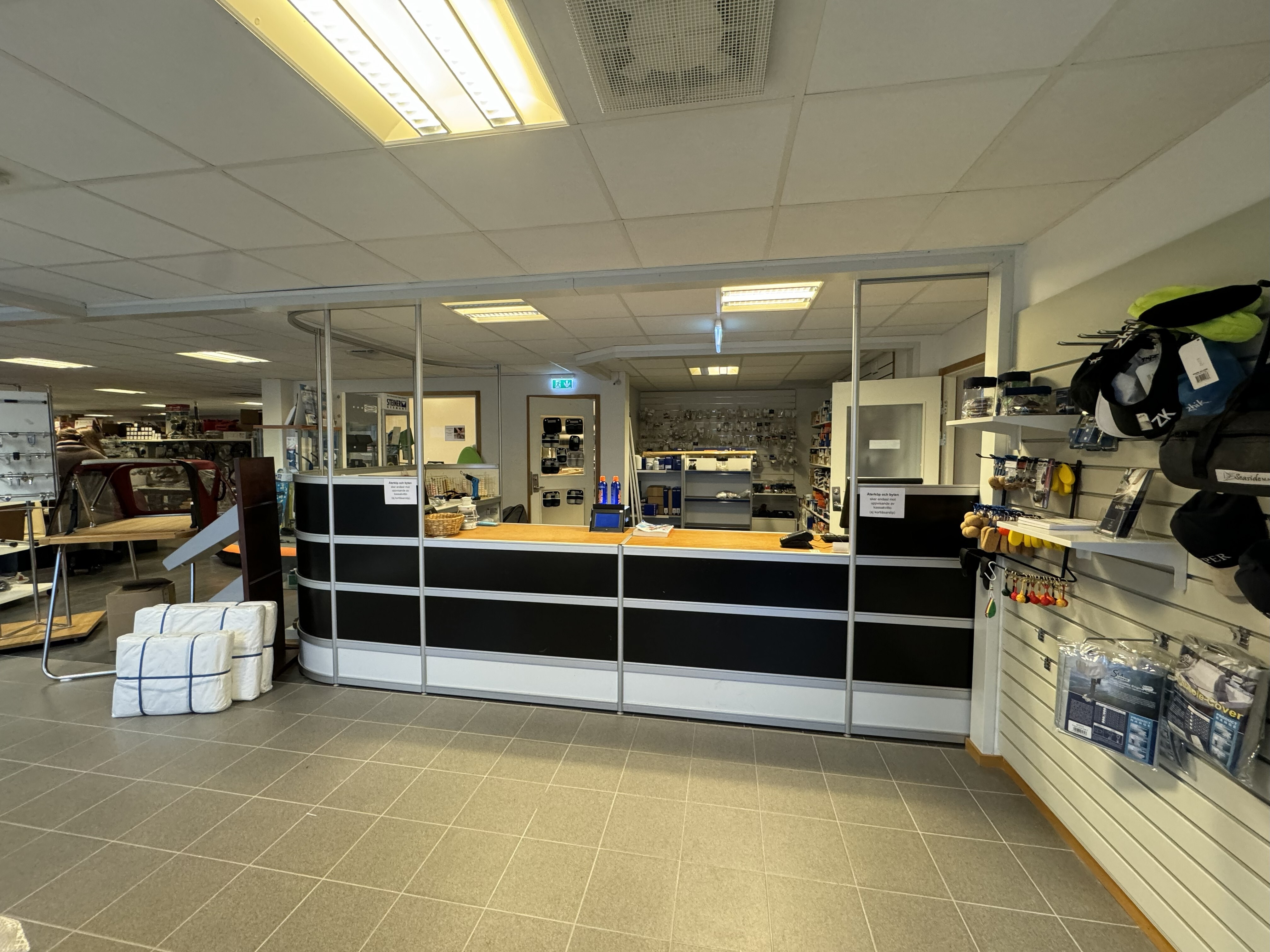 Butiksdelen är ljus och inbjudande med en stilren receptionsdisk och gott om plats för produktvisning. Här finns hyllor och bord för exponering, vilket skapar en tydlig och professionell kundmiljö.