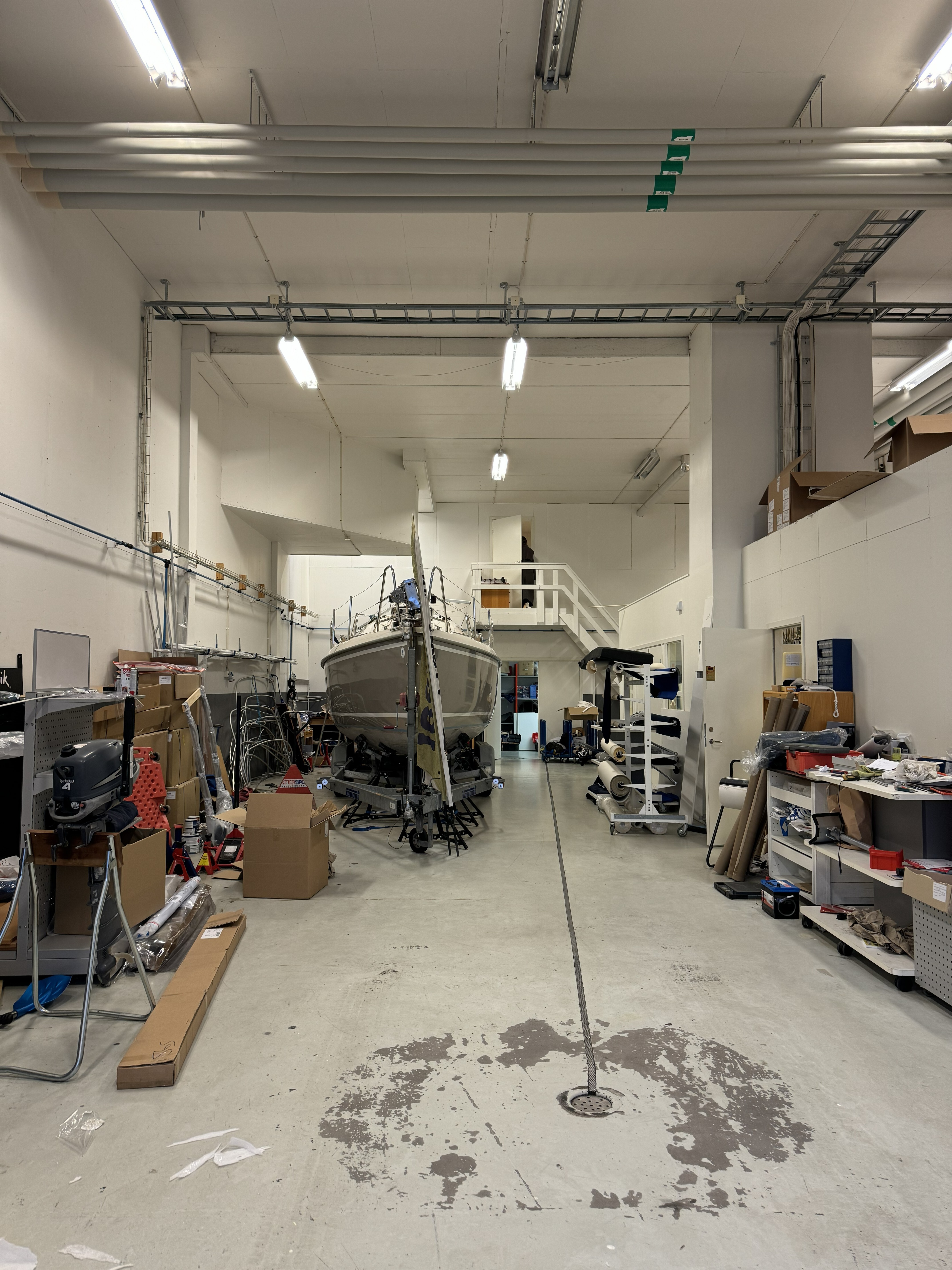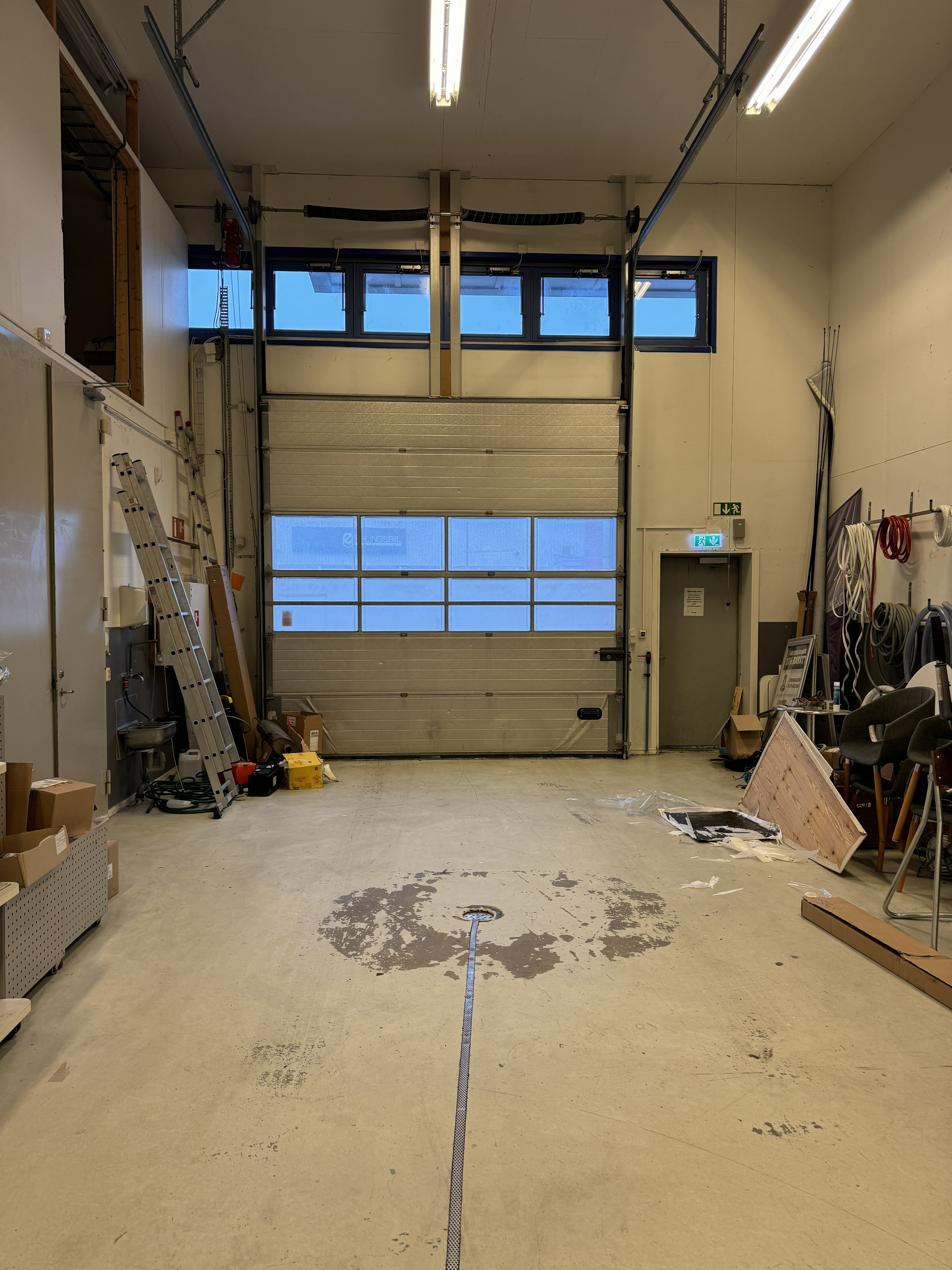 Lagerdelen är rymlig med generös takhöjd och stora portar som underlättar in- och utlastning. Här finns gott om förvaringsmöjligheter med hyllsystem och öppna ytor, samt ett separat arbetsrum med lång arbetsbänk – perfekt för montering, reparation eller packning.