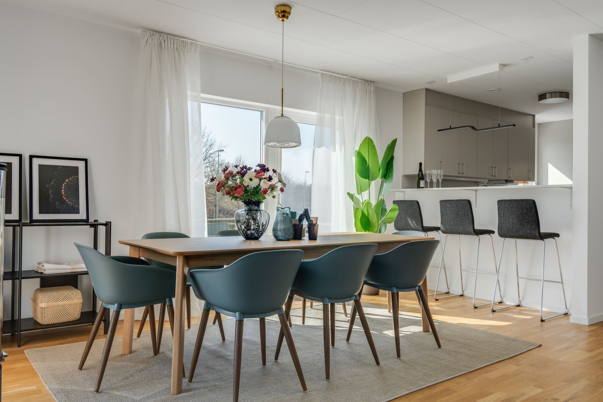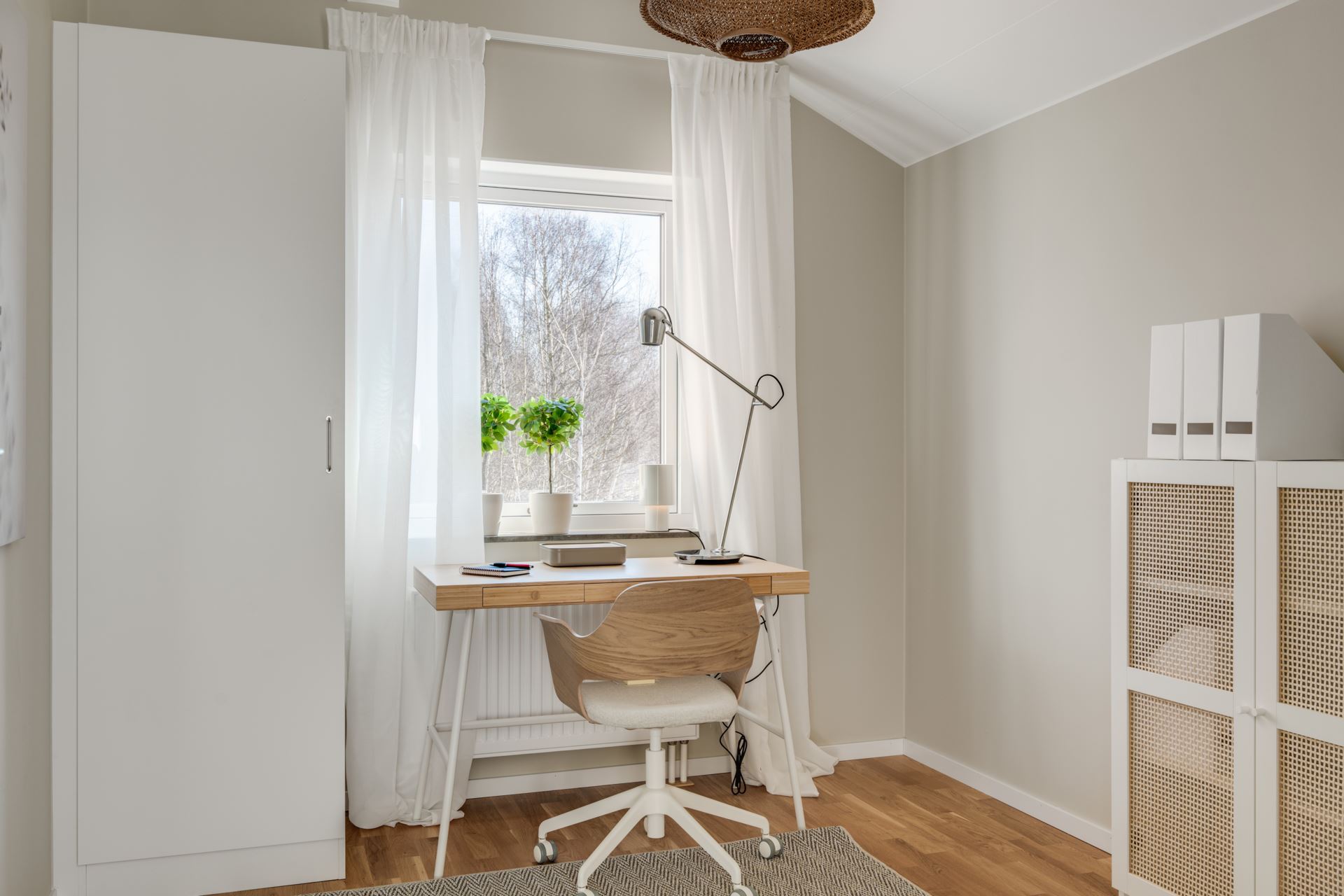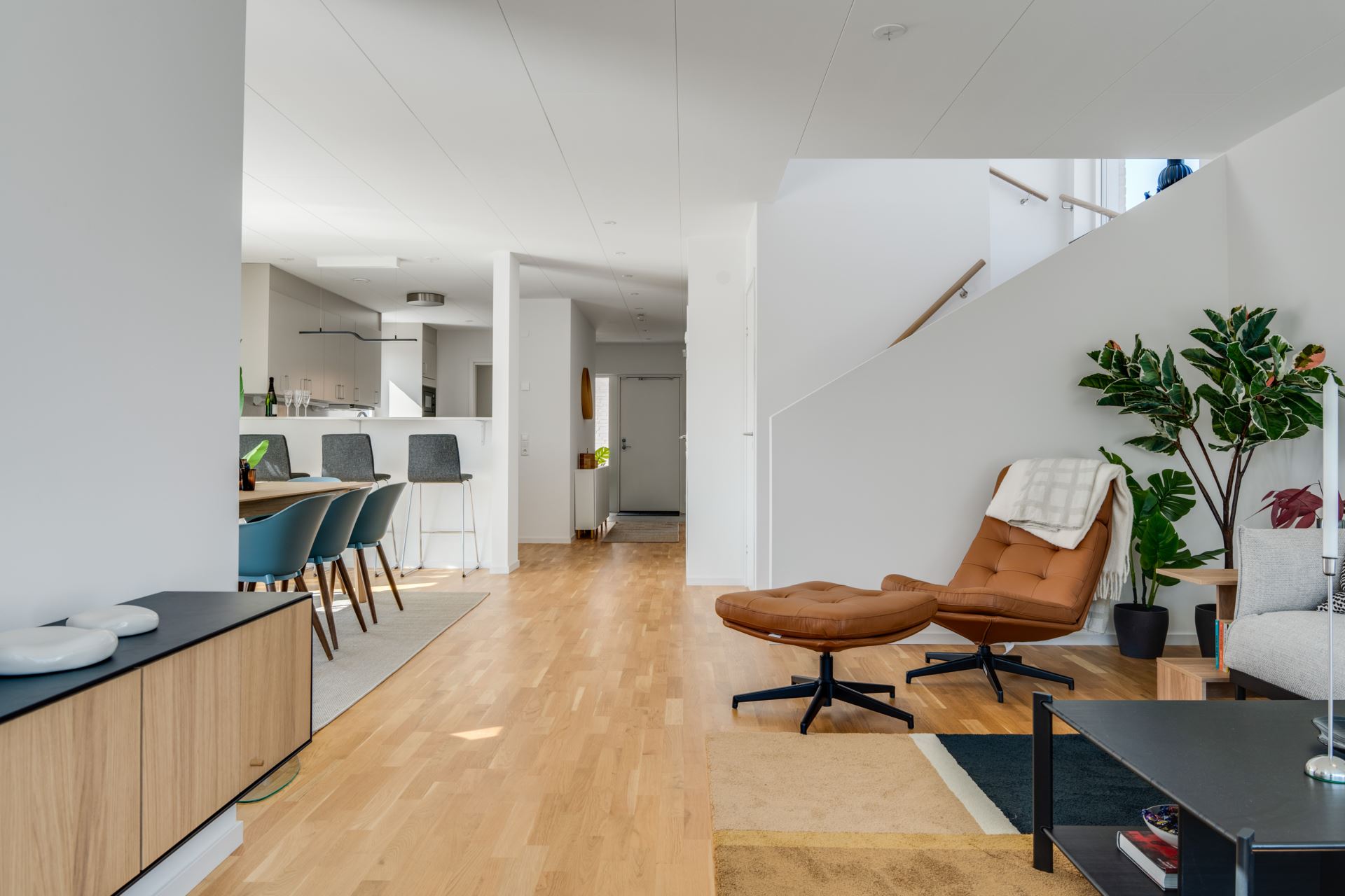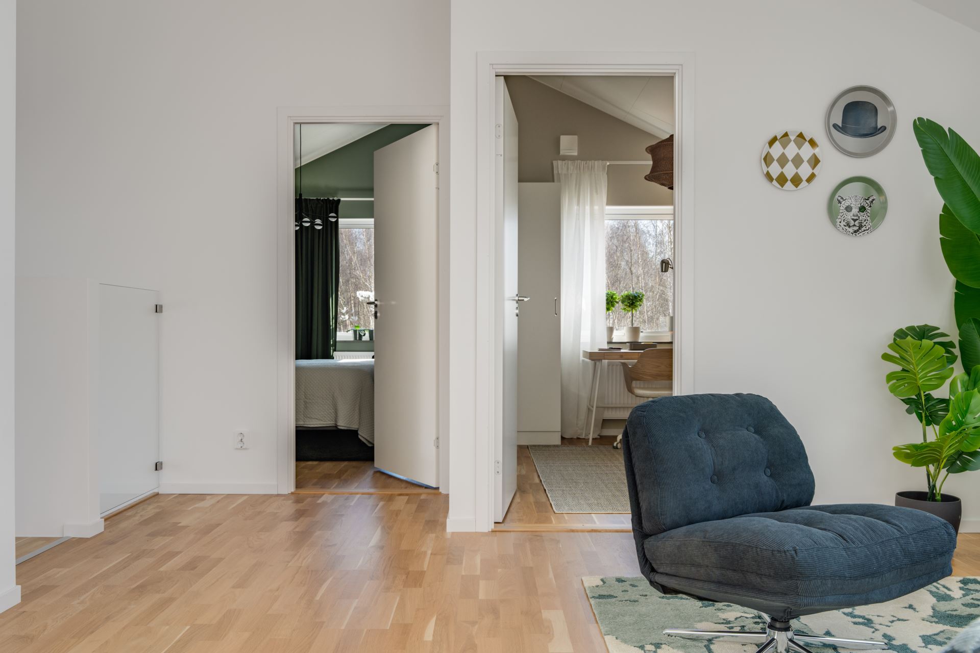 Via den skärmtaksskyddade entrén når du ditt hem. Inomhus skapas rymd och ljus med genomgående siktlinjer och stora, fina fönsterlösningar. Detta förstärks ytterligare genom att man rör sig mot fönster i passager. Kök, vardagsrum och matplats ligger i en öppen planlösning. Det finns två fullstora, helkaklade badrum, ett på vardera plan och bra förvaring i klädkammare och uteförråd. Alla rum på plan två har också full volym upp till yttertakets lutning. Öppet samband mellan inne- och utemiljö skapar ett modernt och karaktärsfullt intryck.