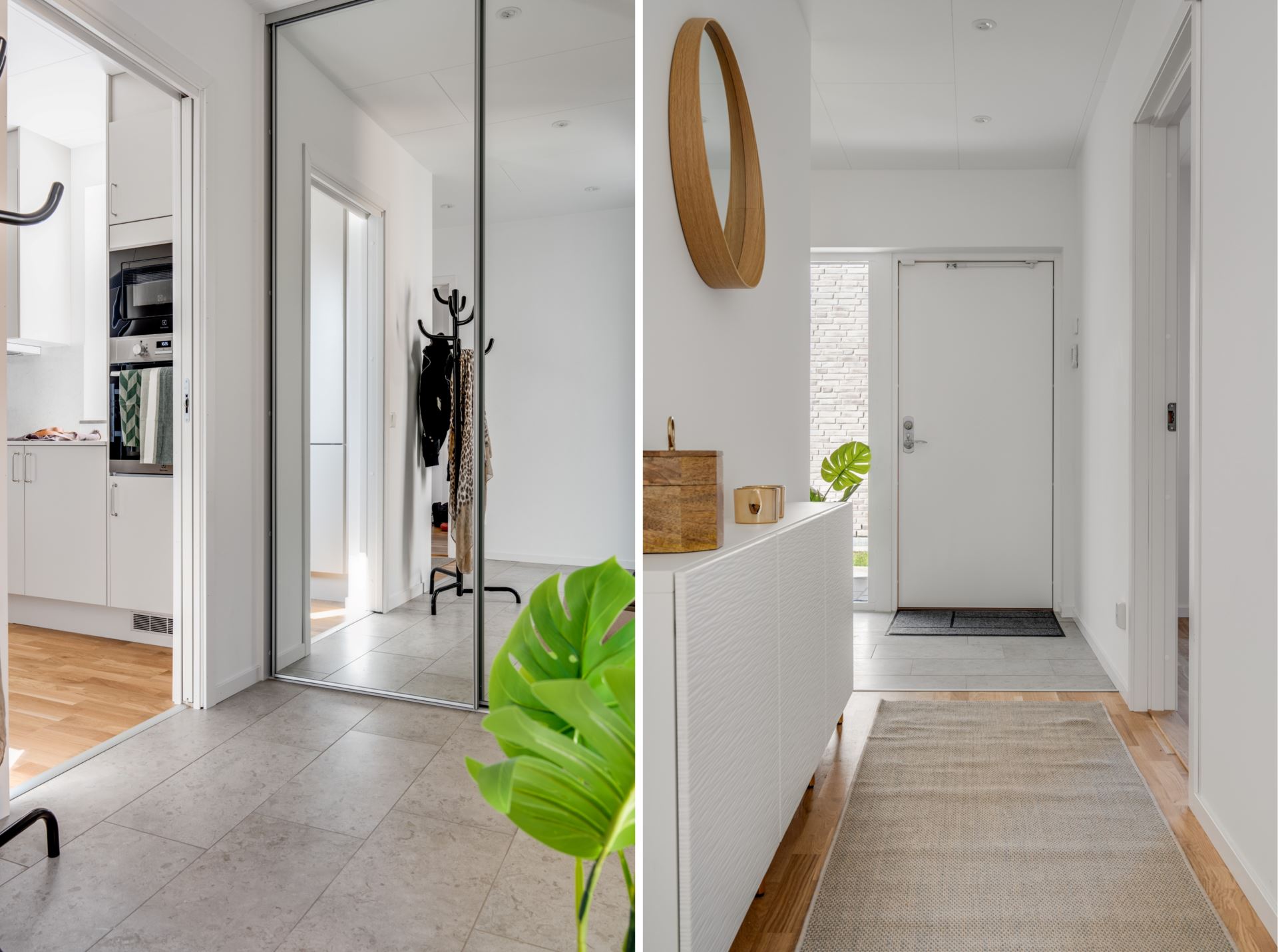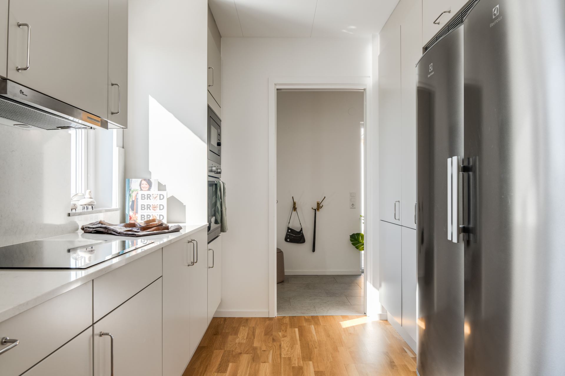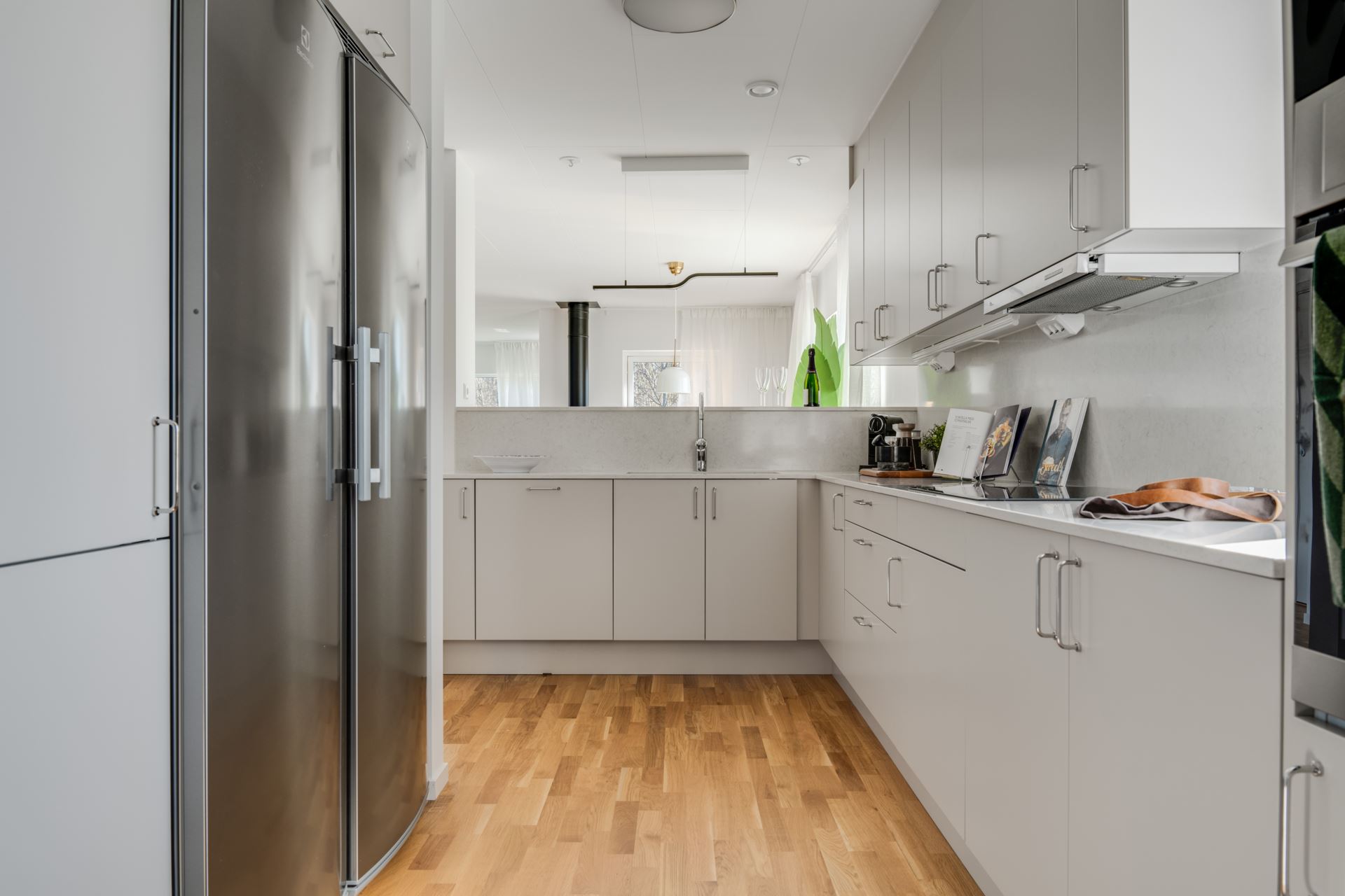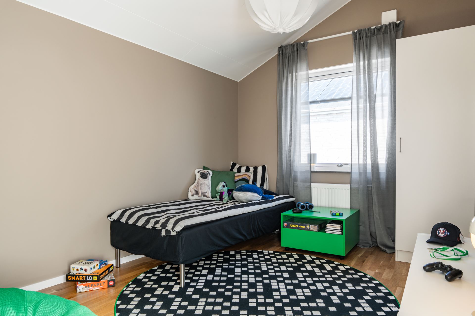 Via den skärmtaksskyddade entrén når du ditt hem. Inomhus skapas rymd och ljus med genomgående siktlinjer och stora, fina fönsterlösningar. Detta förstärks ytterligare genom att man rör sig mot fönster i passager. Kök, vardagsrum och matplats ligger i en öppen planlösning. Det finns två fullstora, helkaklade badrum, ett på vardera plan och bra förvaring i klädkammare och uteförråd. Alla rum på plan två har också full volym upp till yttertakets lutning. Öppet samband mellan inne- och utemiljö skapar ett modernt och karaktärsfullt intryck.