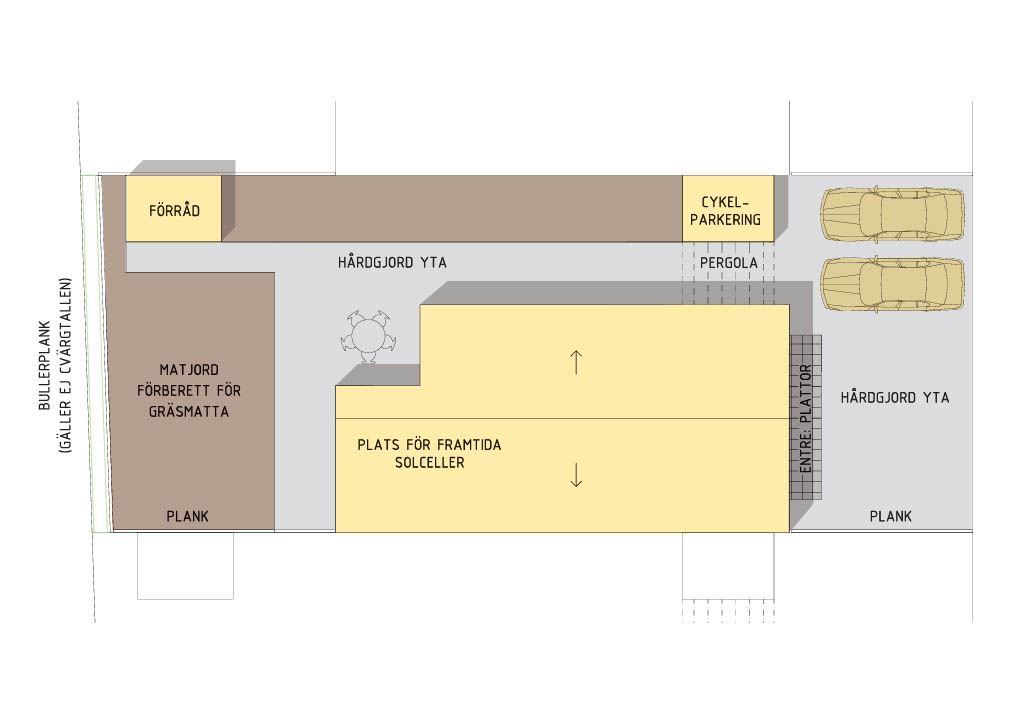 Tomten förbereds med matjord för gräsmatta och hårdgjorda ytor. Se tomtplan för specifikation.
