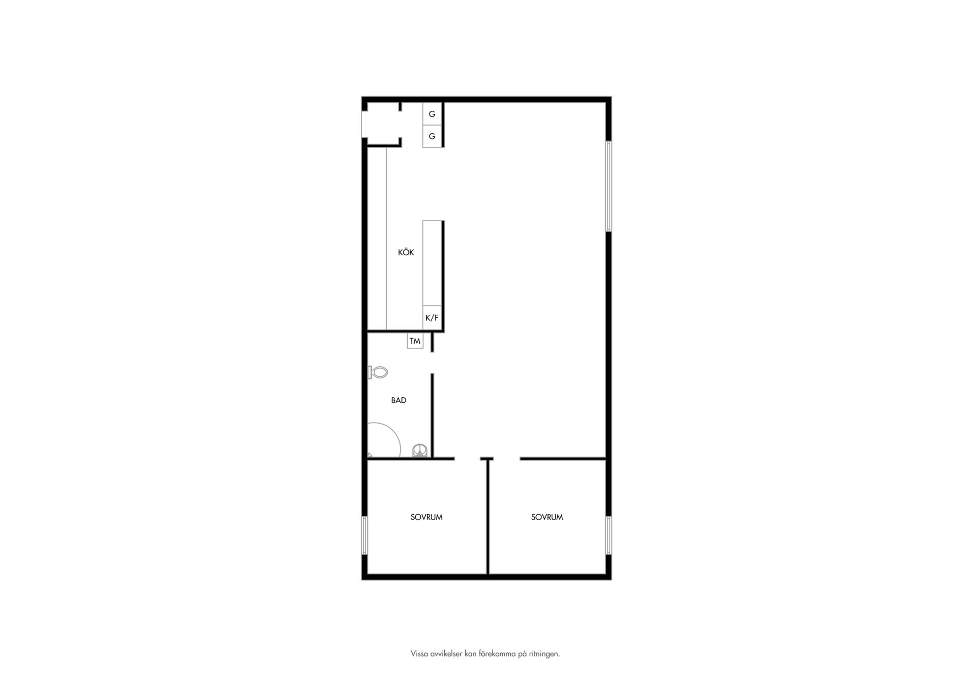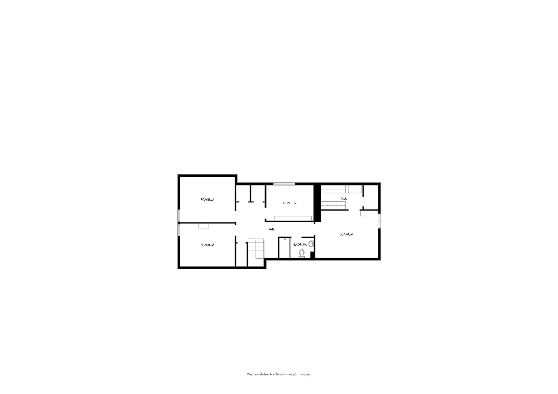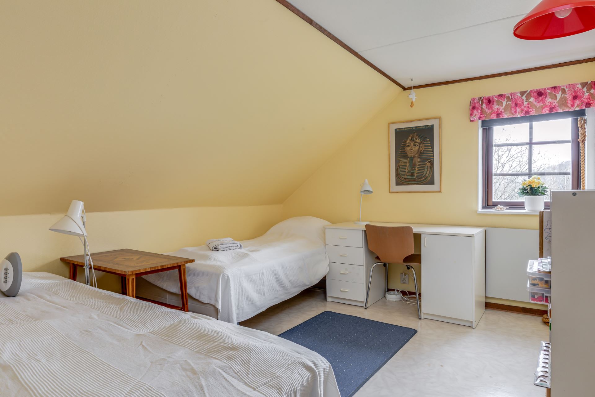 Inreddes 1980 med fyra sovrum och ett duschrum. Tapet och plastmatta på golven.
