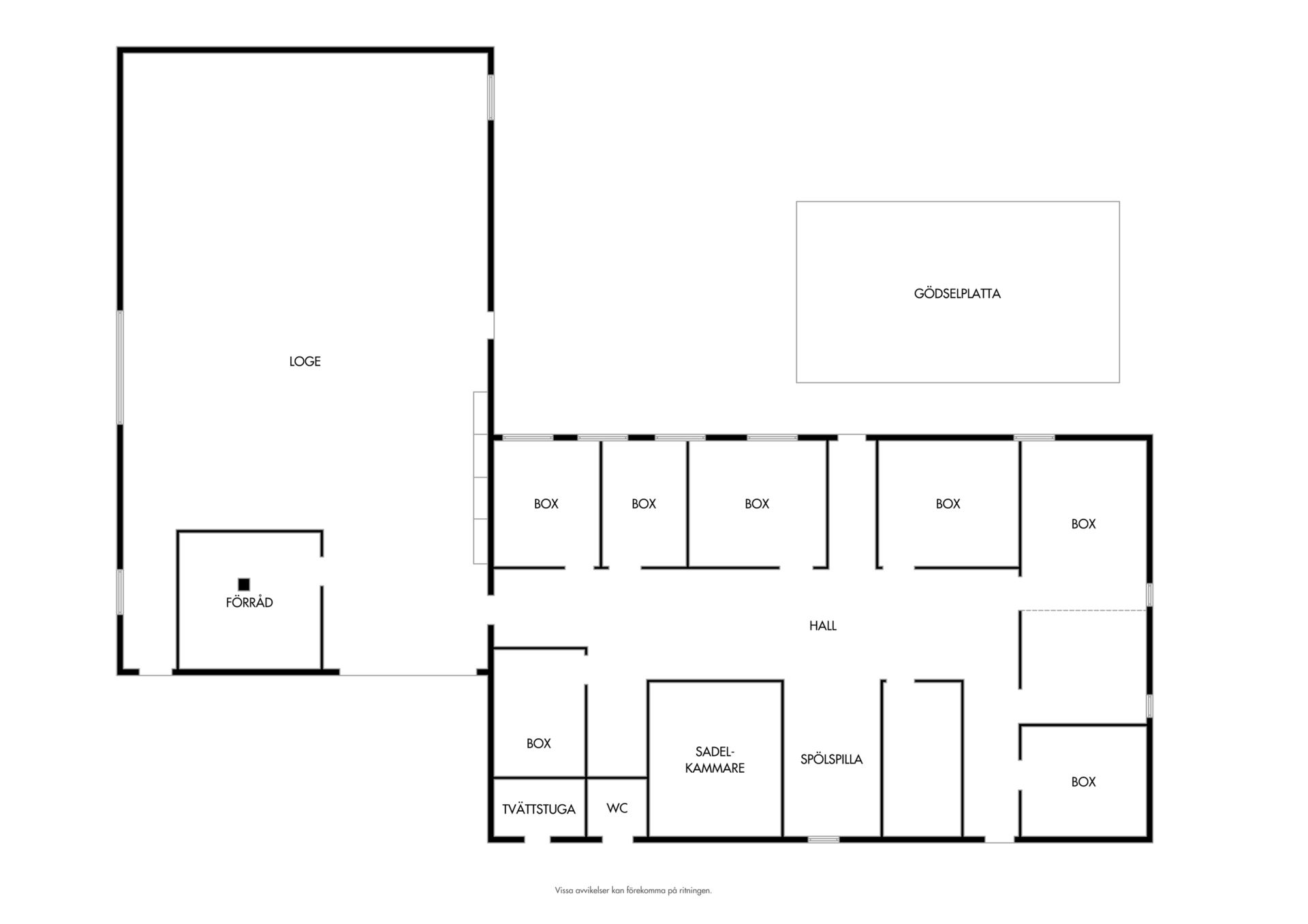 STALL - 8 boxar ( idag 7 boxar med en stor fölbox ). Varierande storlek från ca 9-14 kvm. Sadelkammare, foderkammare, wc och tvättmaskin. Uppställningsplats. LOGE - stor plats för foderhantering, strö och täckestork. RIDHUS 30 x 16 med sand. UTEBANA belyst 20 x 50 (HINDERPARK INGÅR) LÄGENHET 1 - ca 60 kvm byggd 2006 med kök öppet till allrum, två sovrum. Badrum med dusch och toalett samt tvättmaskin. El uppvärmt med luft/luft värmepump. LÄGENHET 2 - ca 50 kvm fristående byggd 2015. Kök och allrum, två sovrum. Badrum med dusch och tvättmaskin. El uppvärmt med luft/luftvärmepump. FÖRRÅD - inrymms i logen och nås från utsidan av byggnaden. CARPORT - med plats för två bilar i anslutning till boningshuset. PANNRUM/VERKSTAD - separat vitputsad byggnad som ligger i trädgården bredvid boningshuset. Här finns gott om utrymme för att snickra och separat pannrum för värmepumpsanläggningen. Här finns även poolrengöring och uppvärmningssystem via värmepumpen. GÖDSEL - gjuten betongplatta, godkänd.