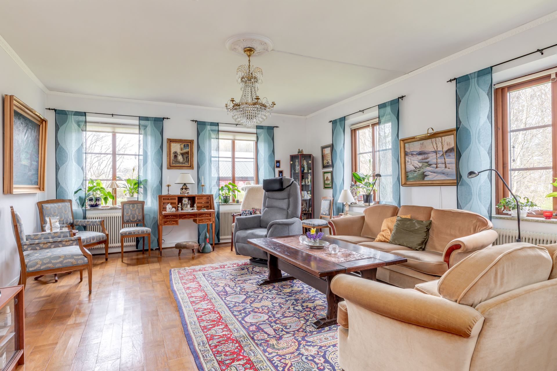 Ett rum för stora sällskap med härligt ljusinsläpp och fin takrymd. Vackra takrosetter pryder taket. Ljusa väggar och ekparkett.