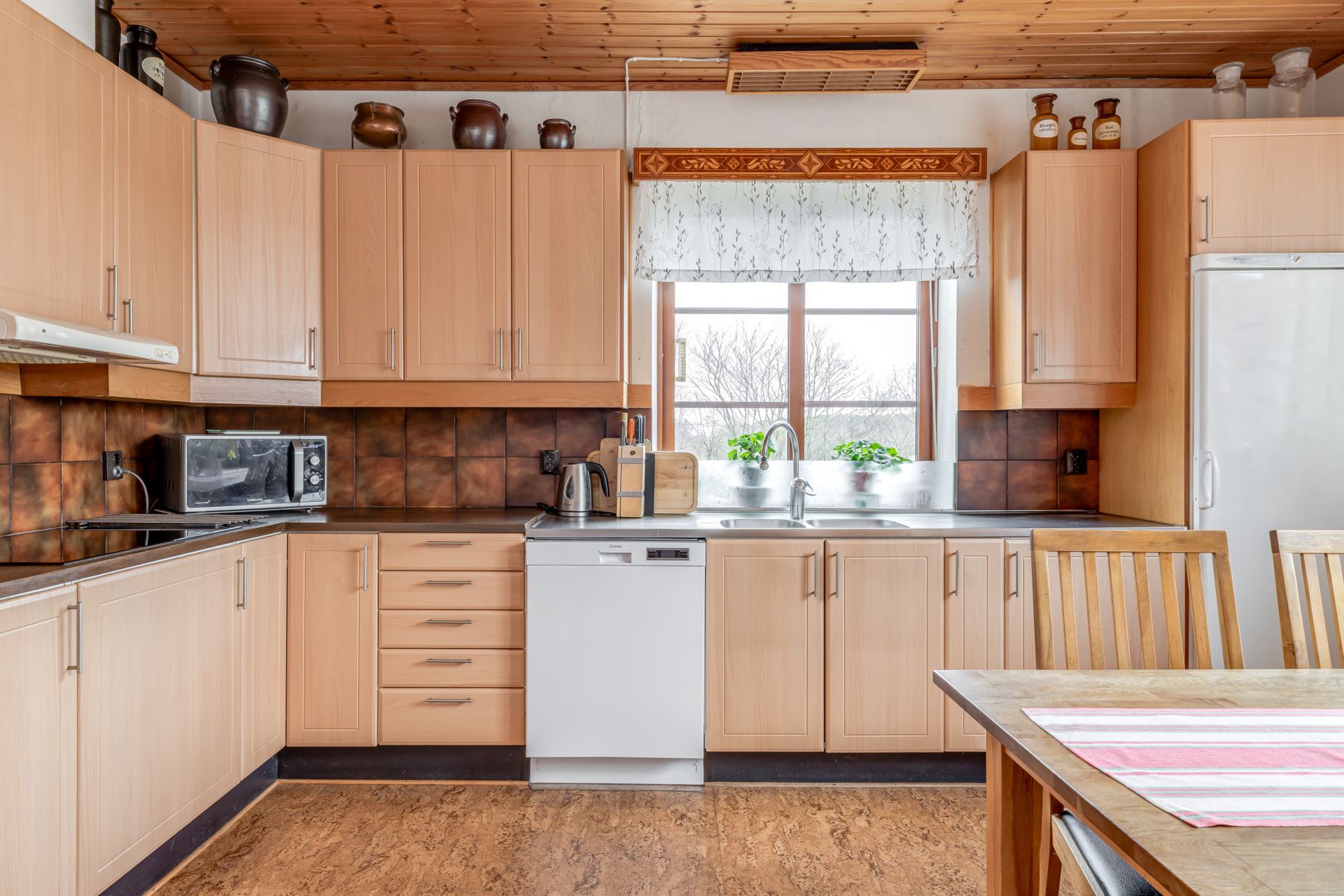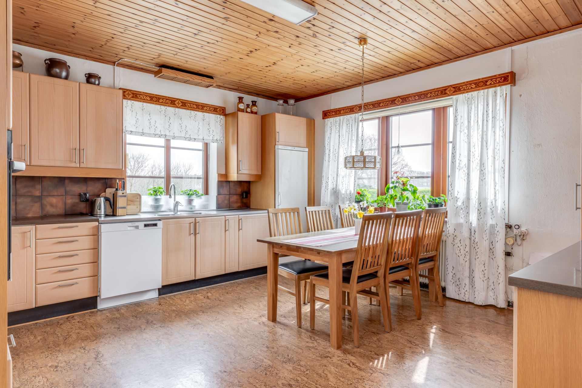 Köket gjordes om helt nytt 1981. Gott om förvaring i köksskåp och vitrinskåp. Spishäll, fläkt, inbyggnadsugn och micro, diskmaskin och kylskåp. Ljusa väggar och plastmatta på golvet. ( under till finns parkett).