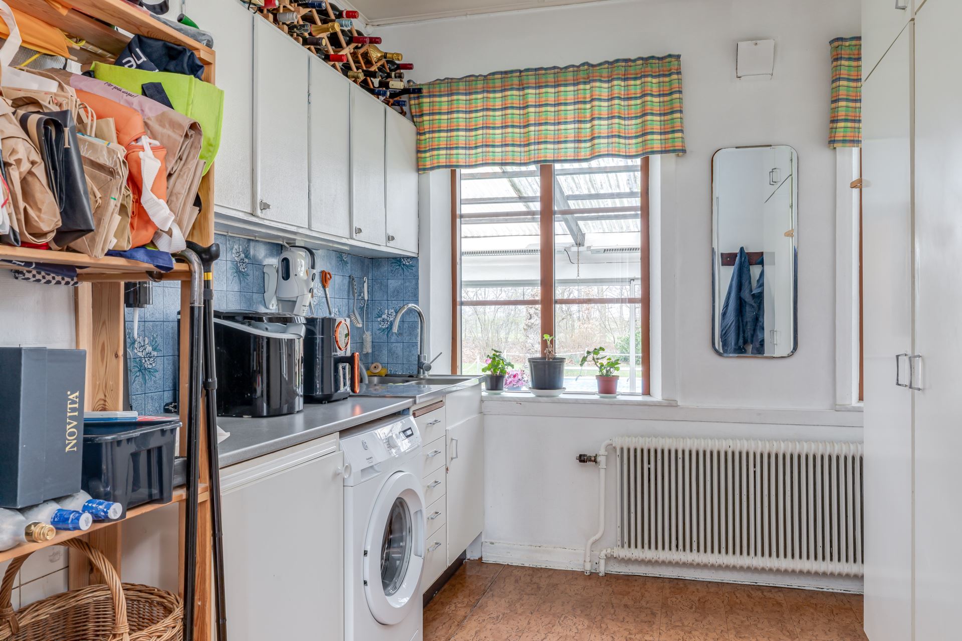 Mycket bra utrymme för förberedelse och tvätt. Här finns tvättmaskin, kylskåp och frys. Utgång på gaveln av huset och nedgång till källaren.
