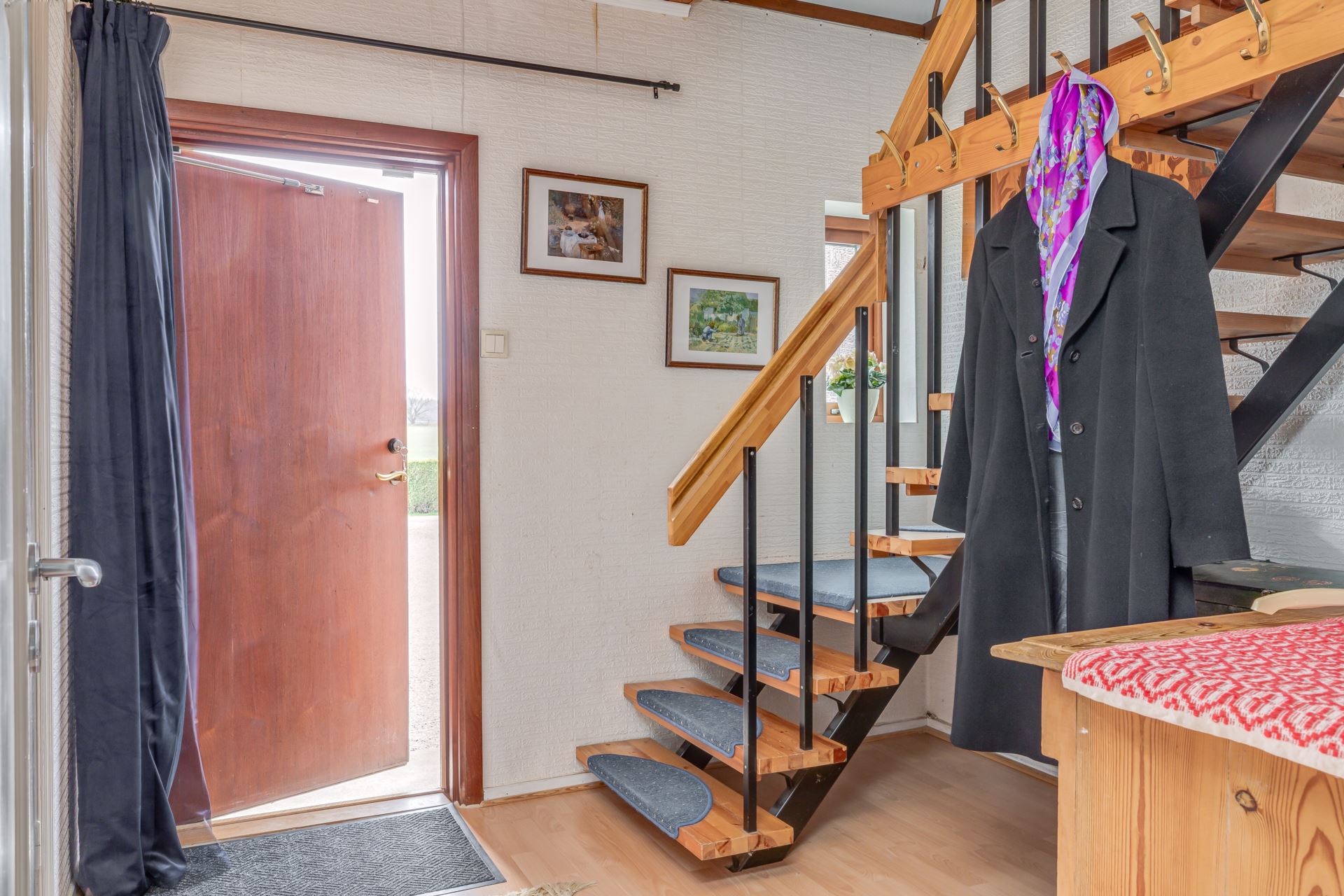 Välkomnande entré med goda avhängningsmöjligheter. Vit tapet och trälaminatgolv.