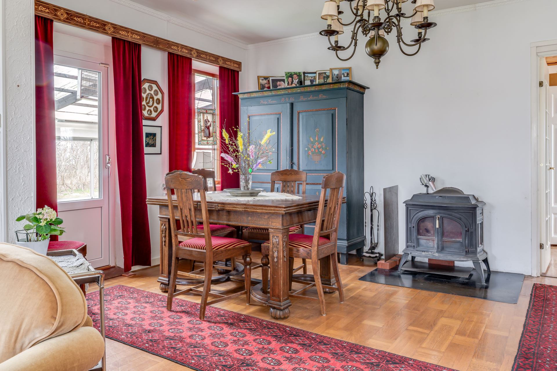 I anslutning till vardagsrum så ligger matrum med ekparkett och ljusa väggar. Utgång till fint inglasat uterum i anslutning till poolområdet.